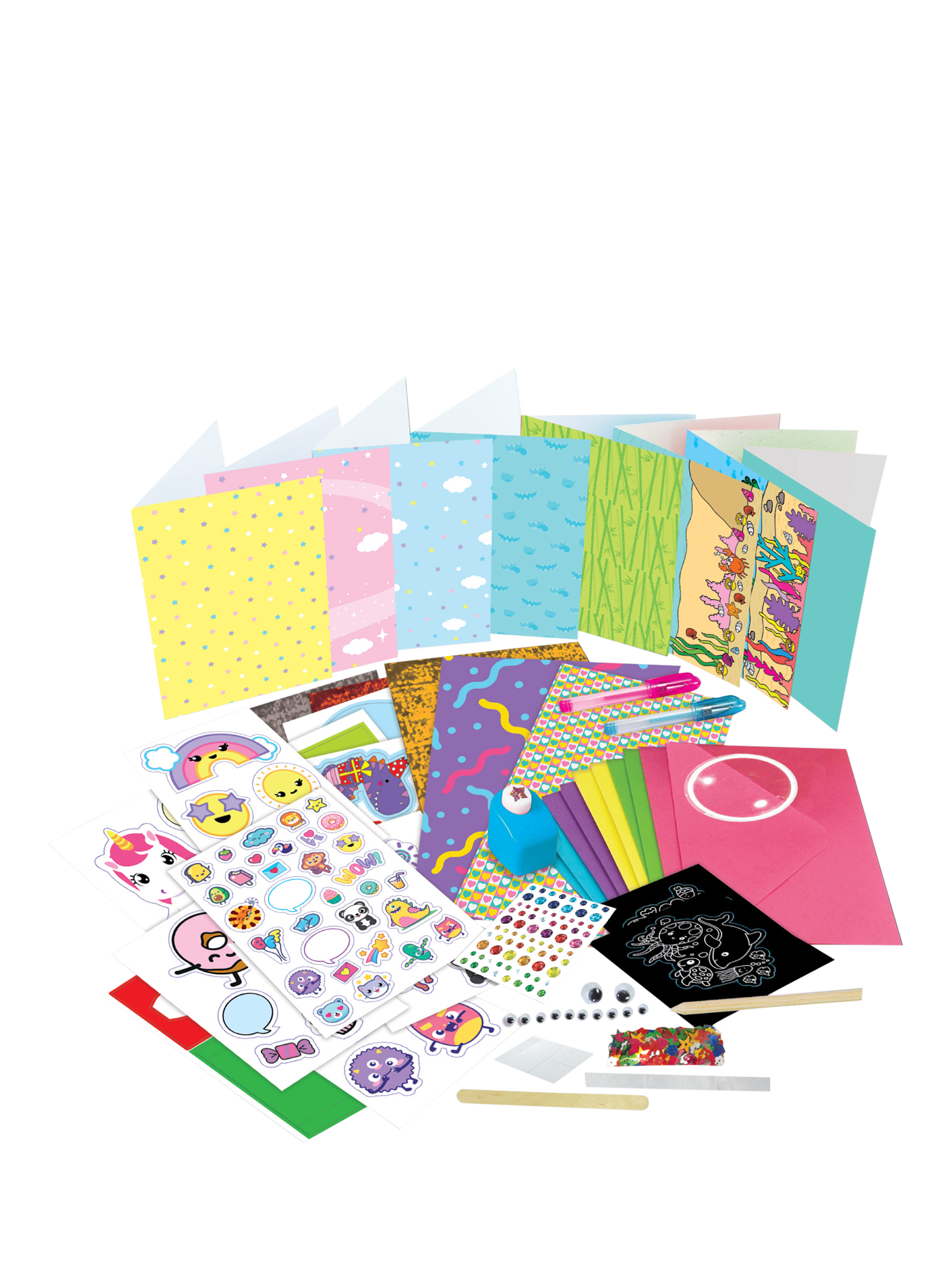 A creative set that includes materials for designing 10 unique cards. This kit encourages artistic expression and personalisation, making it an excellent fit for crafting and stationery collections.