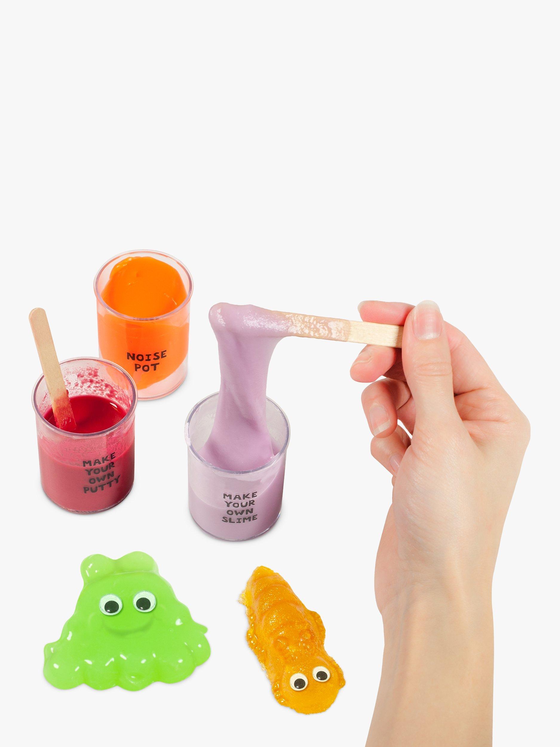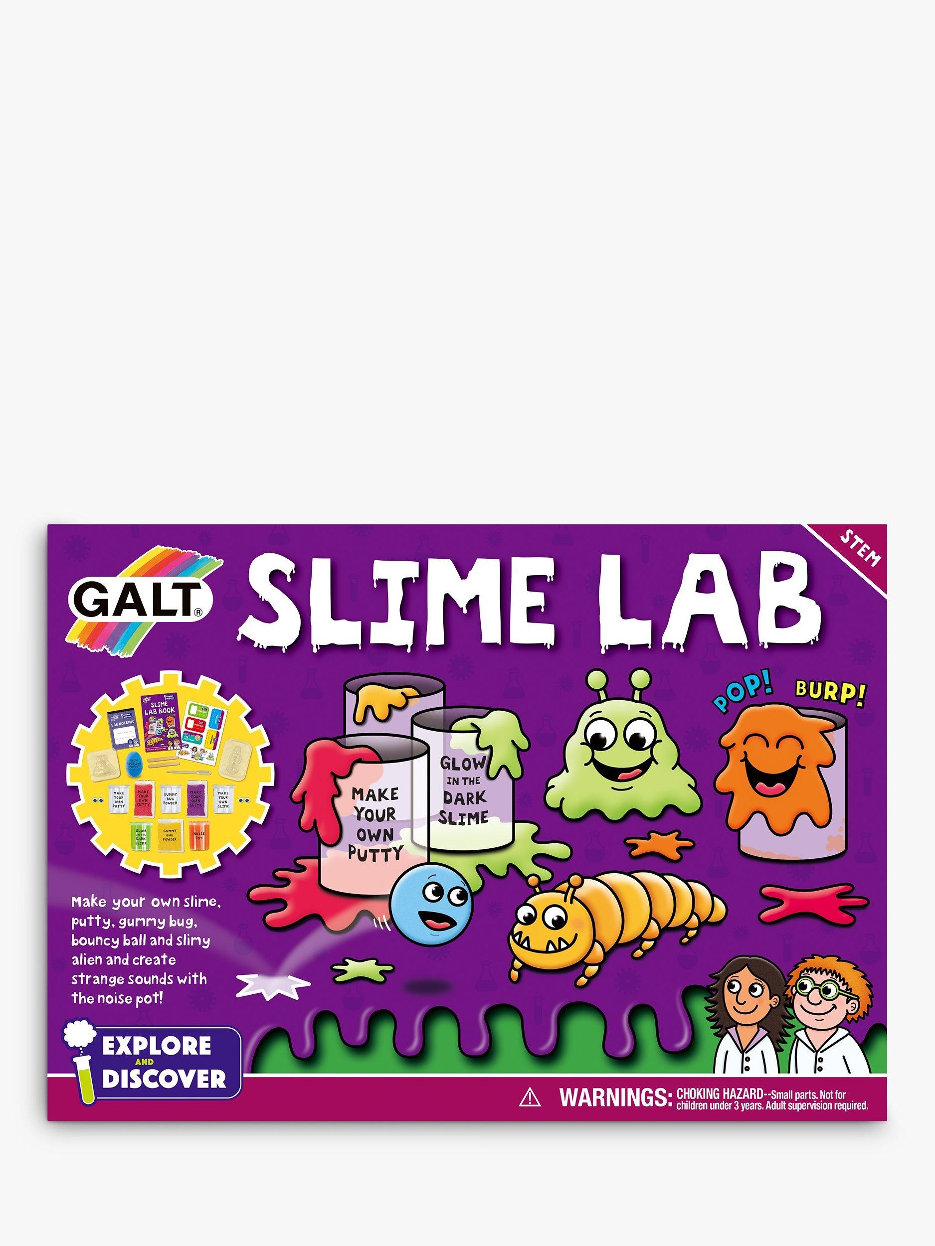 Create your own glow-in-the-dark slimy alien, bouncy putty ball and gummy bug! Test the different slimes, make your own tubs of goo and try out the funny noise pot! The GALT Slime Lab set includes 7 fun experiments.