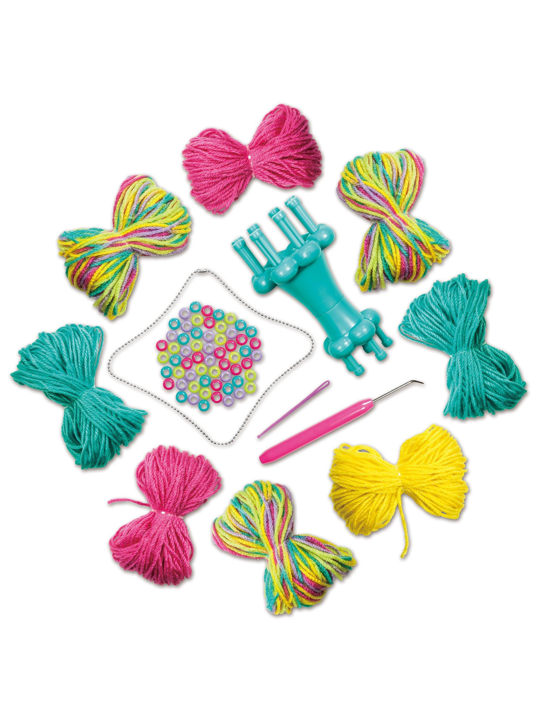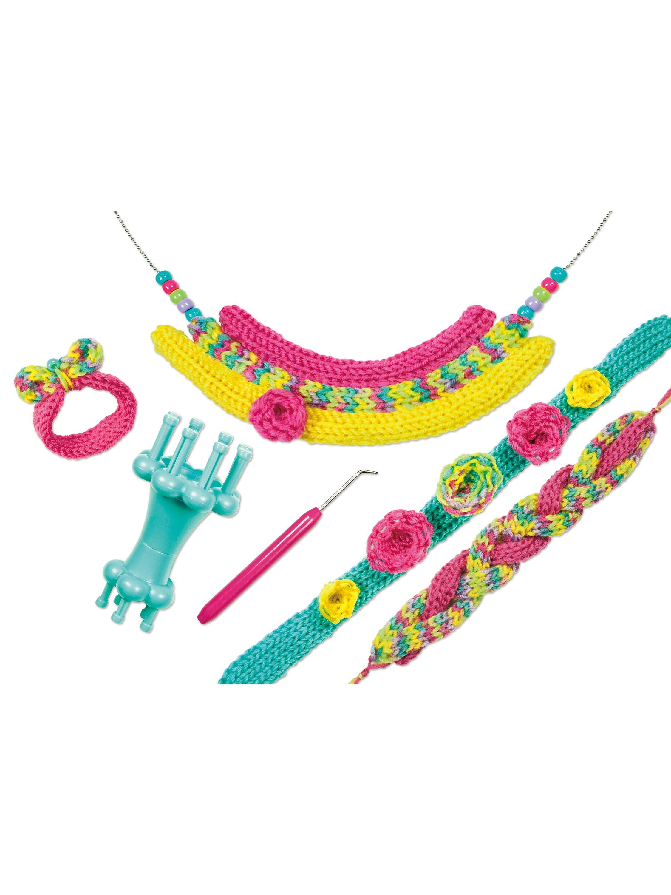 Use the easy step-by-step guide and the included knitting tools to create a beautiful beaded necklace, or a pretty plaited headband and more!