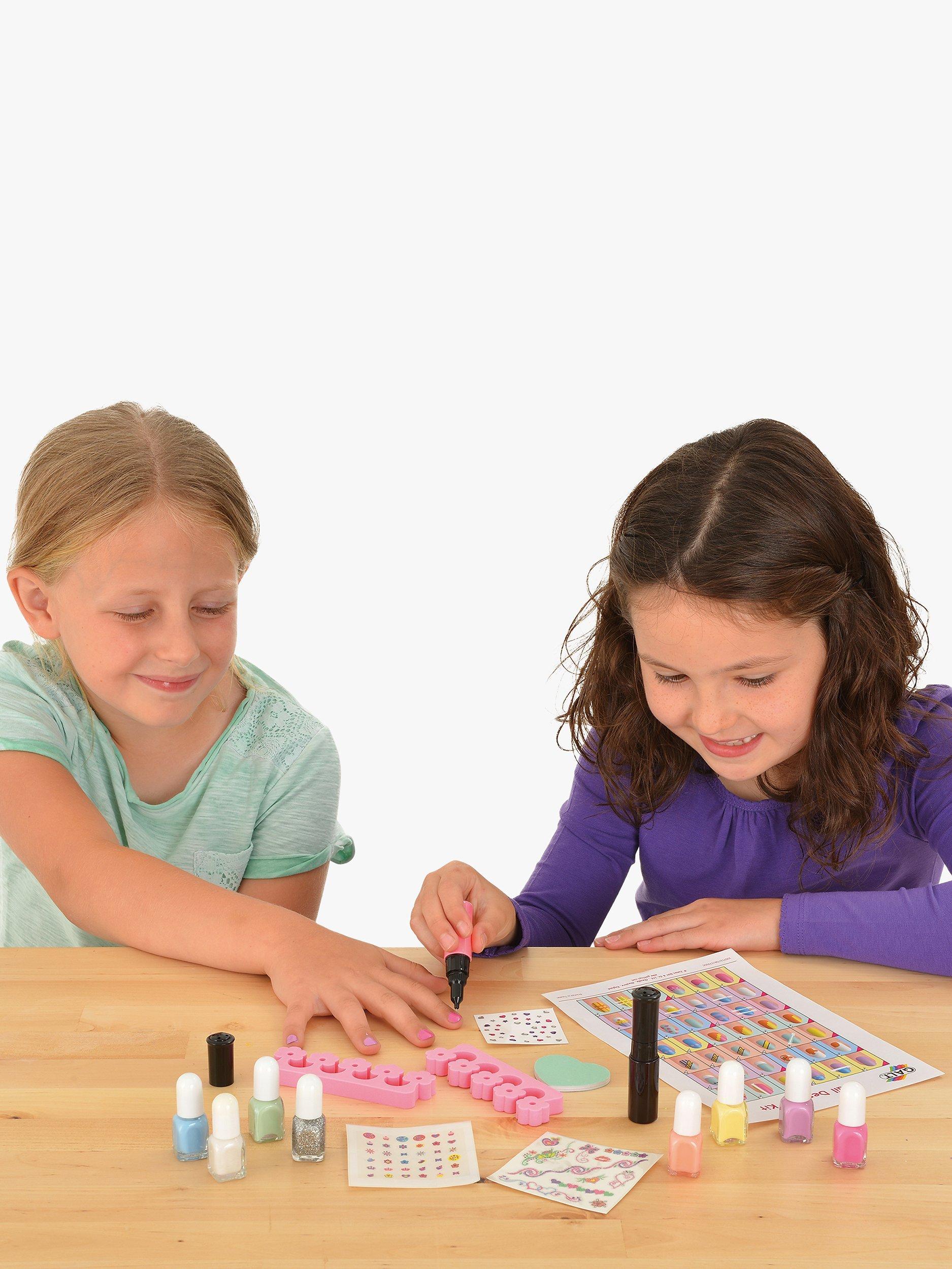 An exciting collection of seven colours to varnish your nails and two nail pens to create amazing designs. Decorate with nail stickers, glitter varnish and gems. Ideal for parties or sleepovers.