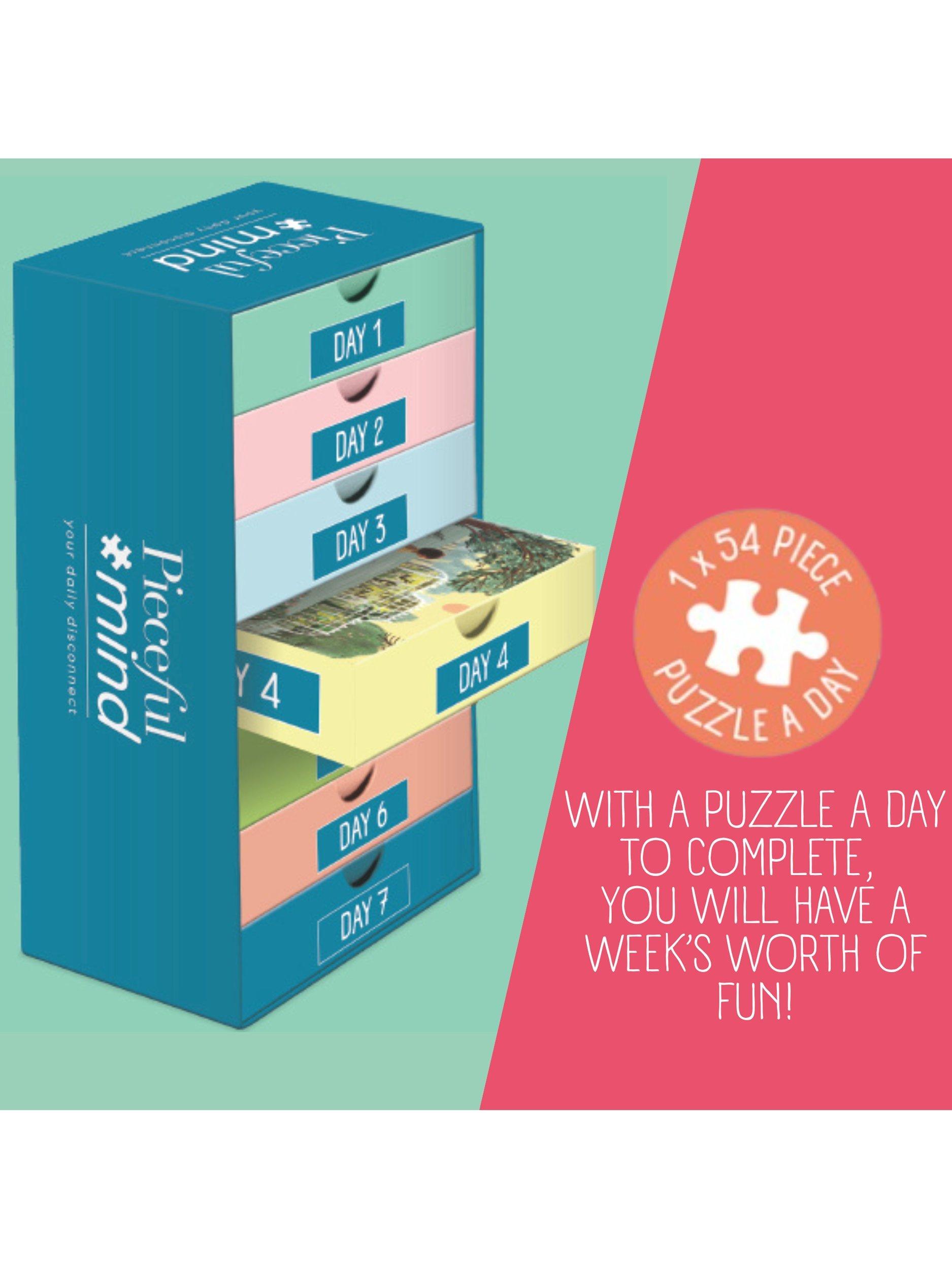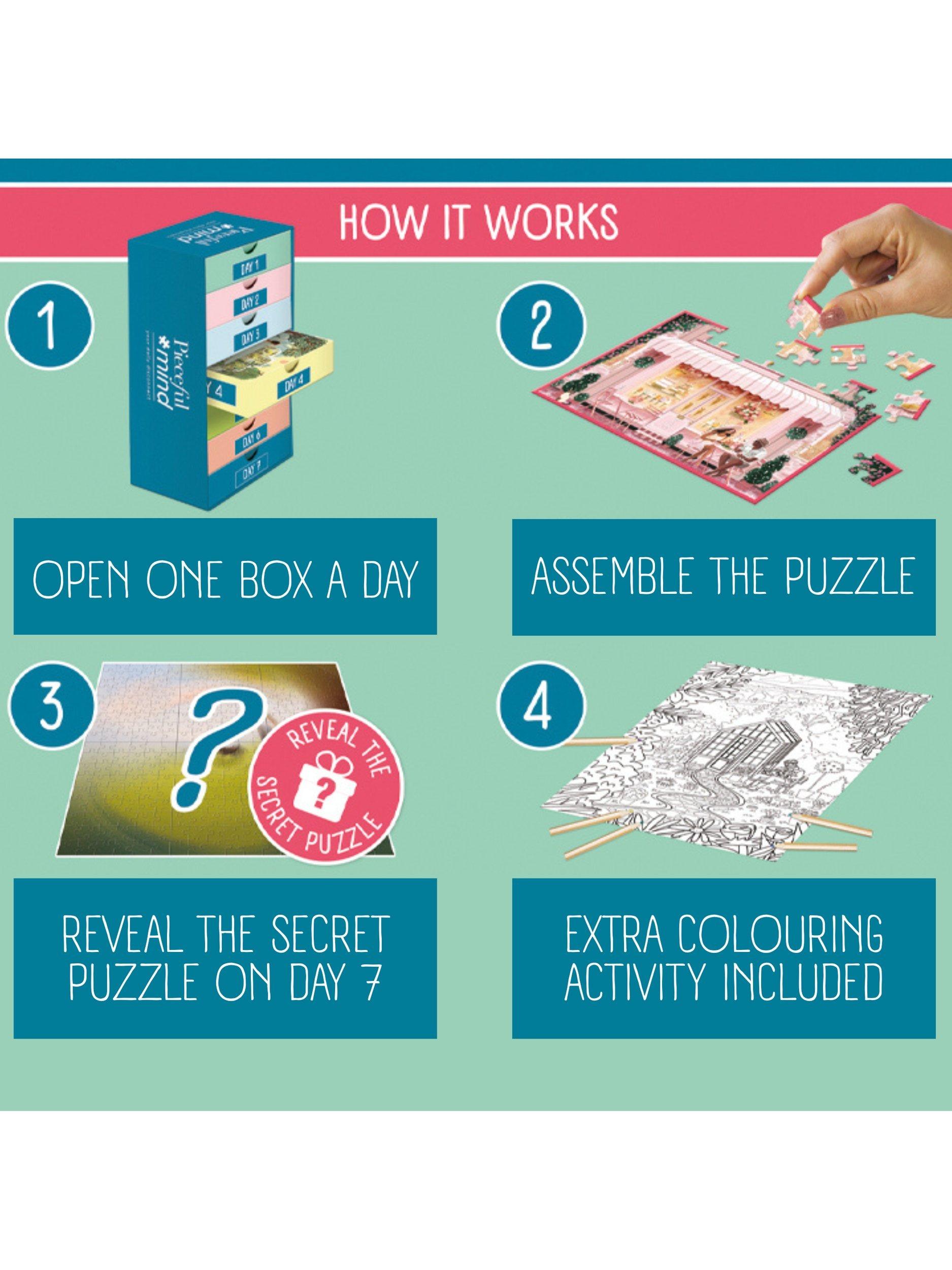 Relax and enjoy peaceful moments with puzzles designed to calm and inspire. Take time to disconnect, focus, and reconnect with positivity and a sense of achievement. Puzzling can lower stress, improve concentration, and boost your mood. Open one box a day, complete the puzzle and on the final day, enjoy a surprise puzzle reveal, a mindful exercise, and a relaxing colouring activity.