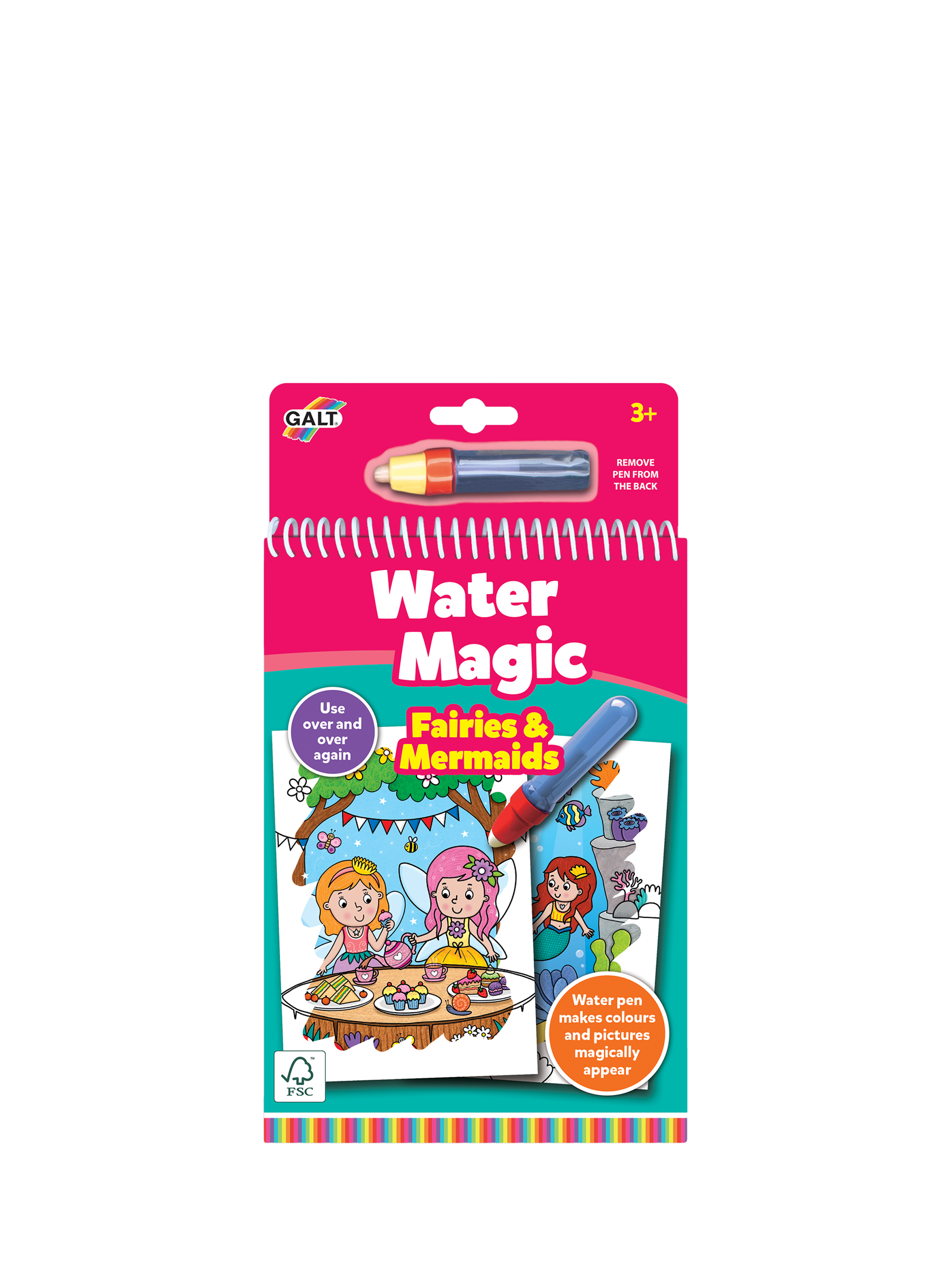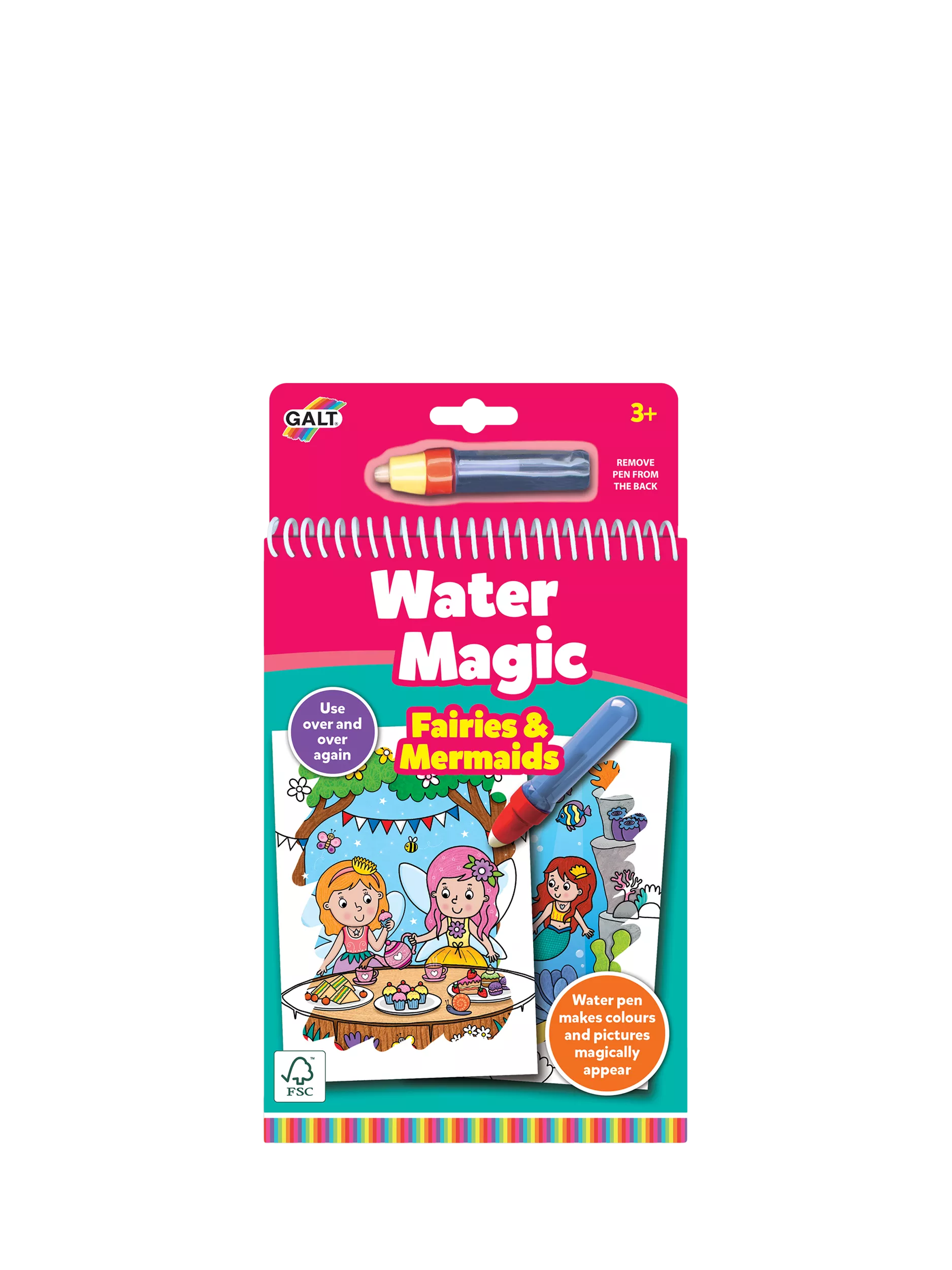 A chunky spiral book with 6 reusable pictures on thick board to colour with the water pen. Fill the pen with water and use to reveal the hidden coloured pictures. The boards are white with black Picture outlines. When wet, the coloured picture appears... Then disappears when dry. This chunky board book with mess-free colouring is ideal when travelling.