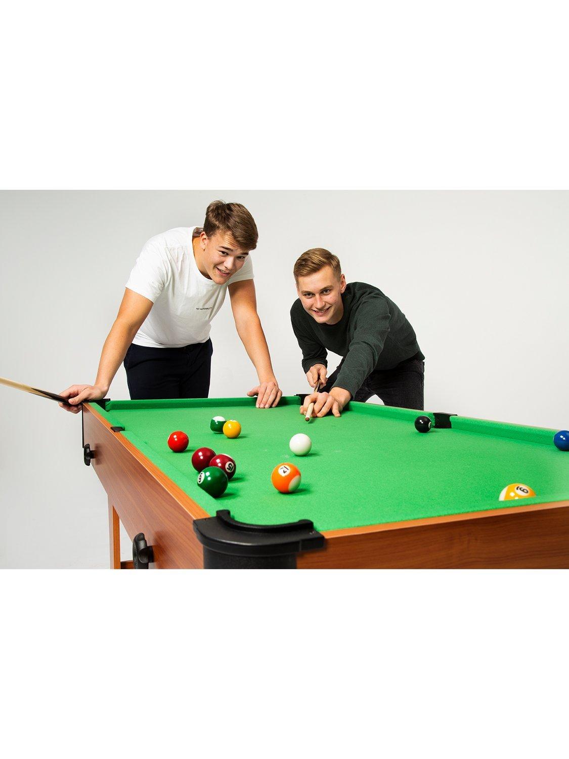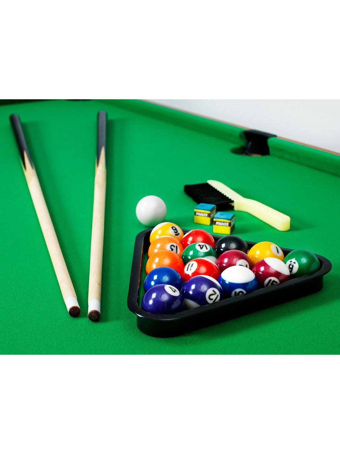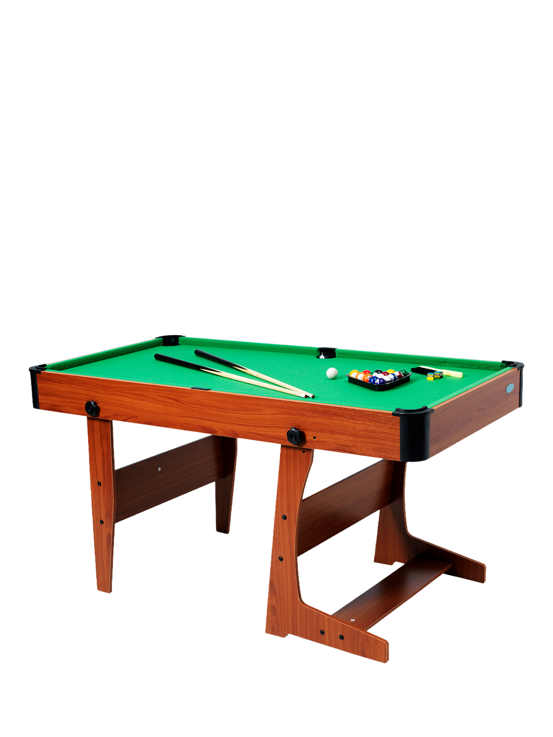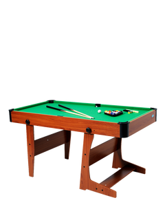 Gamesson's Eton pool table folds for easy upright storage, and comes with all you need to shoot some pool. The four-foot-six-inch table has typical rounded corners, and comes with a 38mm numbered ball set, two 92cm pool cues, a triangle, two pieces of chalk and a brush. Your break!