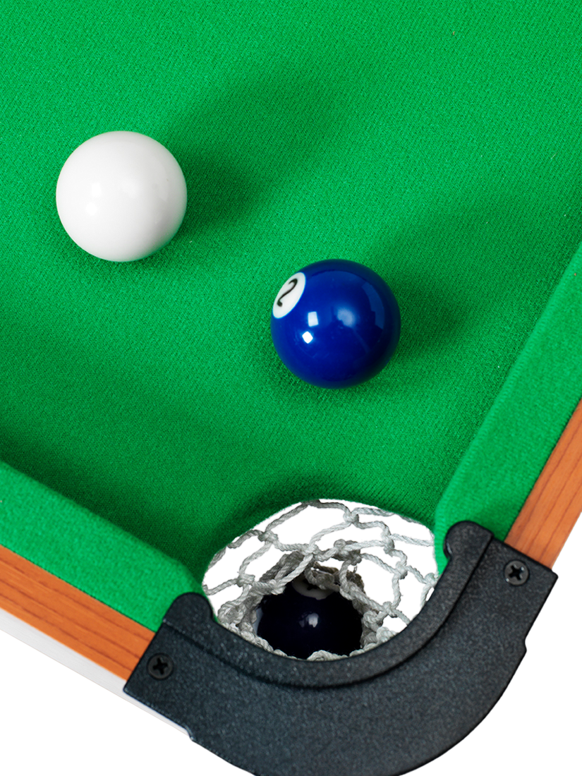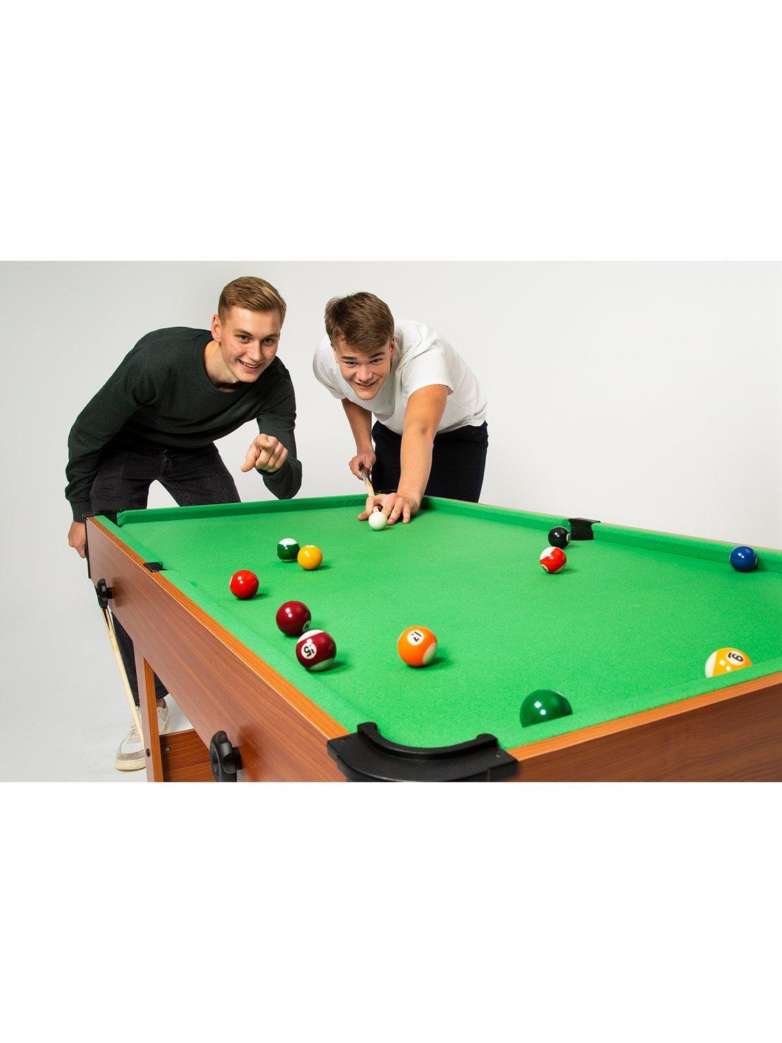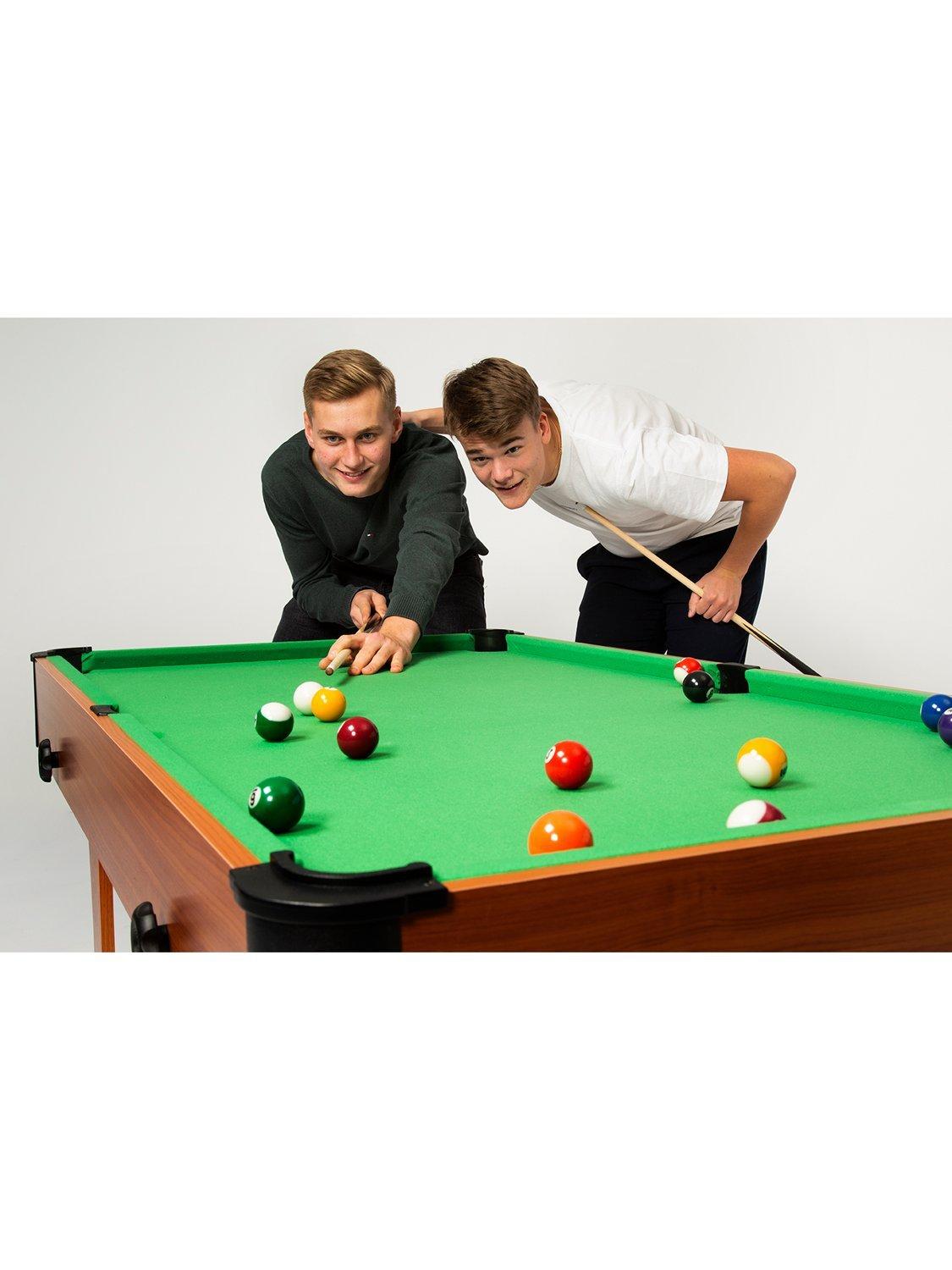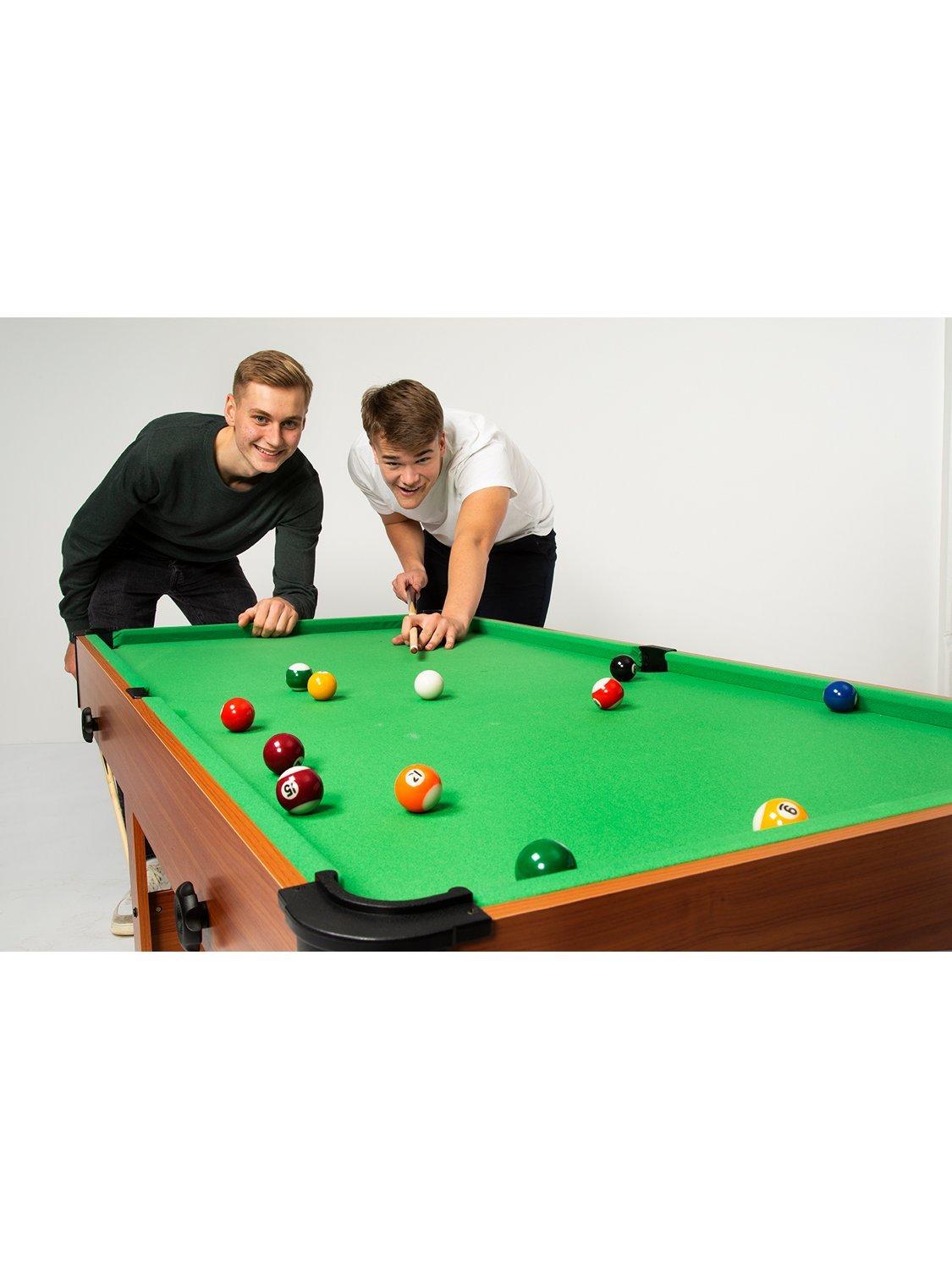 Gamesson's Eton pool table folds for easy upright storage, and comes with all you need to shoot some pool. The four-foot-six-inch table has typical rounded corners, and comes with a 38mm numbered ball set, two 92cm pool cues, a triangle, two pieces of chalk and a brush. Your break!