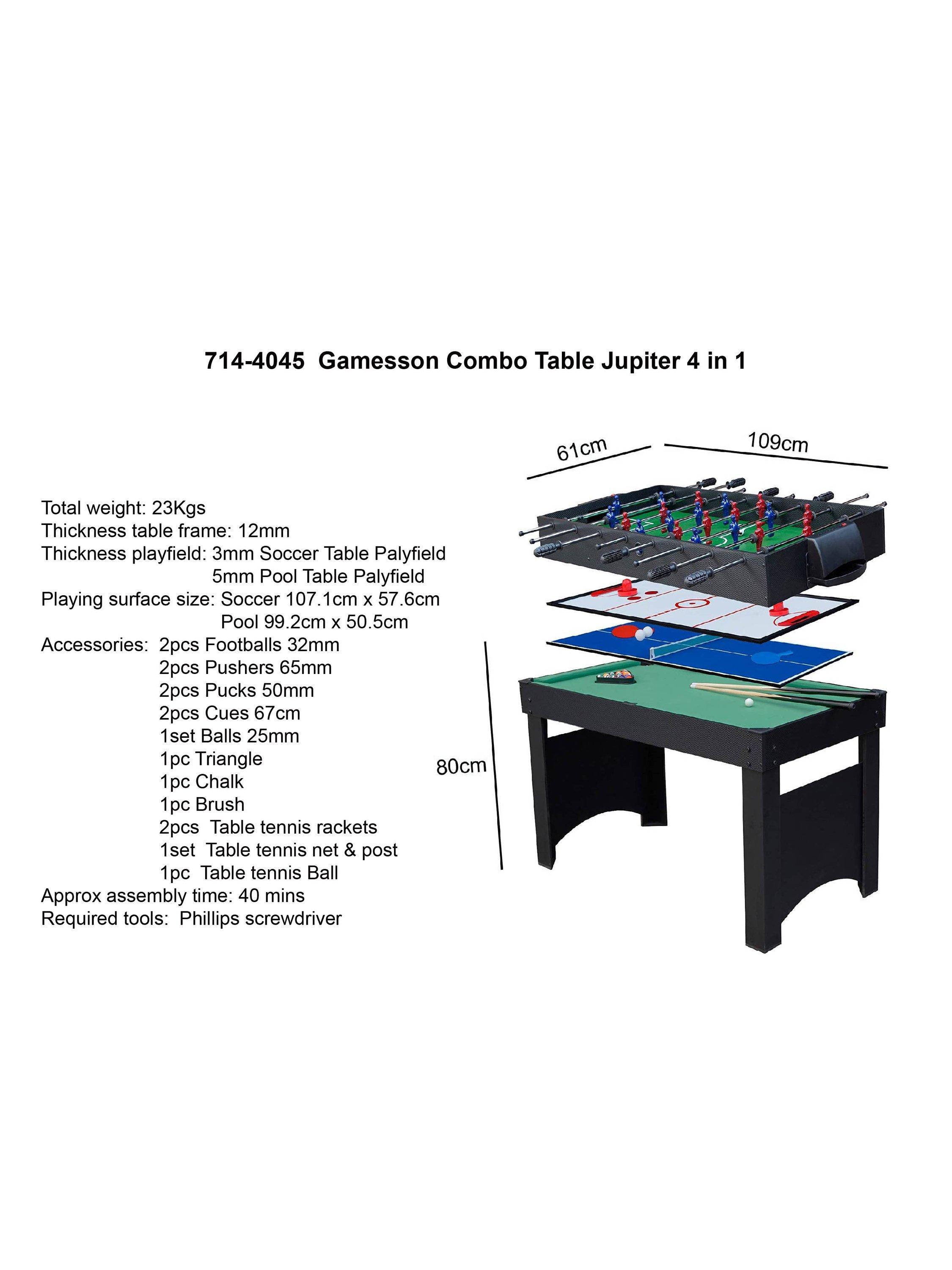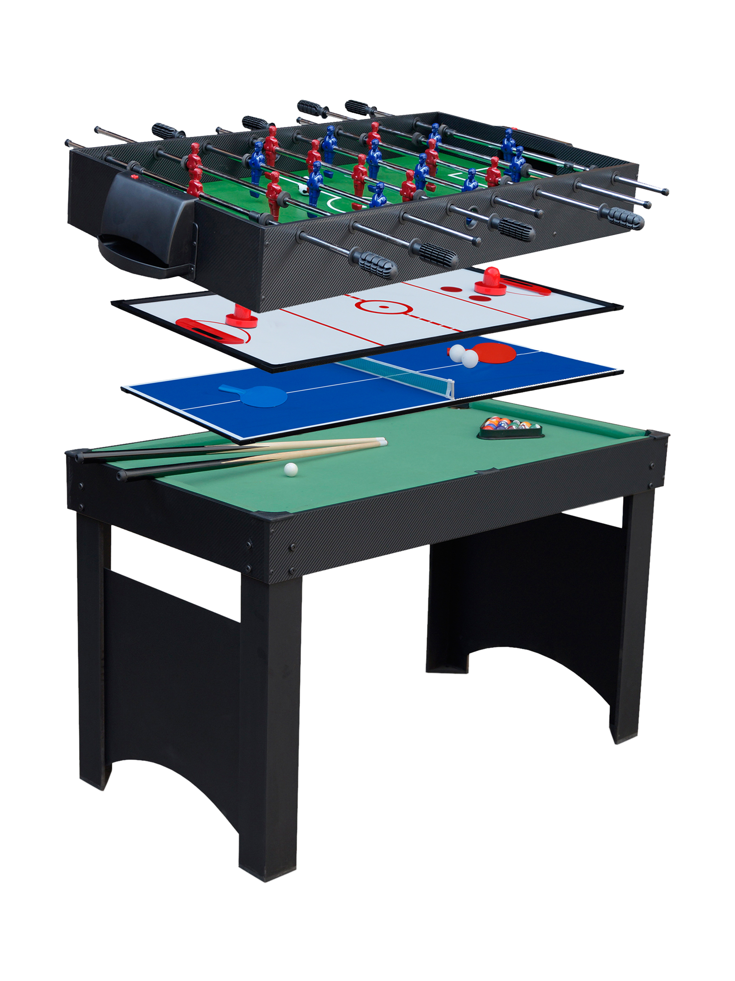 4 in 1 multi-game table. Includes Glide hockey, Table Tennis, Football with telescopic rods, pool and all accessories supplied.