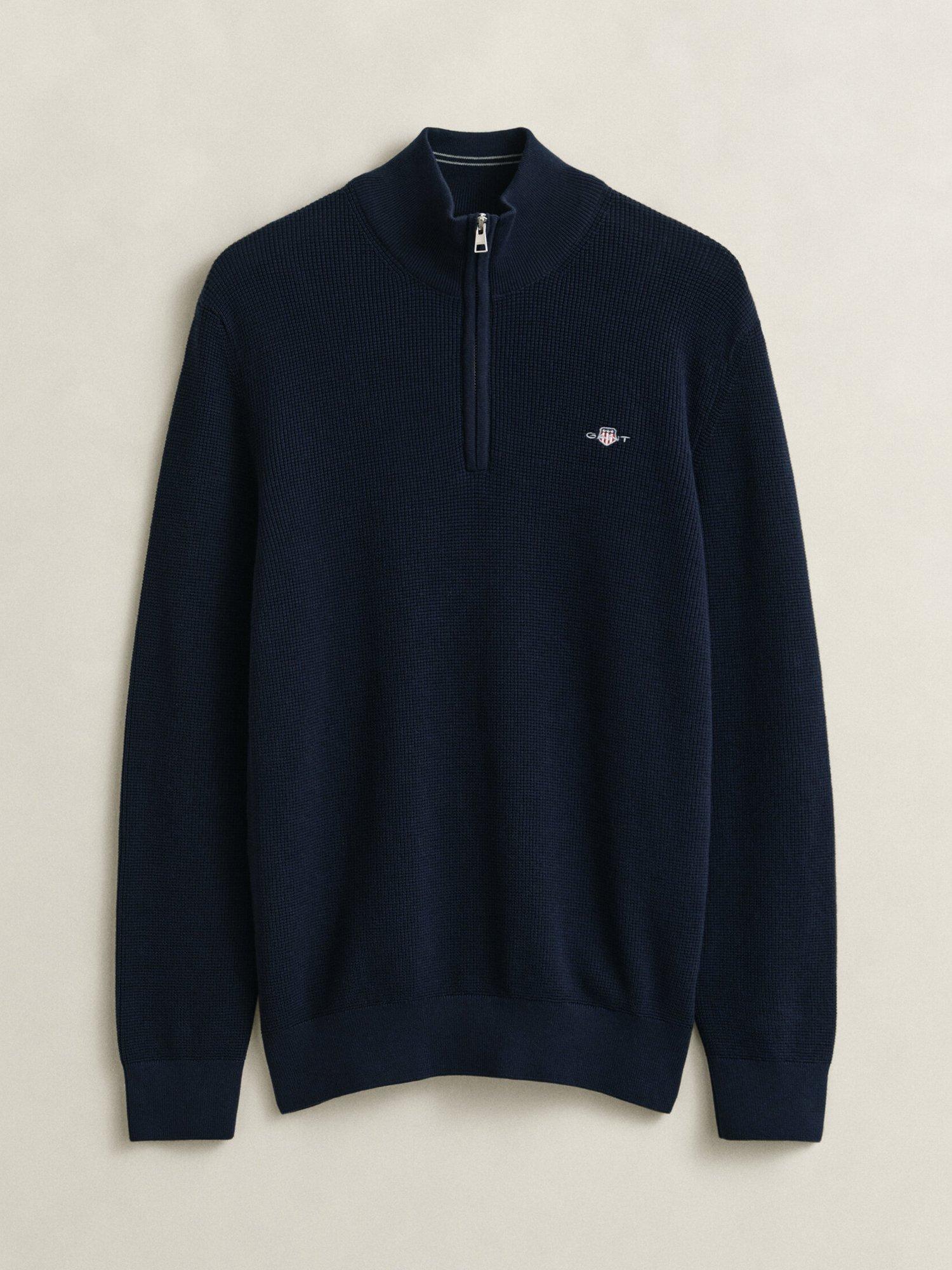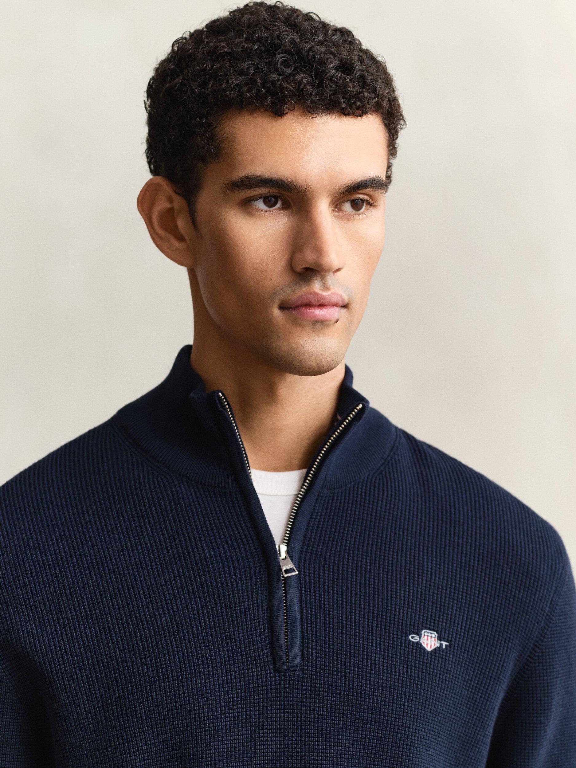 This Gant sweater is made from an organic cotton blend and features a subtle waffle-knit texture. Designed for a regular fit, it includes a half-zip collar ribbed cuffs and hem, and shield embroidery at the chest for a signature finish. This product is made with a majority of organic cotton.