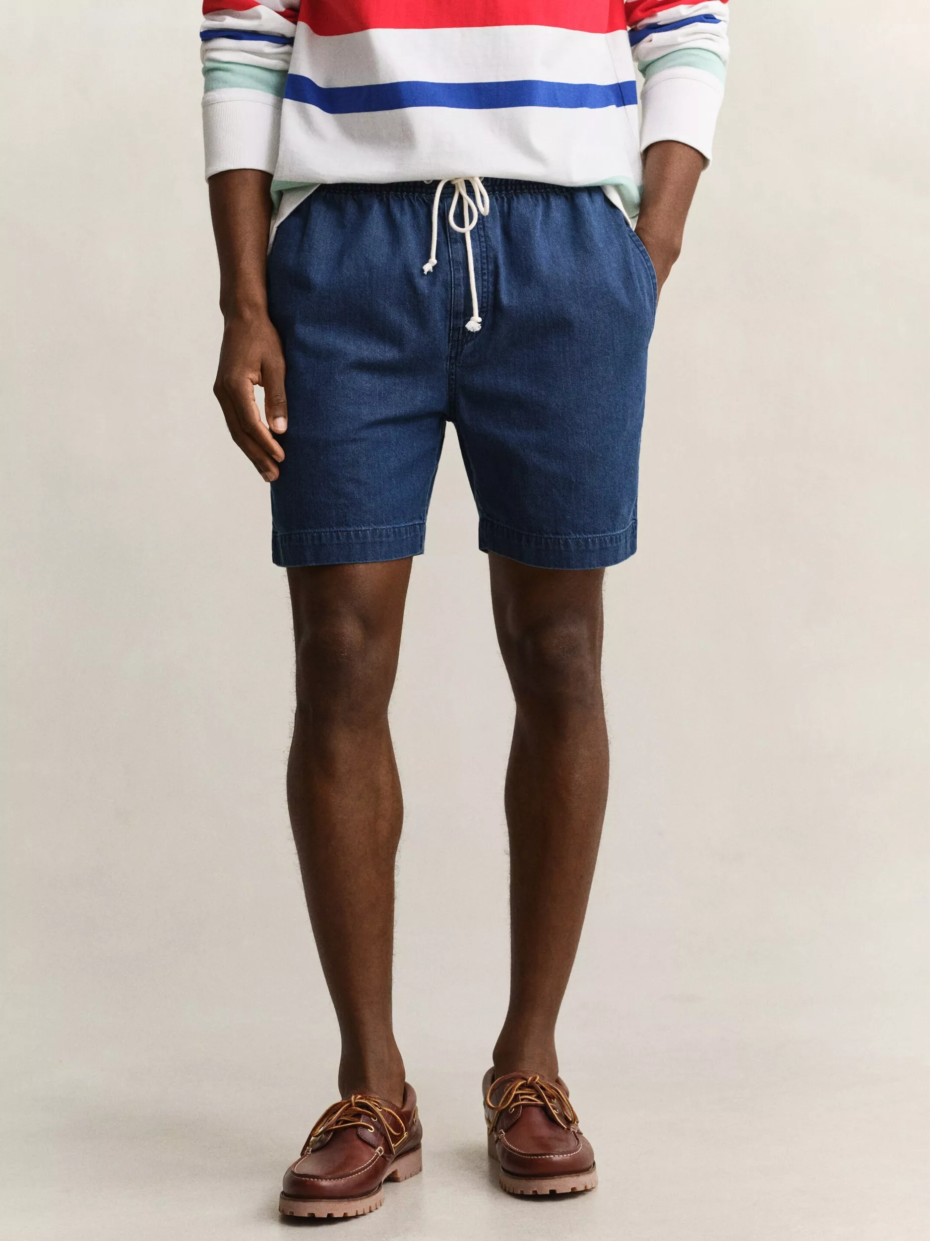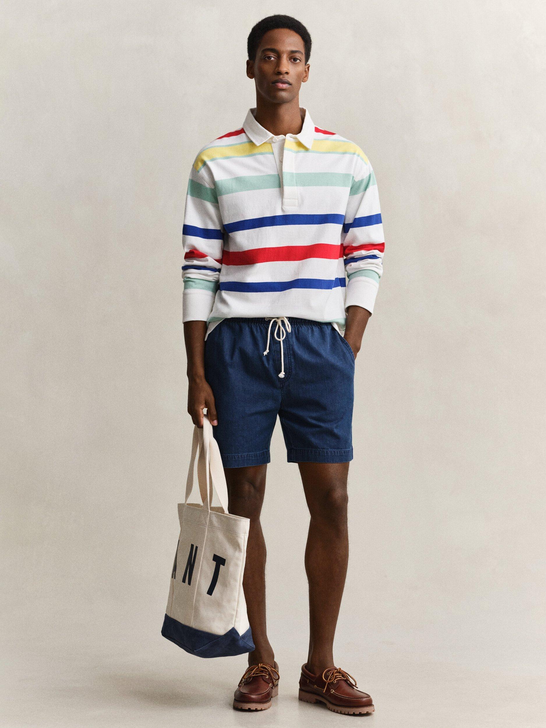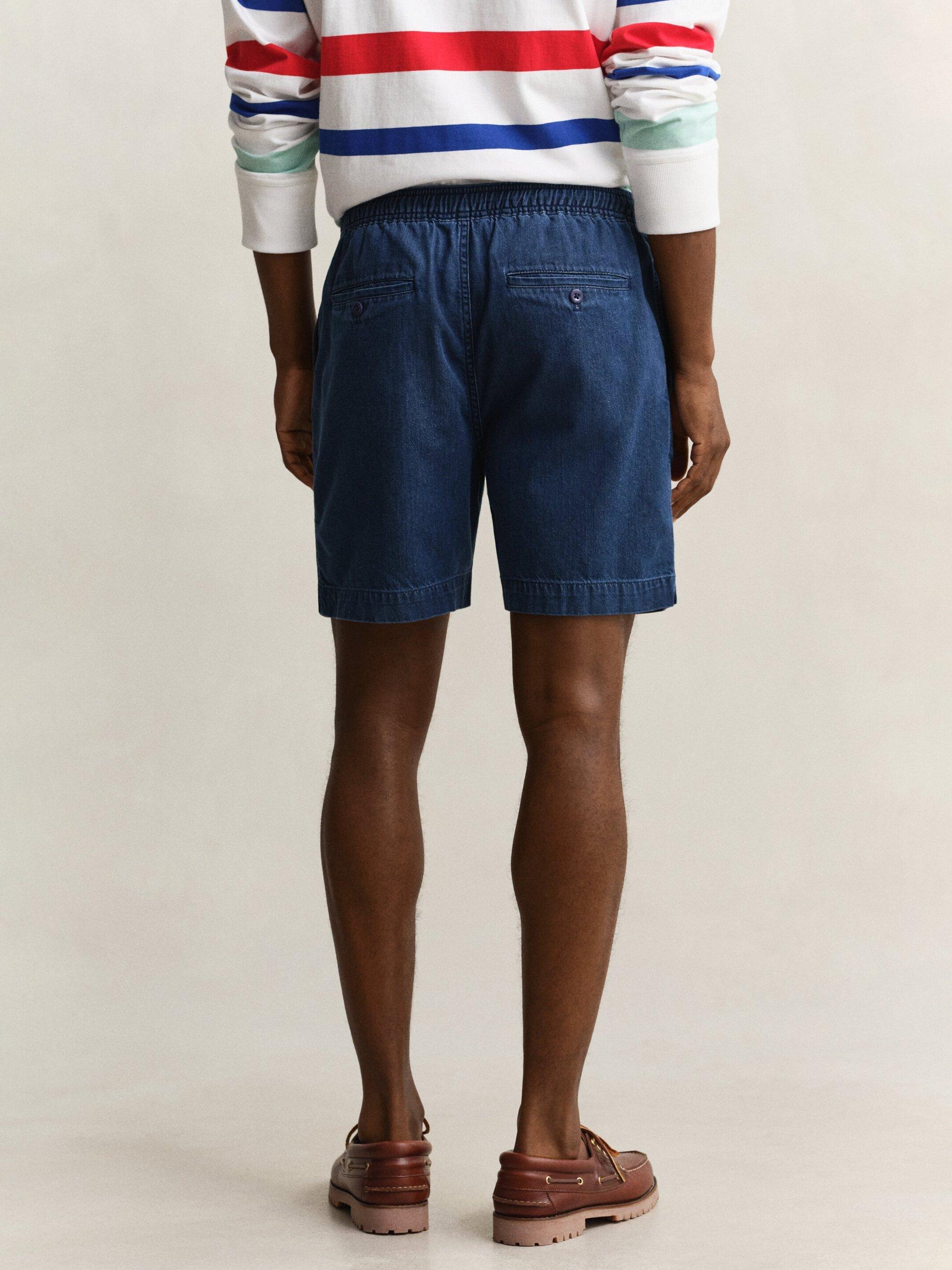 These Gant shorts are made from lightweight denim with a soft feel, ideal for warm weather. They feature an elasticated waistband for added comfort, side pockets, a cotton drawcord, buttoned back welt pockets, and a tonal Gant logo embroidered on the lower left leg.