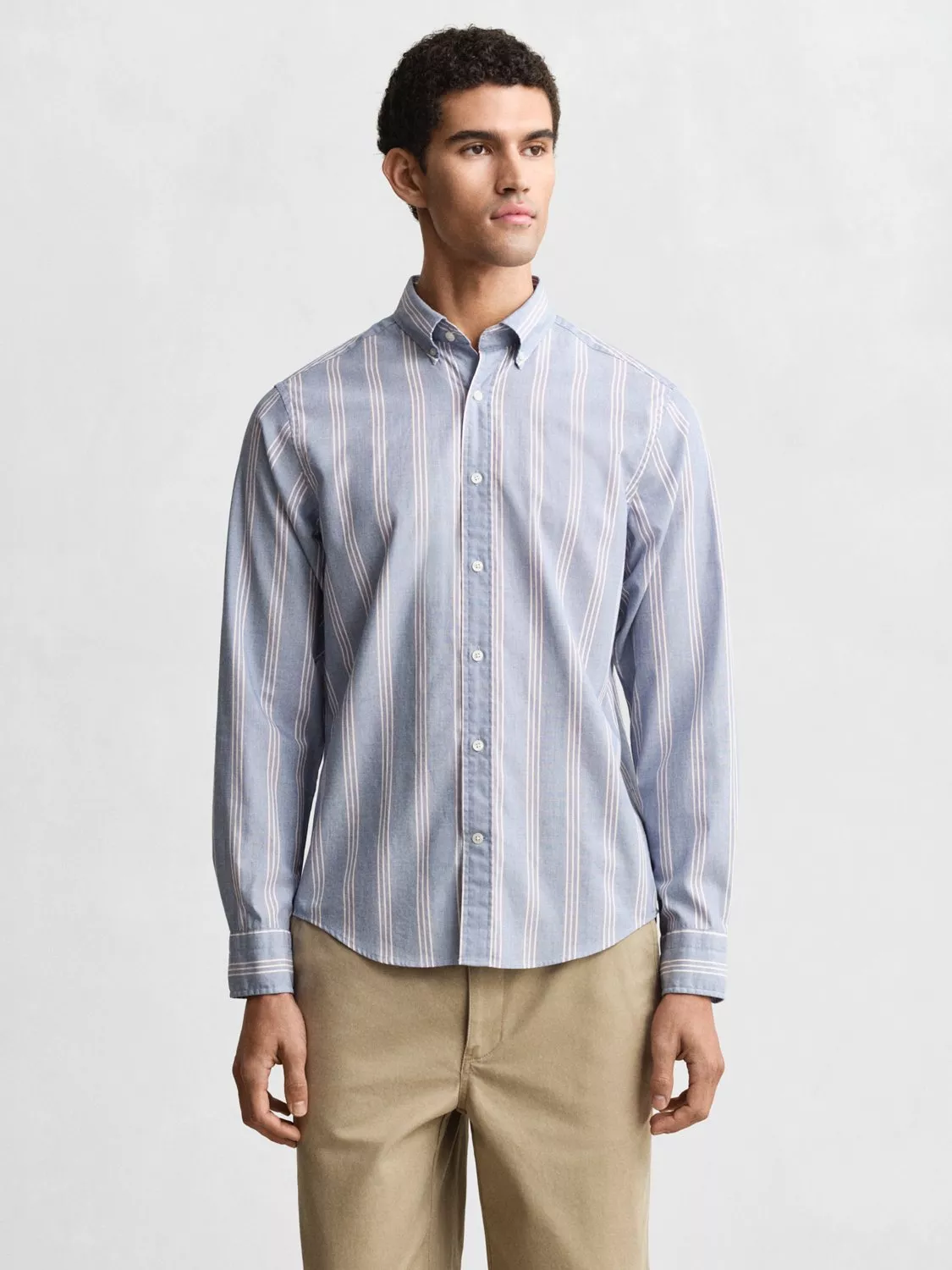This striped shirt is made from 100% cotton using a fil-à-fil weaving technique, creating a subtle contrast of light and dark stripes. It’s tailored in a regular fit and features a button-down collar, adjustable cuffs, and a curved hem. The shirt is finished with buttons made from recycled polyester for a more sustainable touch.