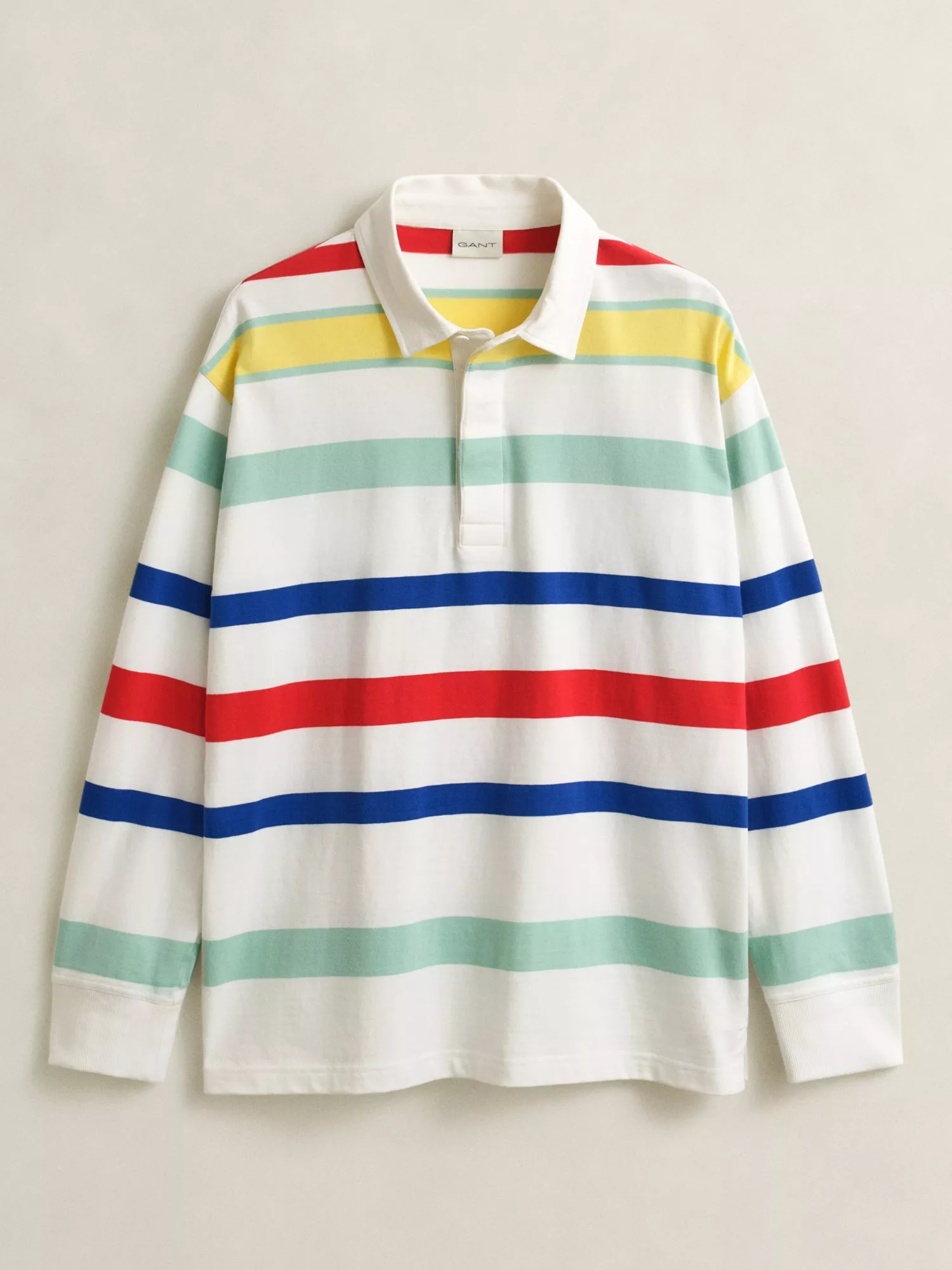 This relaxed-fit rugger from Gant is made from 100% cotton with multi-colored yarn-dyed stripes, making it a stand-out piece for the new season. It features a two-piece twill collar, ribbed sleeve cuffs, side slits, and a locker loop with tonal Gant logo embroidery. It's designed for a relaxed fit, but if you prefer a closer fit, we suggest sizing down.
