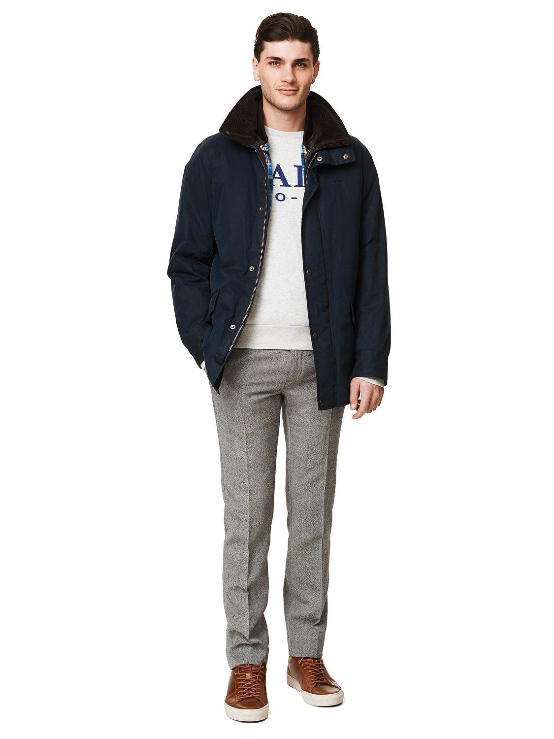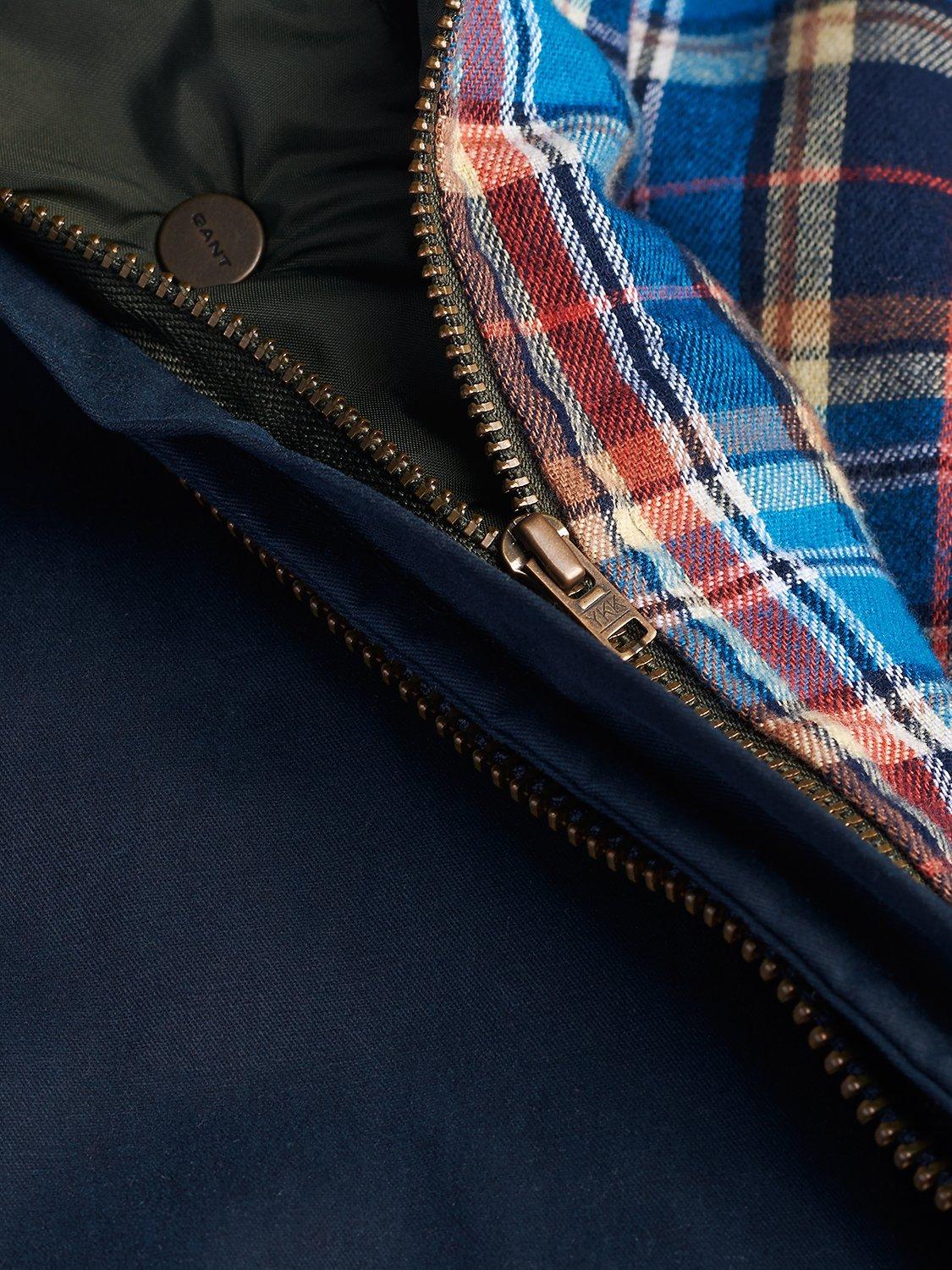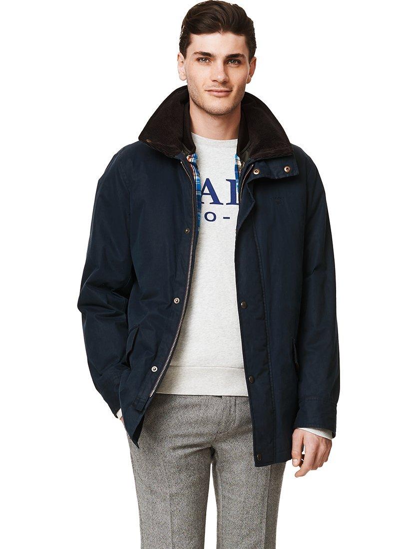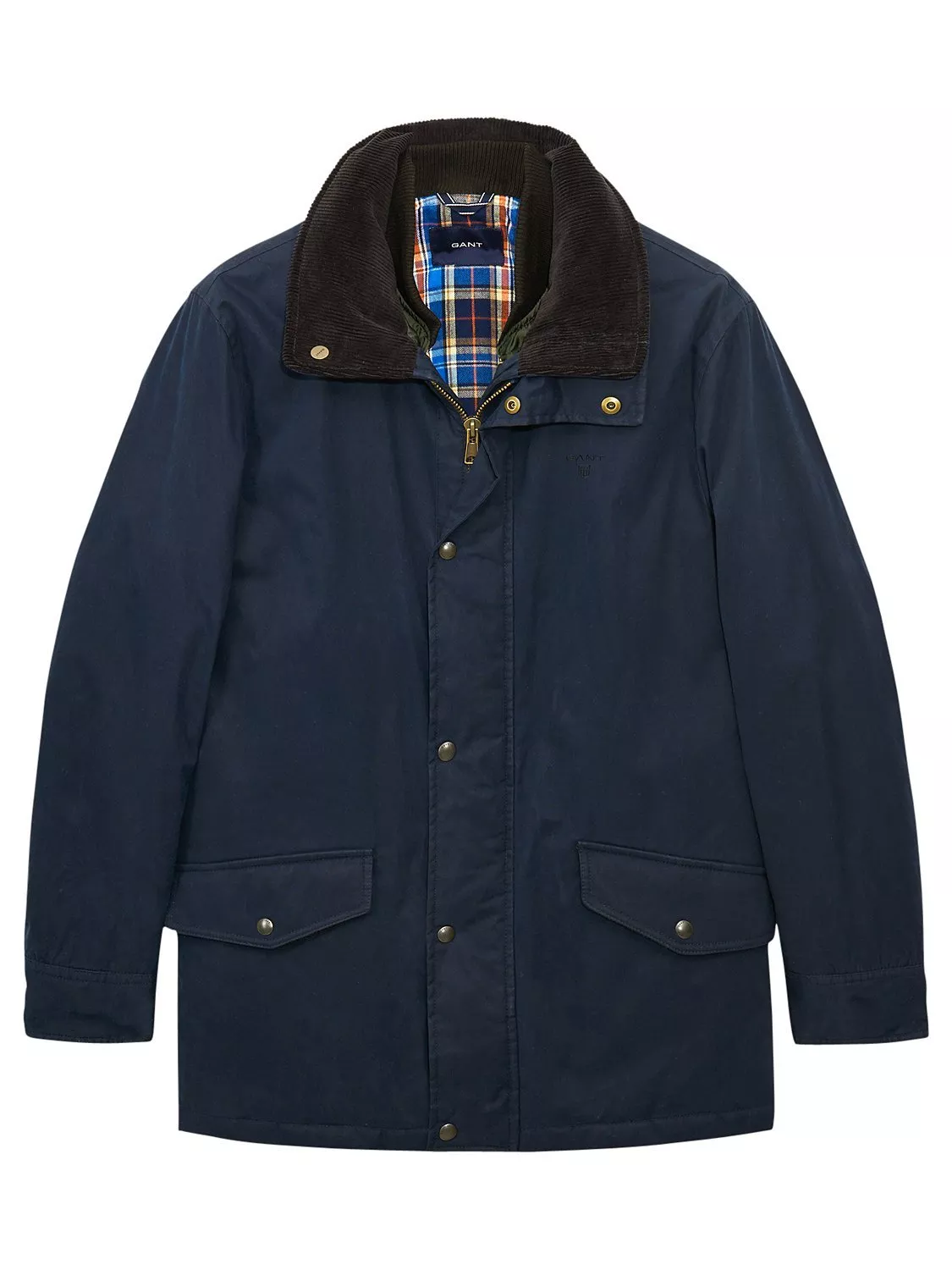 Crafted from durable coated cotton, the elegant outer features a zip closure with snap storm flap, storable hood inside the corduroy-lined collar, flap pockets, and a tonal GANT-embroidered shield on the chest.
