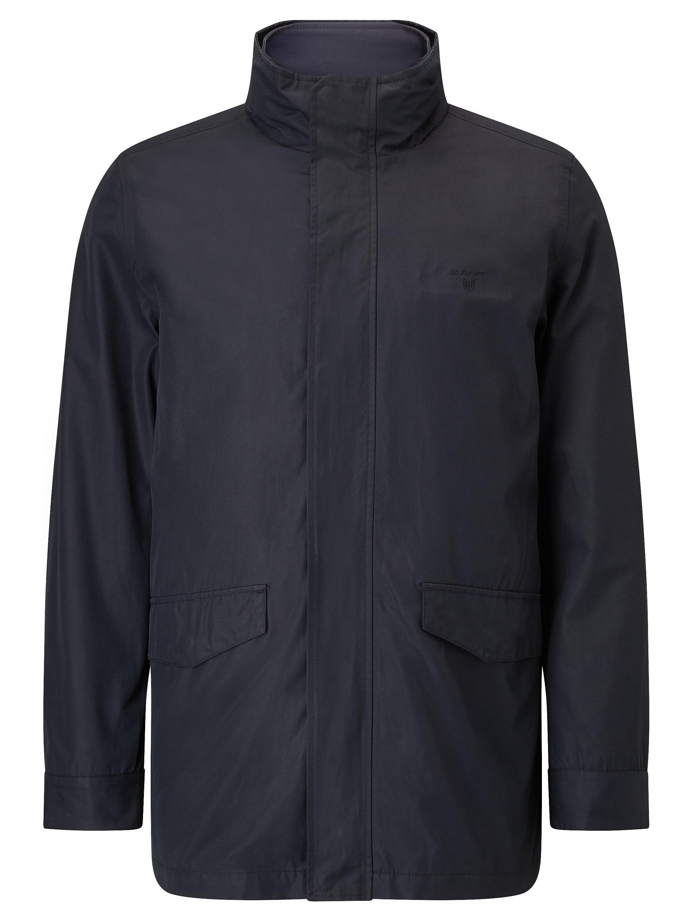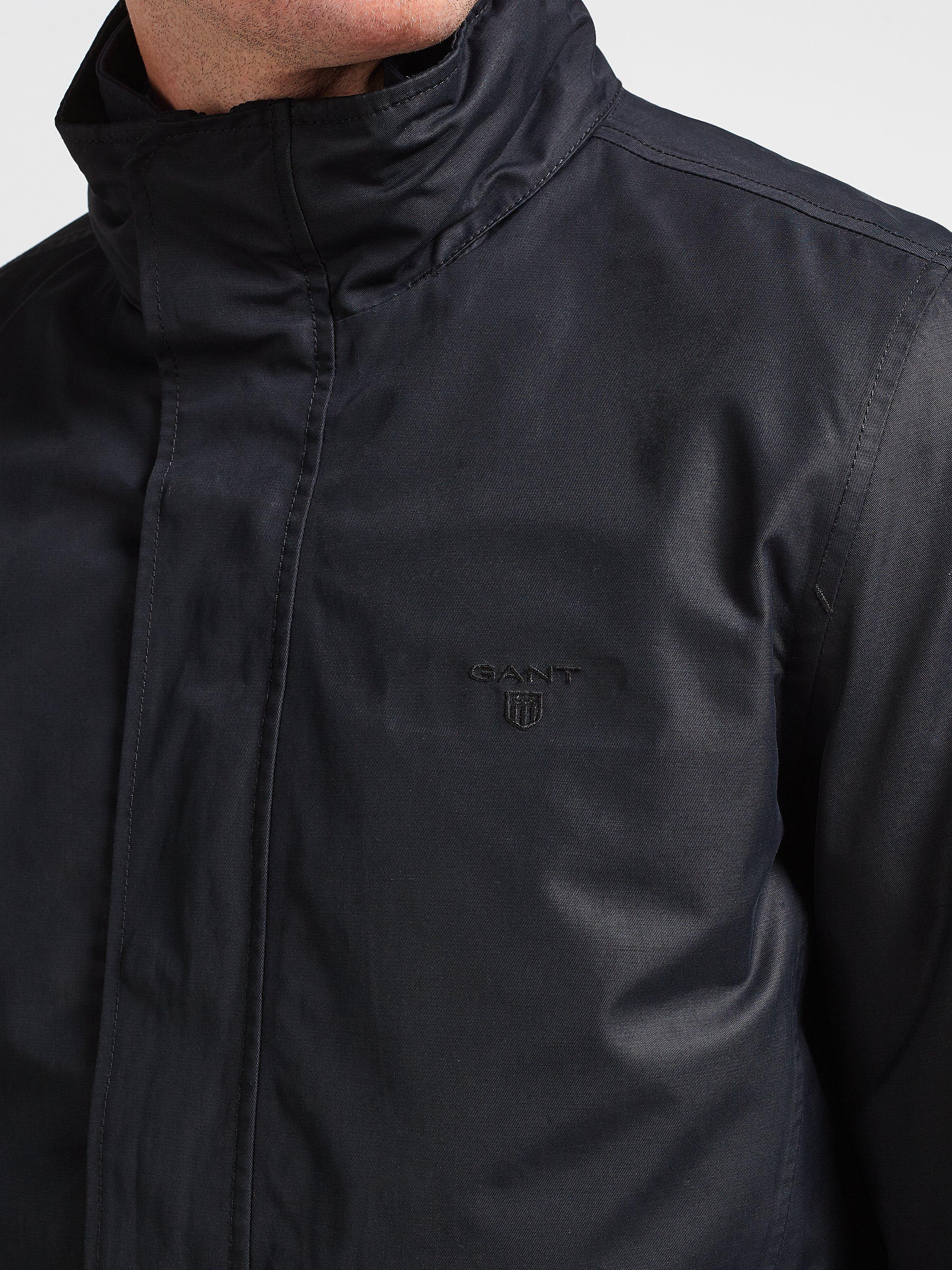 Features a standing collar with an interior hood for quick protection, a front zip closure with a snap storm flap, taped seams for added durability, flap front pockets, a fleece-lined interior on the upper with a quilted padding on the lower, and an embroidered Gant shield on the chest.