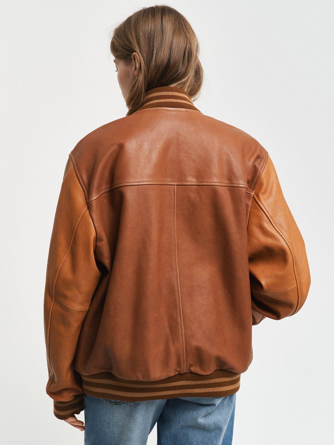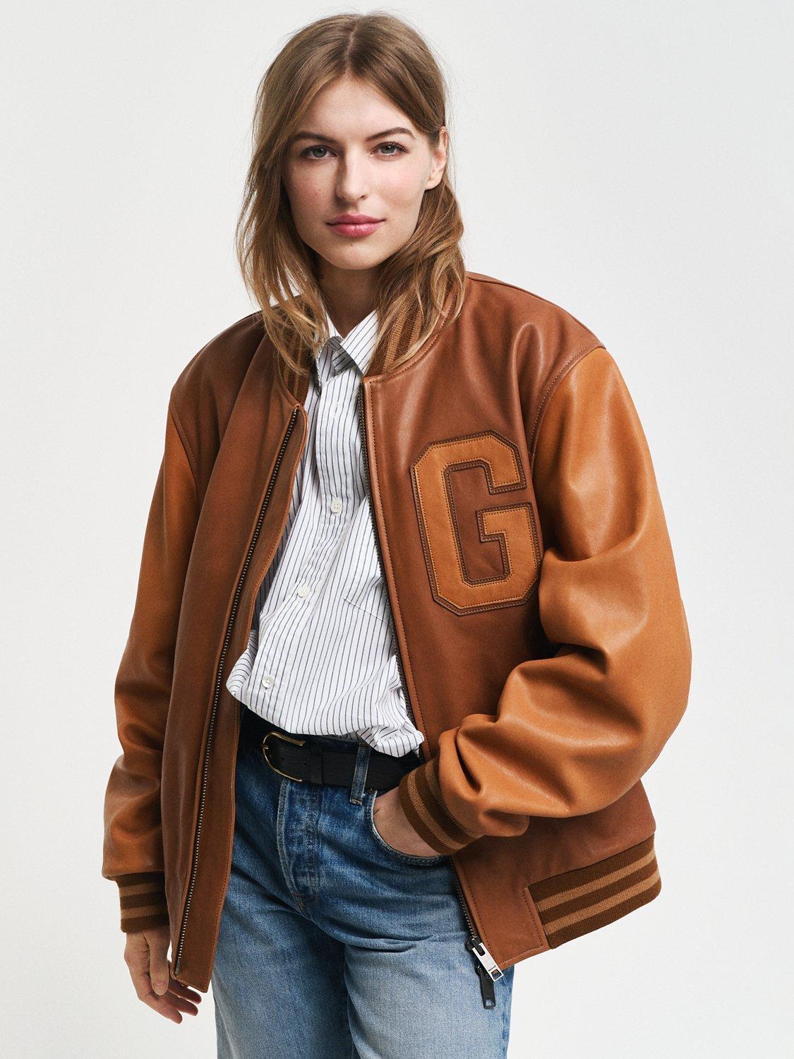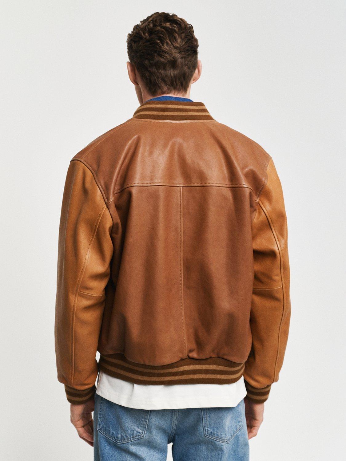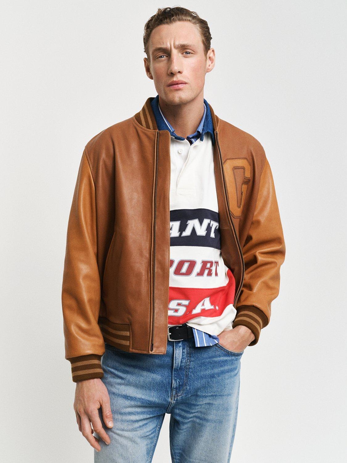 This garment is part of GANT's Anniversary Collection, celebrating the brand's 75-year heritage as one of the originators of American sportswear. The collection is inspired by vintage GANT pieces and includes a limited run of archive replicas.This replica of a mid-80s varsity jacket gets a modern collegiate update while maintaining its traditional feel. Crafted from heavy lambs leather with a wool flannel lining, it features classic varsity details like color-blocked sleeves, a bomber collar, and striped rib knit cuffs, collar, and hem.
