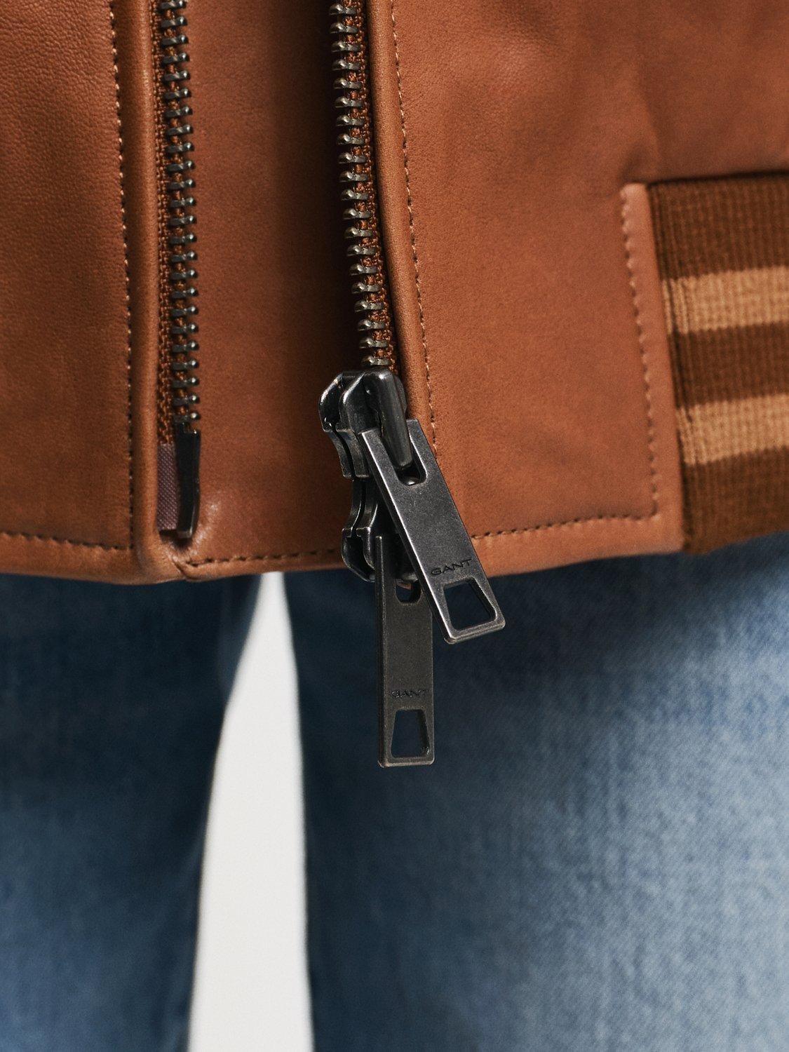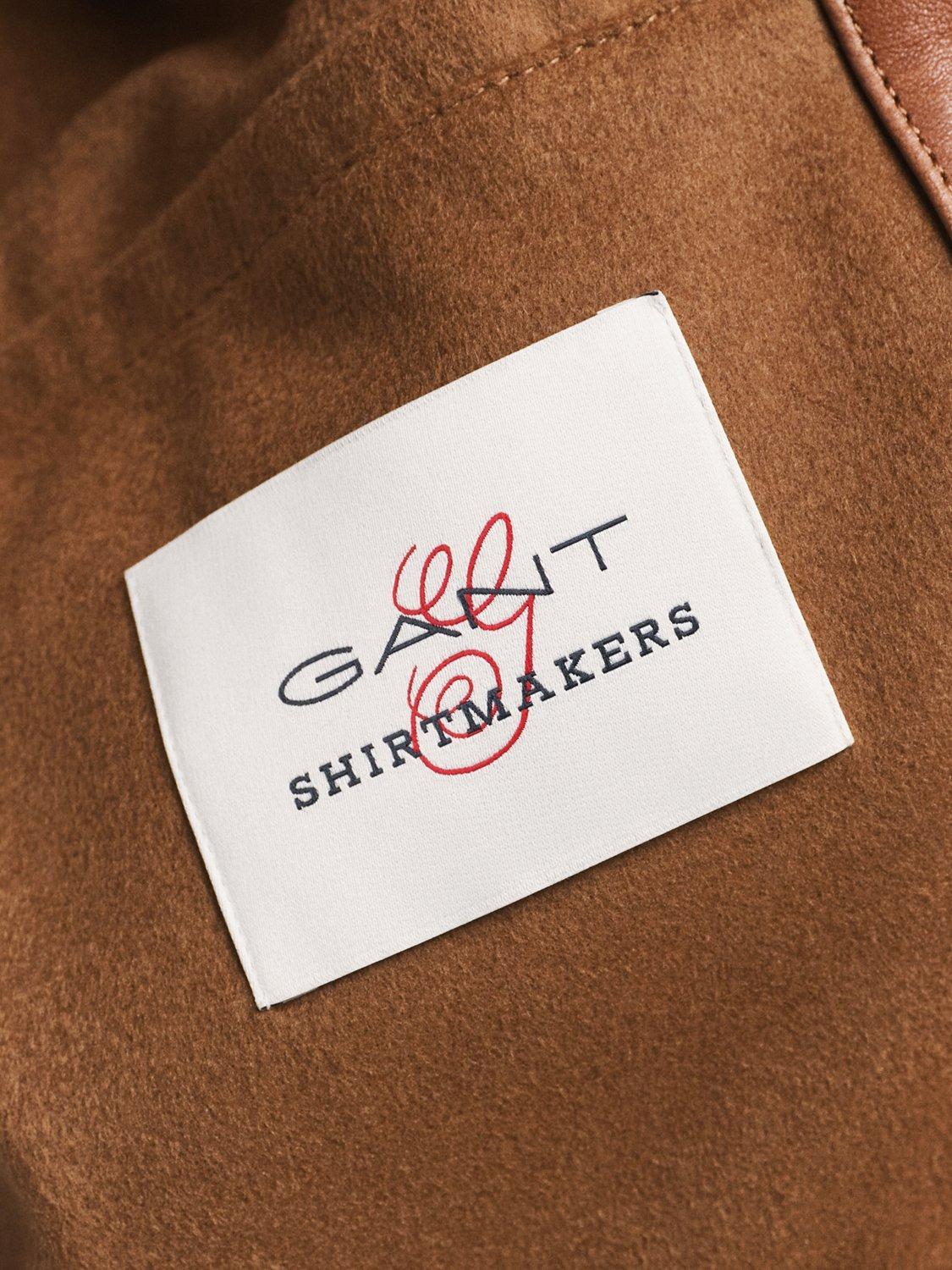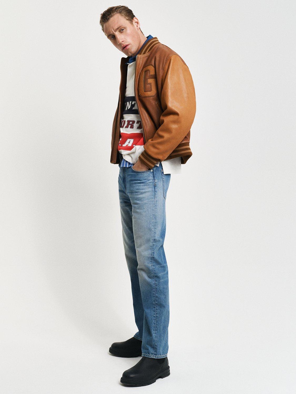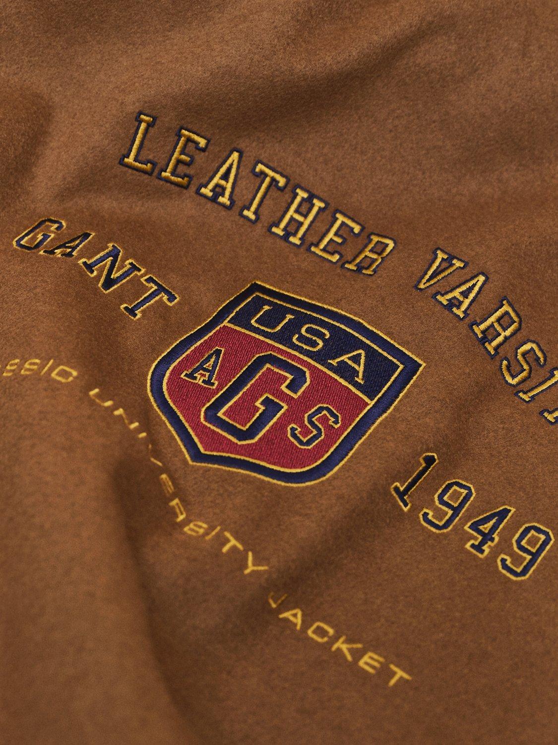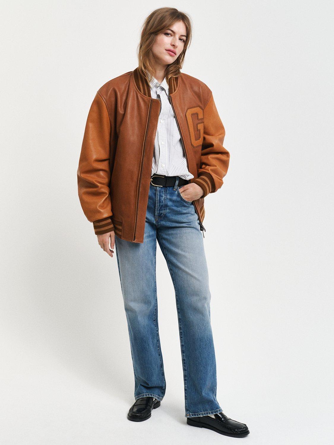 This garment is part of GANT's Anniversary Collection, celebrating the brand's 75-year heritage as one of the originators of American sportswear. The collection is inspired by vintage GANT pieces and includes a limited run of archive replicas.This replica of a mid-80s varsity jacket gets a modern collegiate update while maintaining its traditional feel. Crafted from heavy lambs leather with a wool flannel lining, it features classic varsity details like color-blocked sleeves, a bomber collar, and striped rib knit cuffs, collar, and hem.