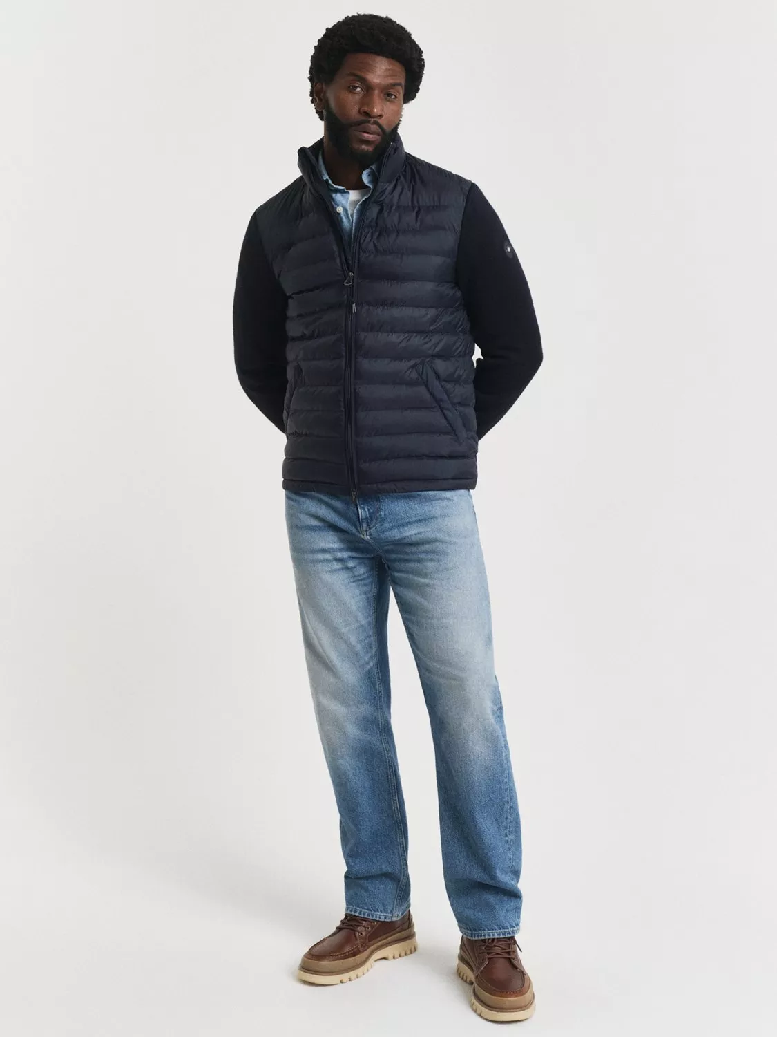 This jacket, designed with a mixed media approach, combines channel quilting on the body with knitted wool-blend sleeves for a contemporary look. Tailored for a regular fit, it includes a front zip closure, side zip pockets, a drawstring hem, and a silicone badge on the sleeve. The jacket is fully lined, featuring a lightly insulated interior and an additional pocket for extra convenience. This product is made with recycled polyester, aligned with our sustainability strategy to support circularity. This product is made with recycled polyester, aligned with GANT's sustainability strategy to support circularity.