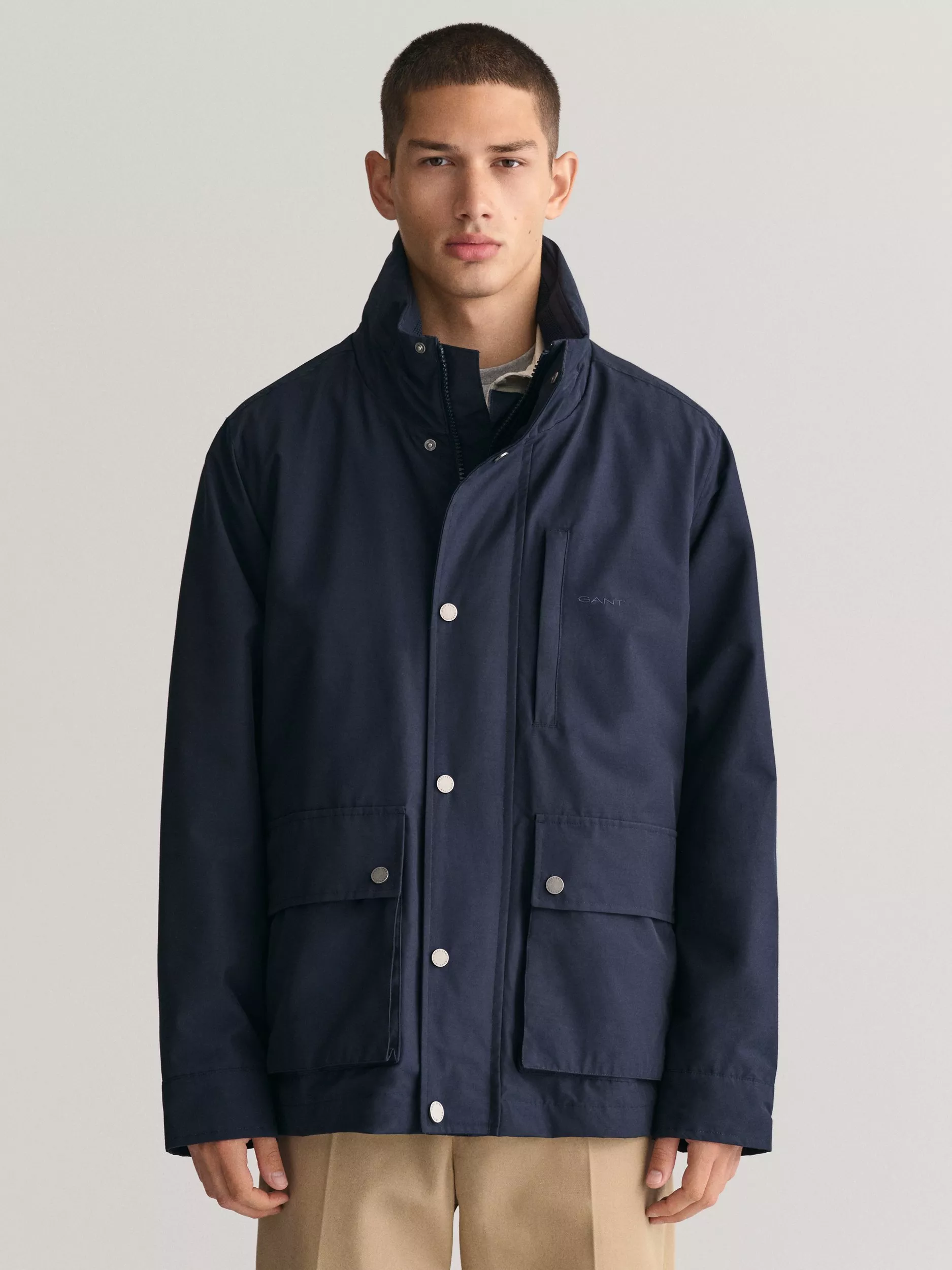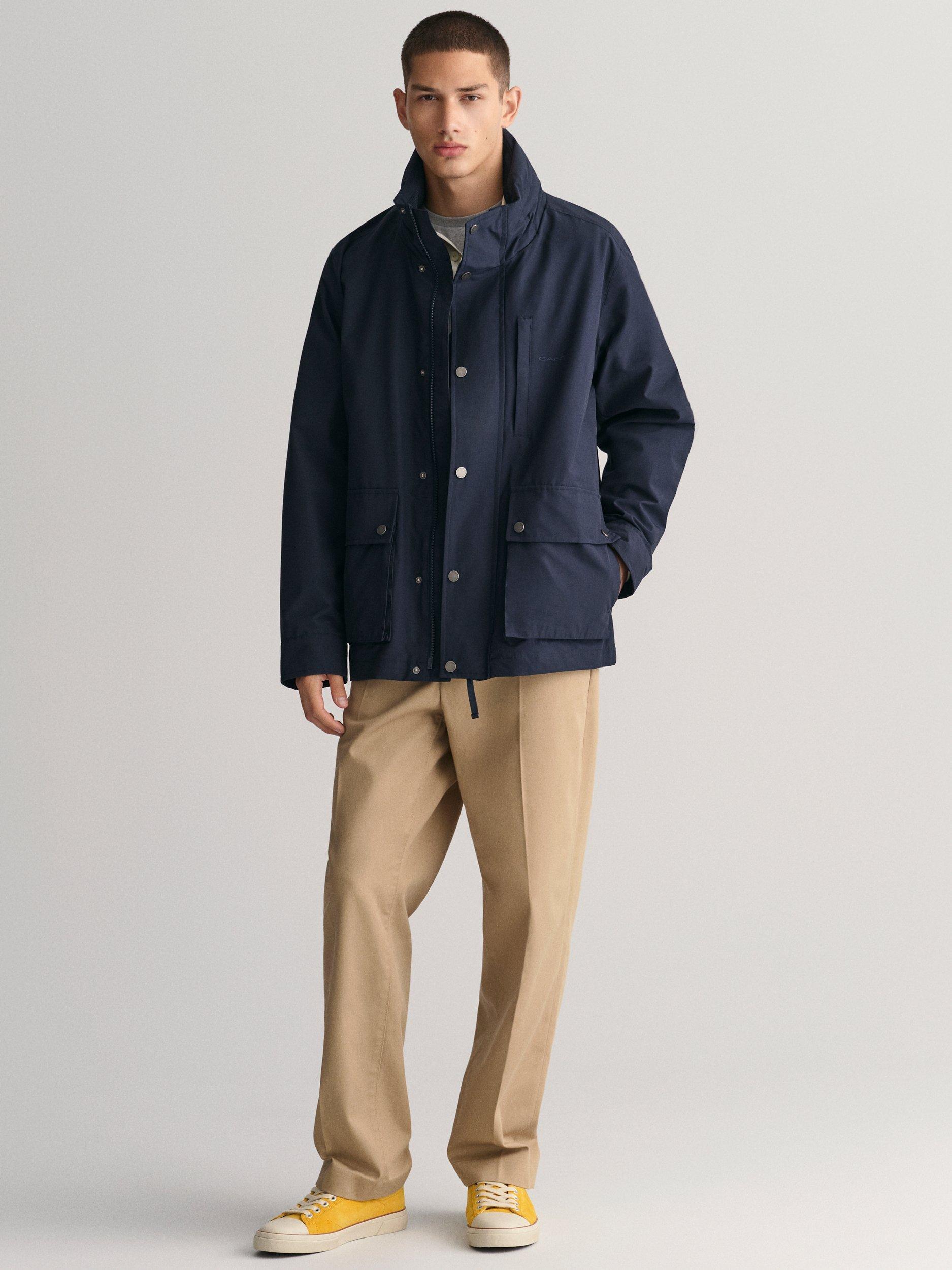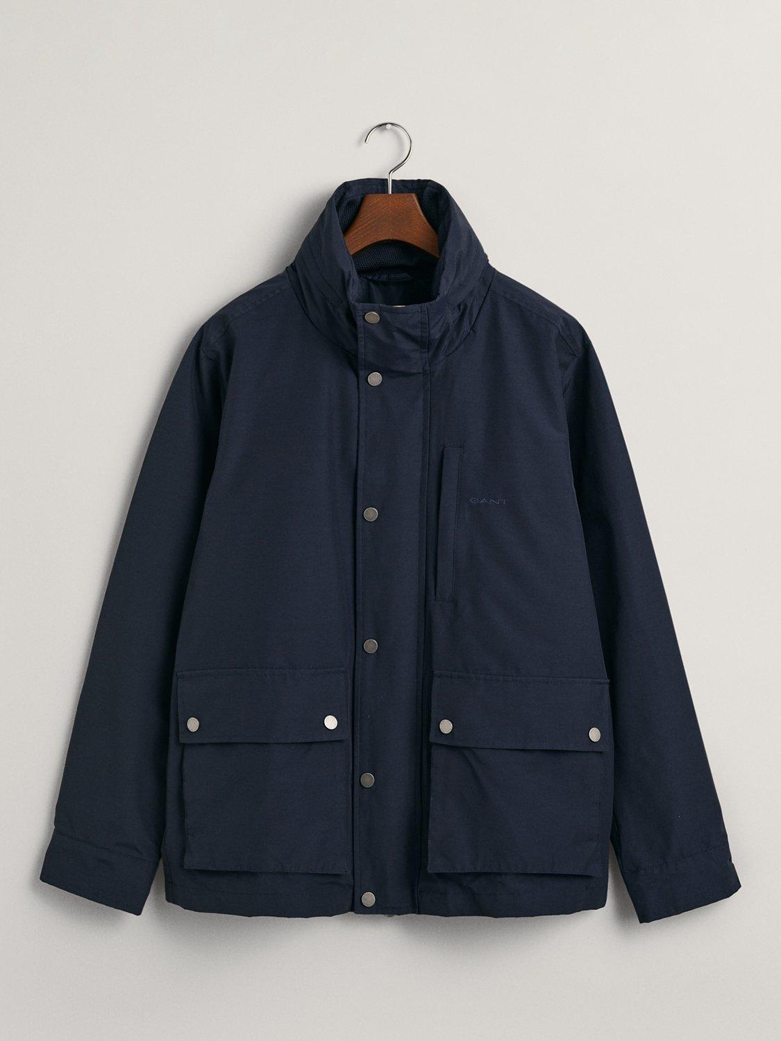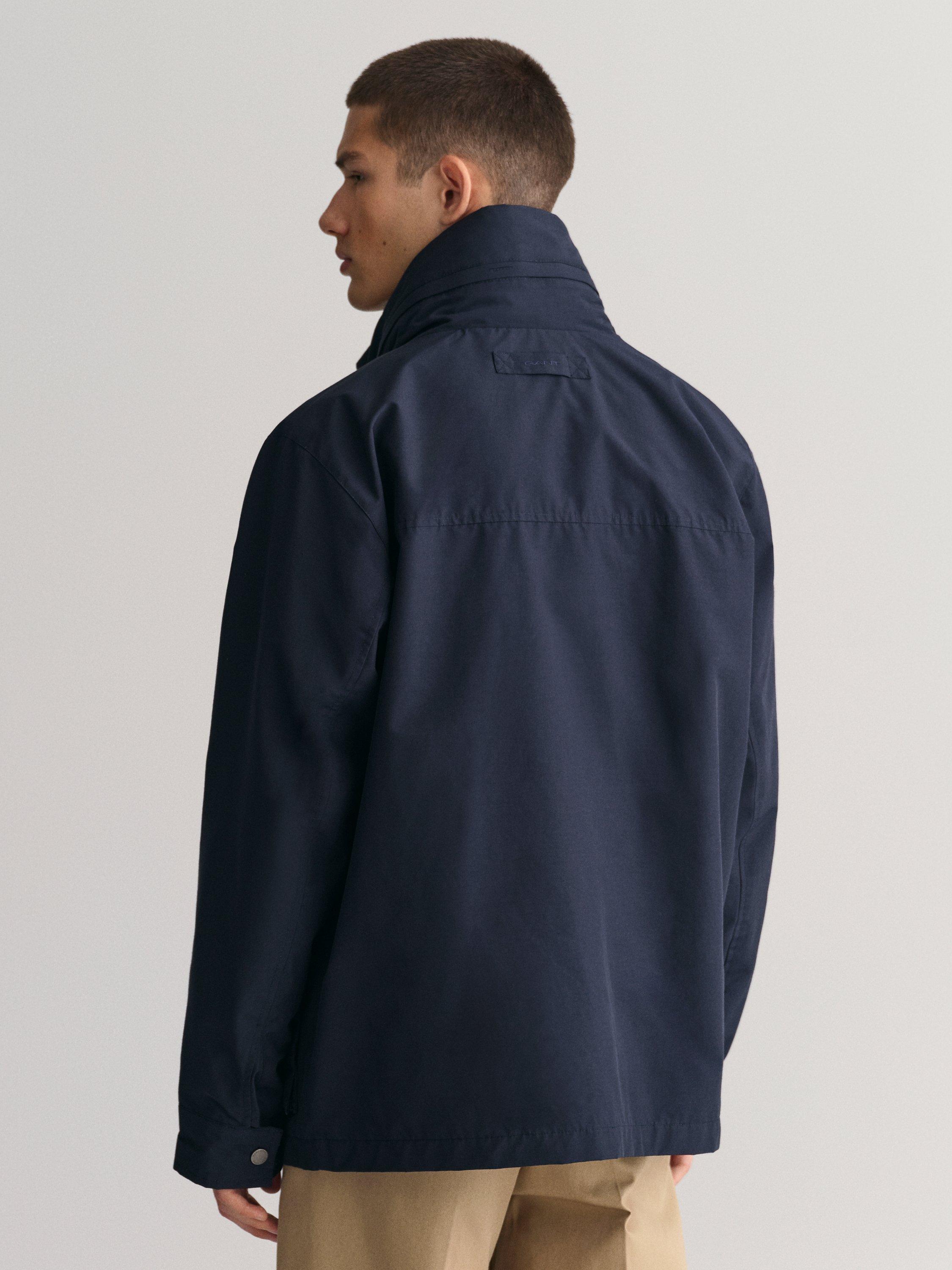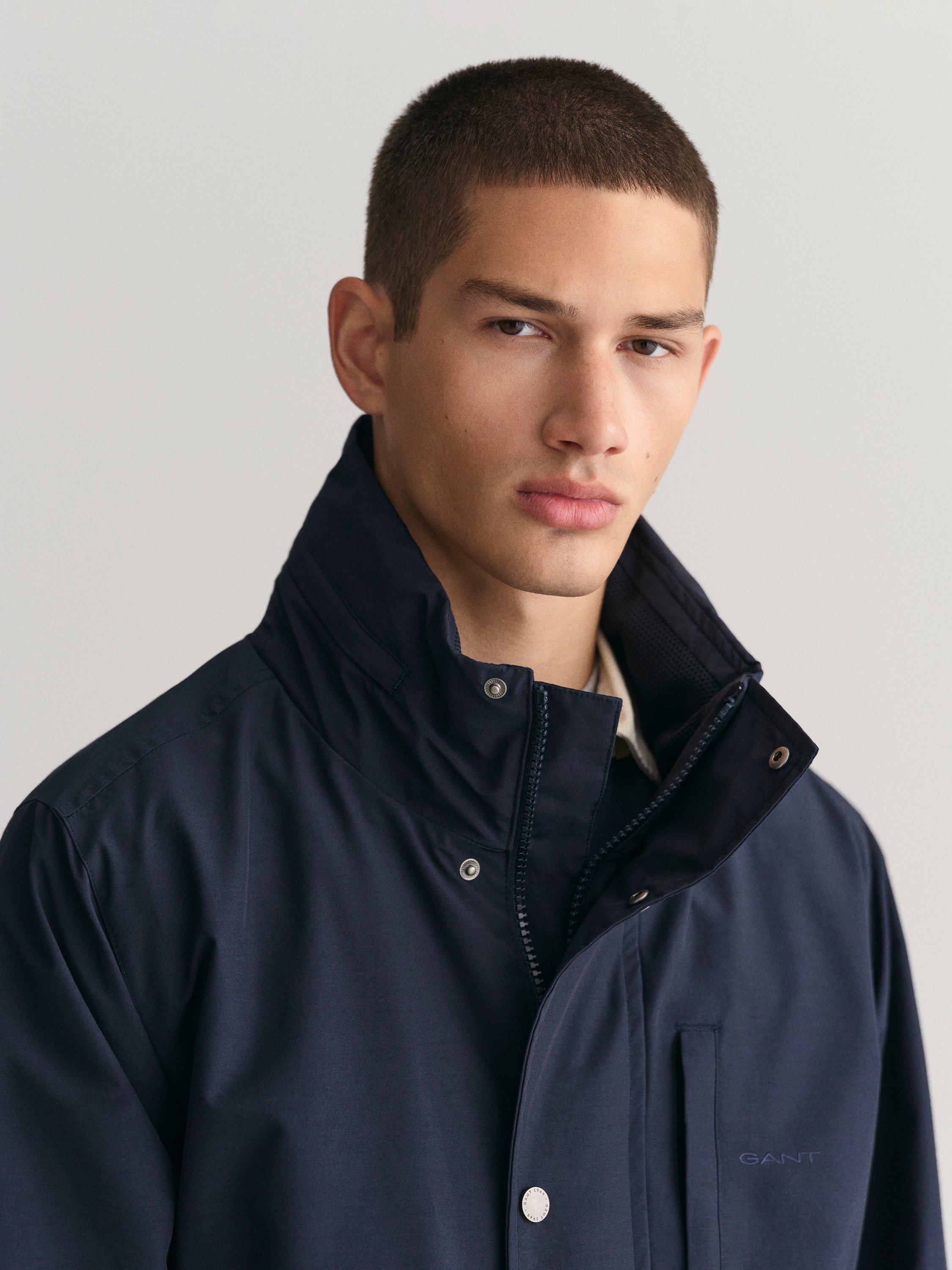 Designed in a regular fit, this GANT jacket is made from a lightweight fabric that falls to a mid-thigh length. Enhanced with a water-resistant finish, it has a stand collar, a chest welt pocket, and a concealed zip closure beneath a center press-button placket. The jacket is adorned with the iconic GANT logo embroidered on the chest and is further equipped with two front patch pockets and two inner patch pockets that are secured with velcro closure.