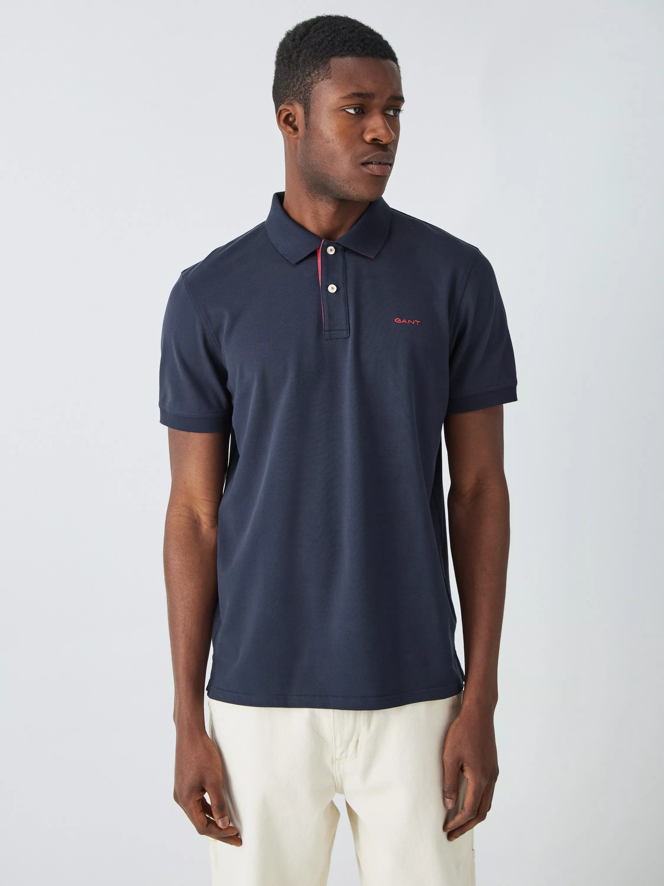 Crafted from a soft cotton blend in a piqué texture, this GANT polo shirt is cut for a regular fit. It is designed with short sleeves, a flat knit collar and a two button placket. This polo shirt features contrast color detailing under the collar, placket, necktape and at the chest with an embroidered GANT logo.