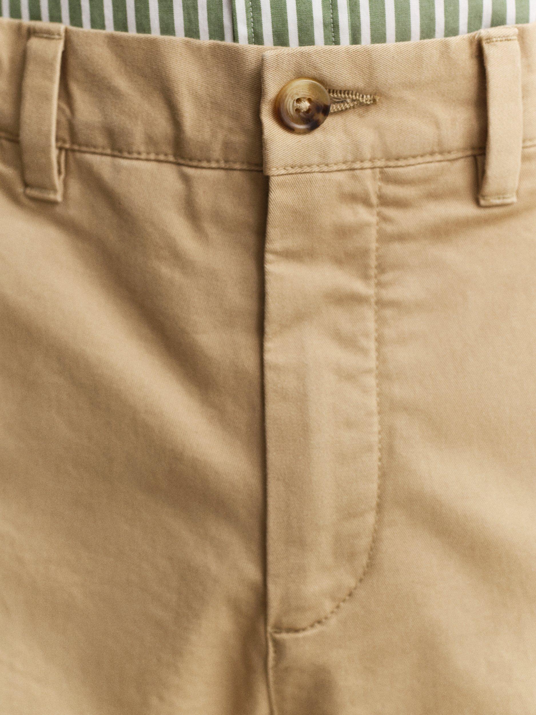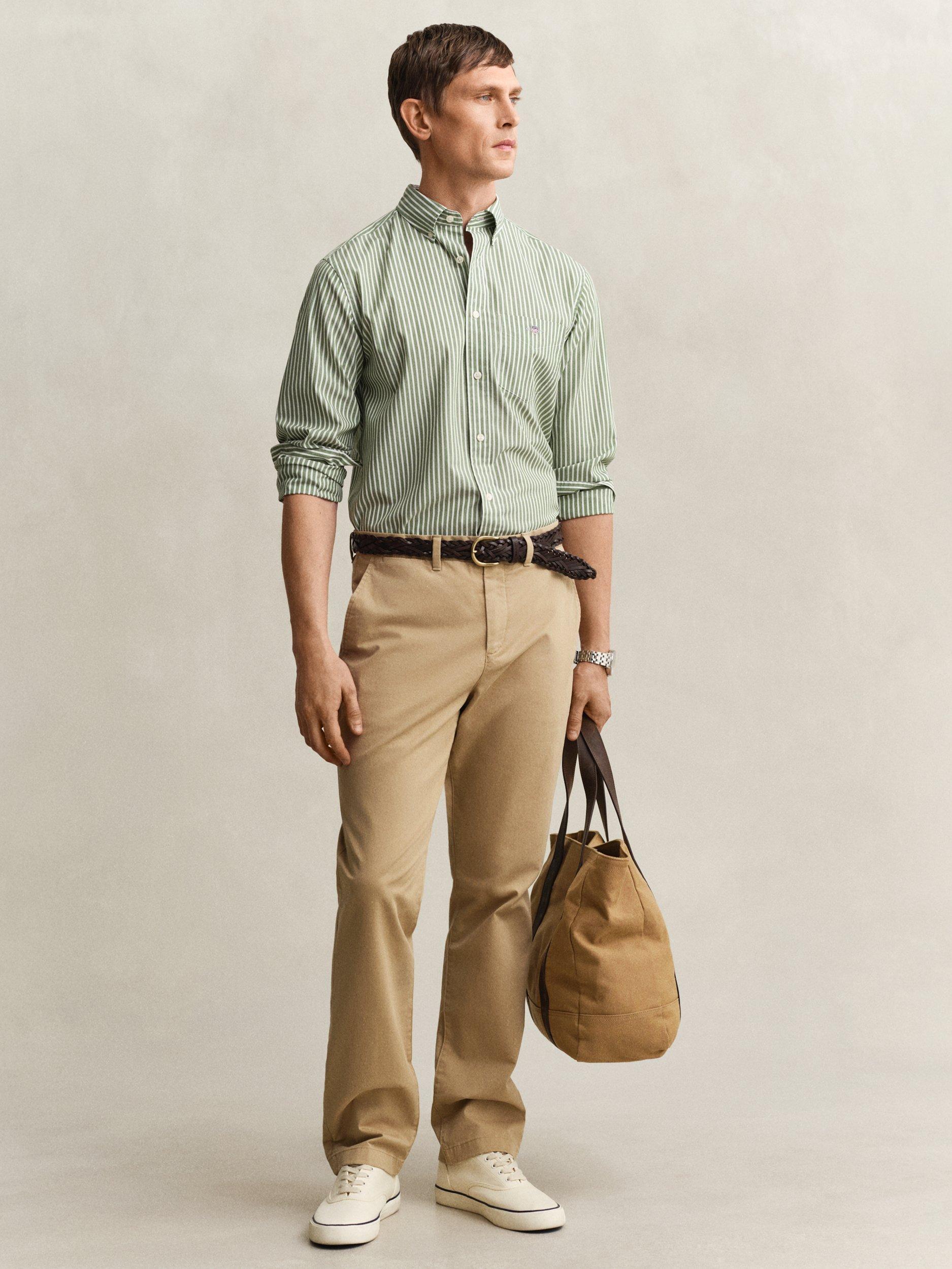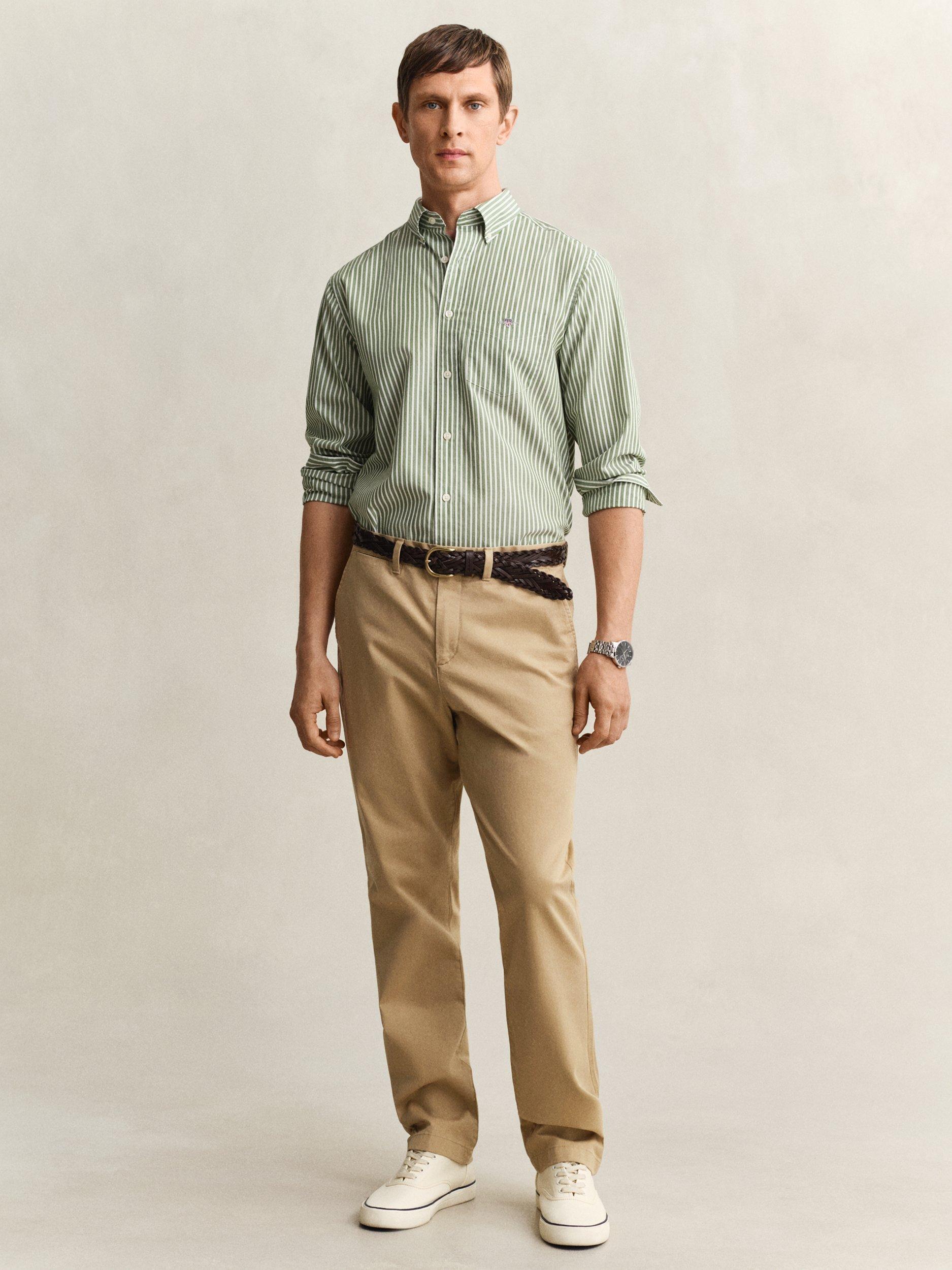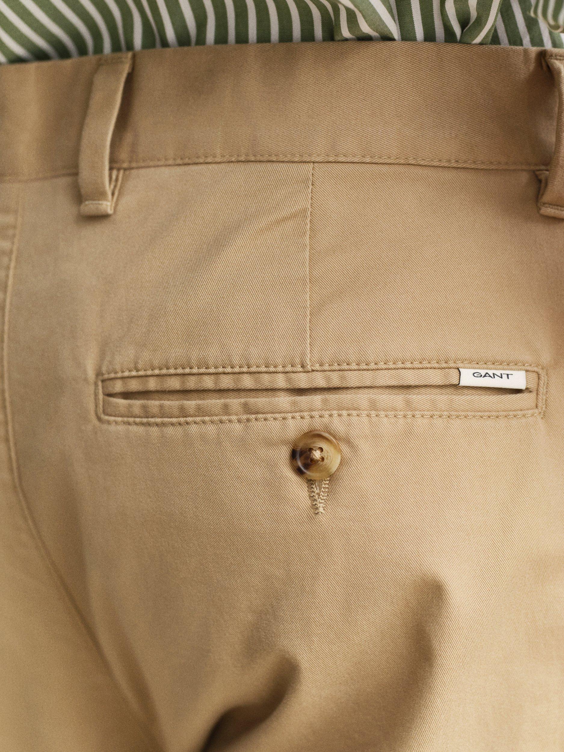 These chinos deliver a modern update to a preppy classic with a sleek, streamlined look. Crafted from cotton with added stretch, they feature a mid-rise waist and a regular fit from hip to leg. Details include a zip fly, belt loops, branded buttons, slanted front pockets, and buttoned welt pockets at the back. This style has a new and improved fit that’s true to size. We recommend selecting the size you normally buy from Gant, or check the size guide for more information.