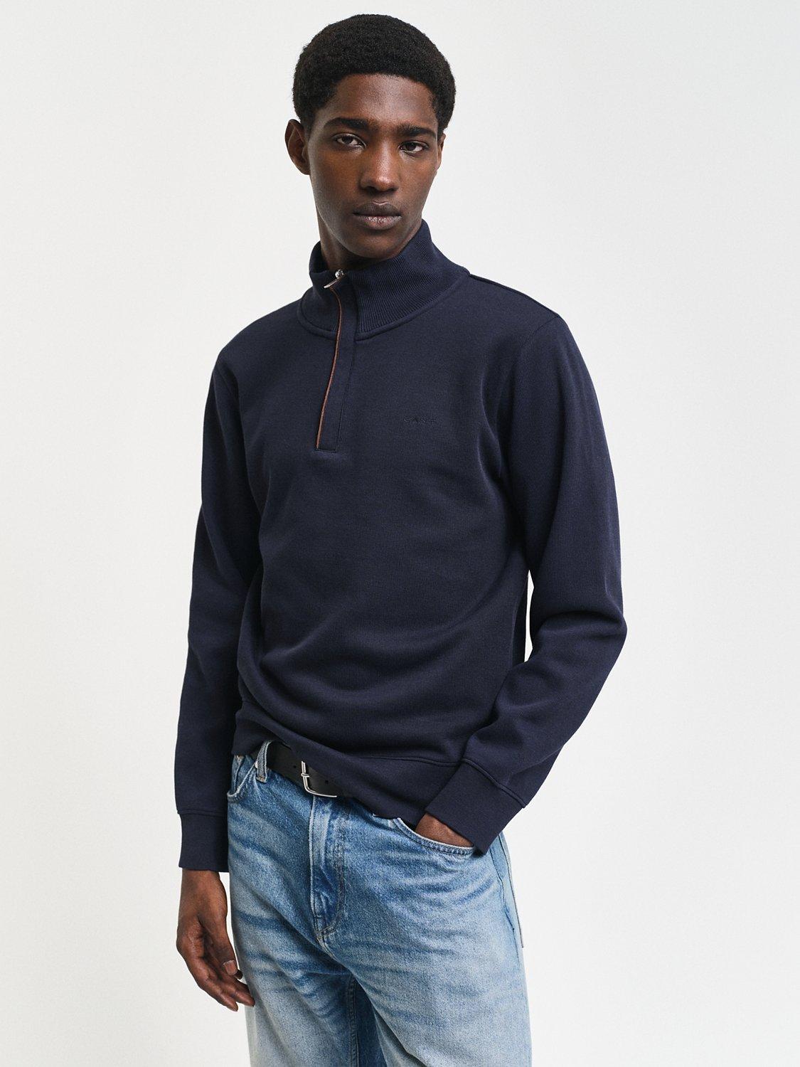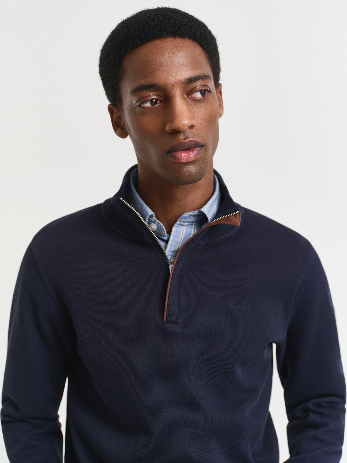 Dressier than a sweatshirt but just as comfortable, this piece is perfect for layering over shirts at the office or over T-shirts on the weekend. Cut from 100% cotton with a soft handfeel, this sweatshirt is designed for a regular fit with a half-zip collar.