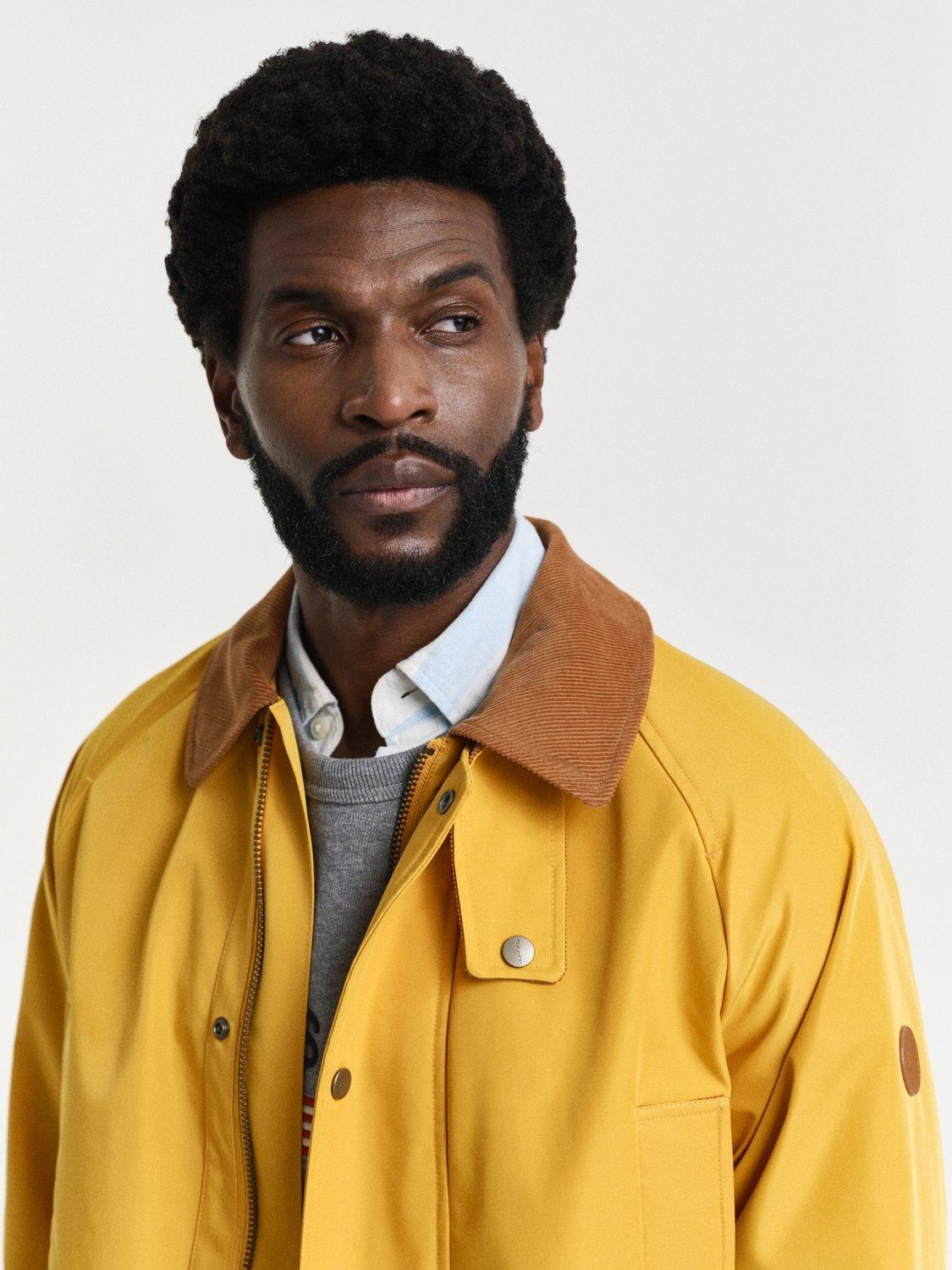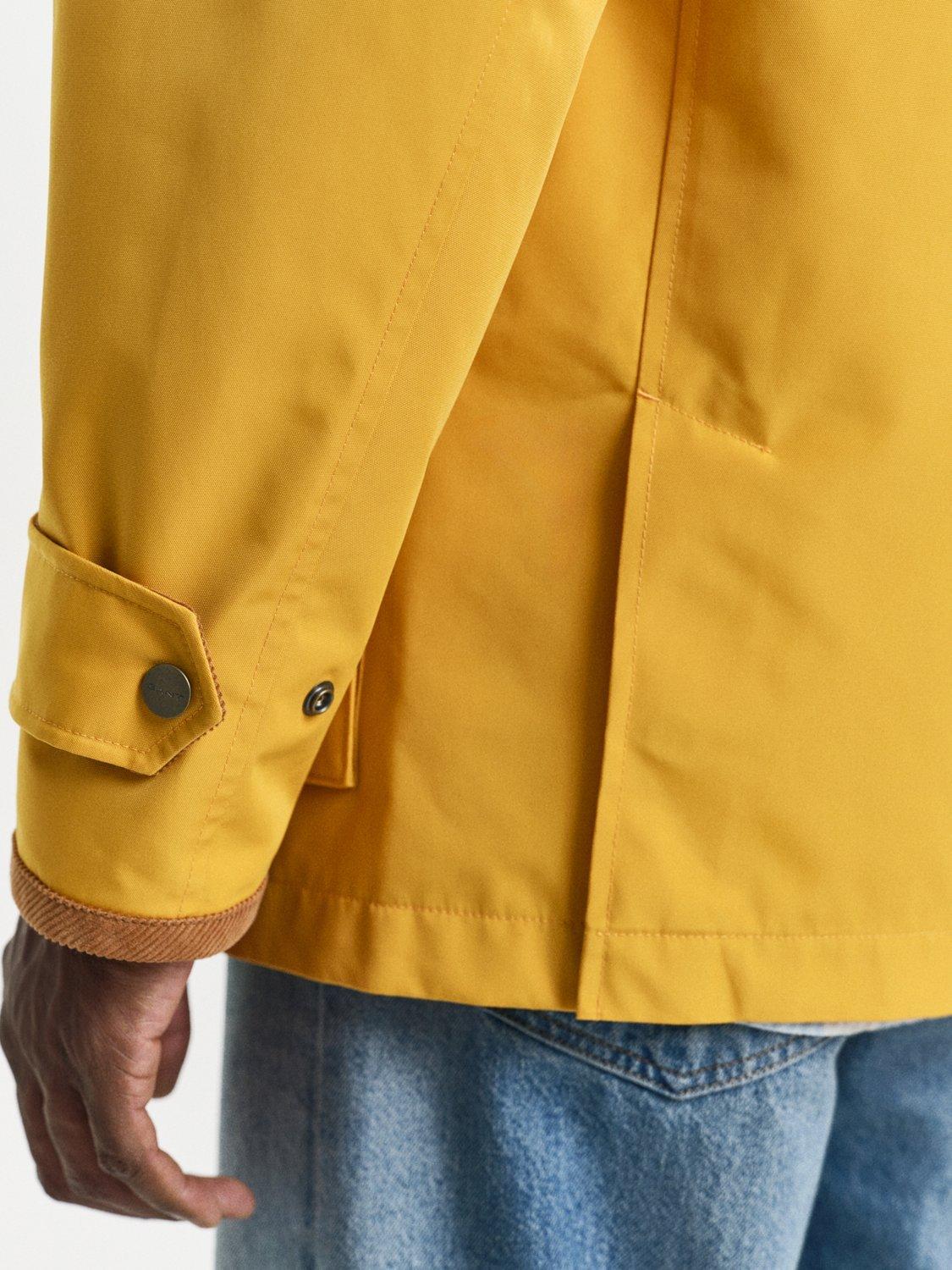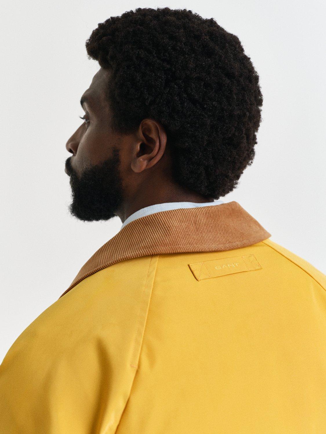 This mid-length decker jacket from GANT is crafted from recycled polyester and tailored for a regular fit. It features a press-button front placket with a hidden zip closure, adjustable sleeve cuffs, hand-warming side pockets, and lower patch pockets. The sleek corduroy collar adds a stylish touch, while the double vent at the back provides enhanced mobility. Finished with a fully lined interior and two additional pockets, this jacket is versatile for any season. This product is made with recycled polyester, aligned with GANT's sustainability strategy to support circularity.