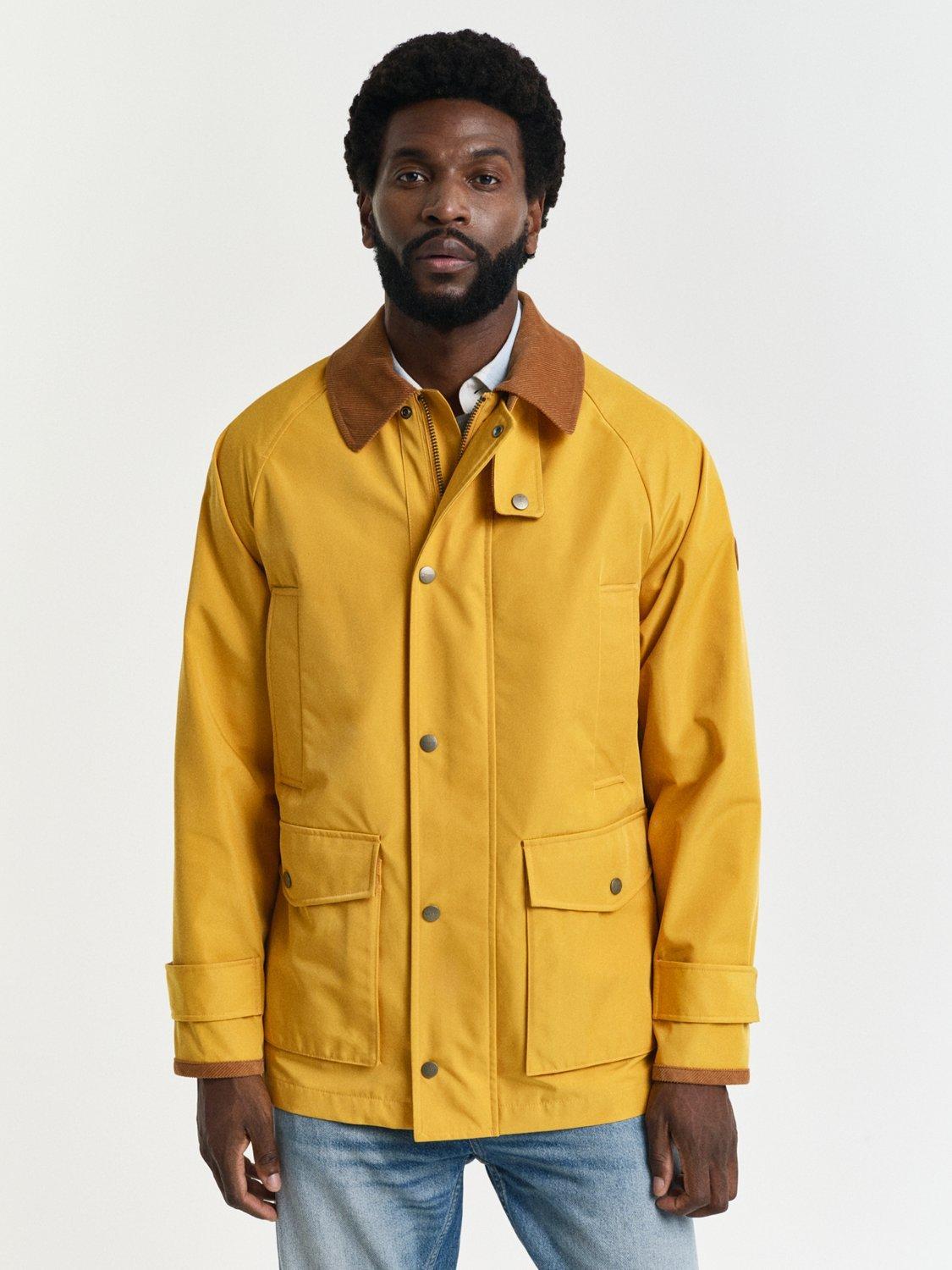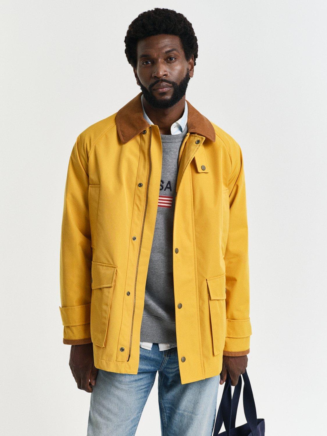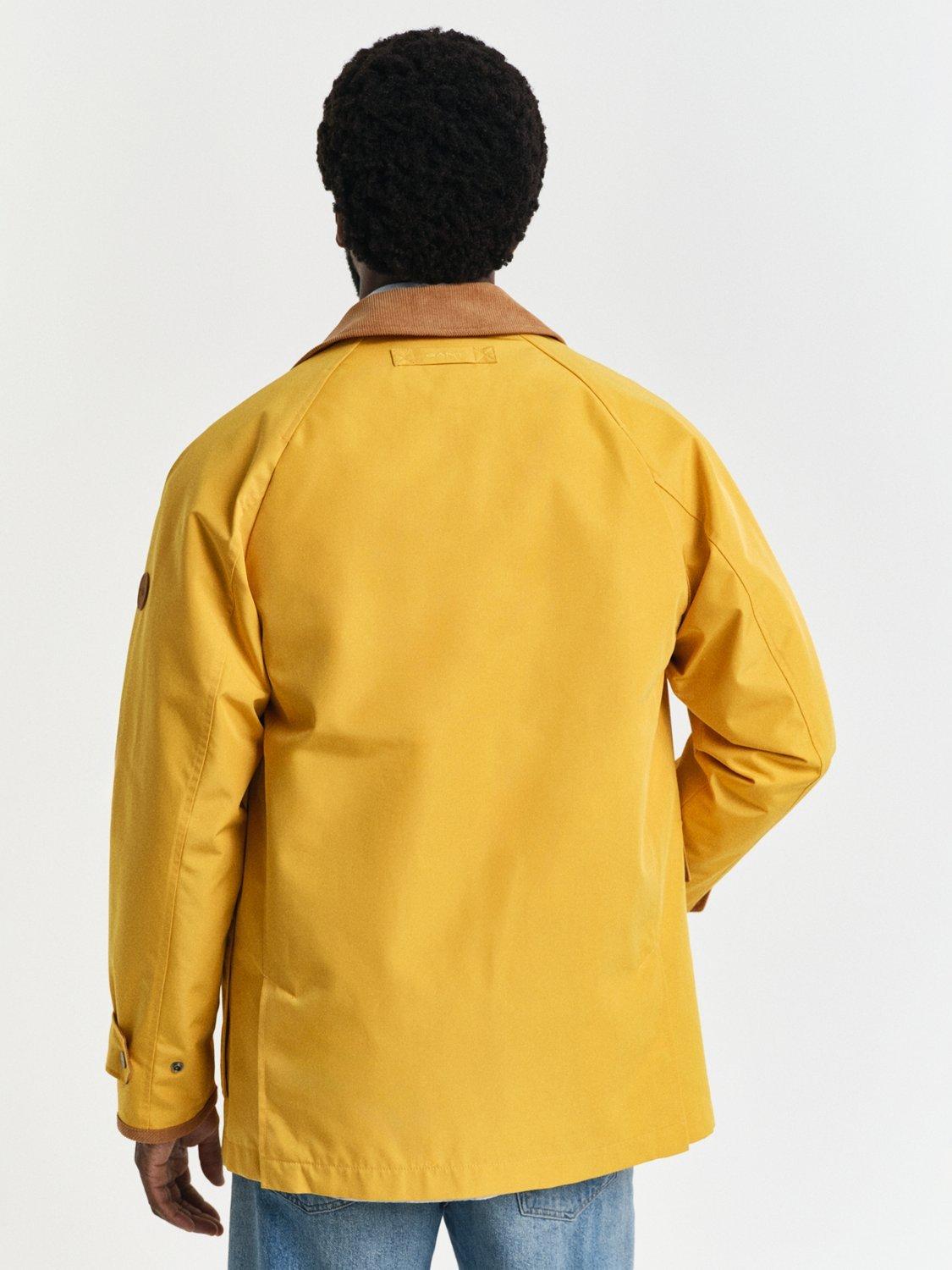 This mid-length decker jacket from GANT is crafted from recycled polyester and tailored for a regular fit. It features a press-button front placket with a hidden zip closure, adjustable sleeve cuffs, hand-warming side pockets, and lower patch pockets. The sleek corduroy collar adds a stylish touch, while the double vent at the back provides enhanced mobility. Finished with a fully lined interior and two additional pockets, this jacket is versatile for any season. This product is made with recycled polyester, aligned with GANT's sustainability strategy to support circularity.