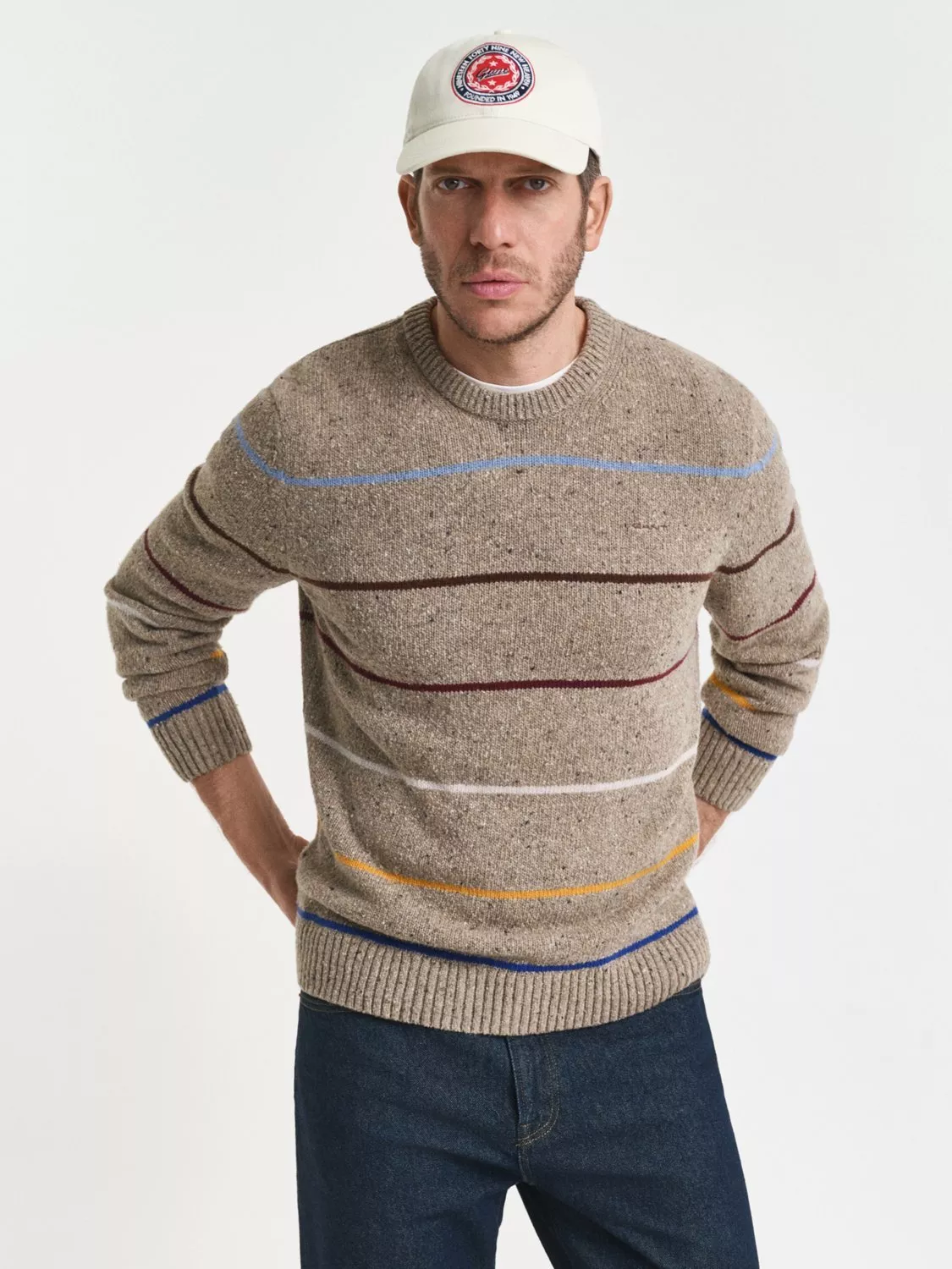 This knitted jumper from GANT, crafted from a soft Italian wool blend with Nepps yarn, creates a charming speckled effect. Featuring a multi-colored stripe pattern, it's designed for a regular fit and has a classic crew neck, ribbed hem and cuffs, and a subtle GANT logo embroidered at the chest, adding a touch of branding.
