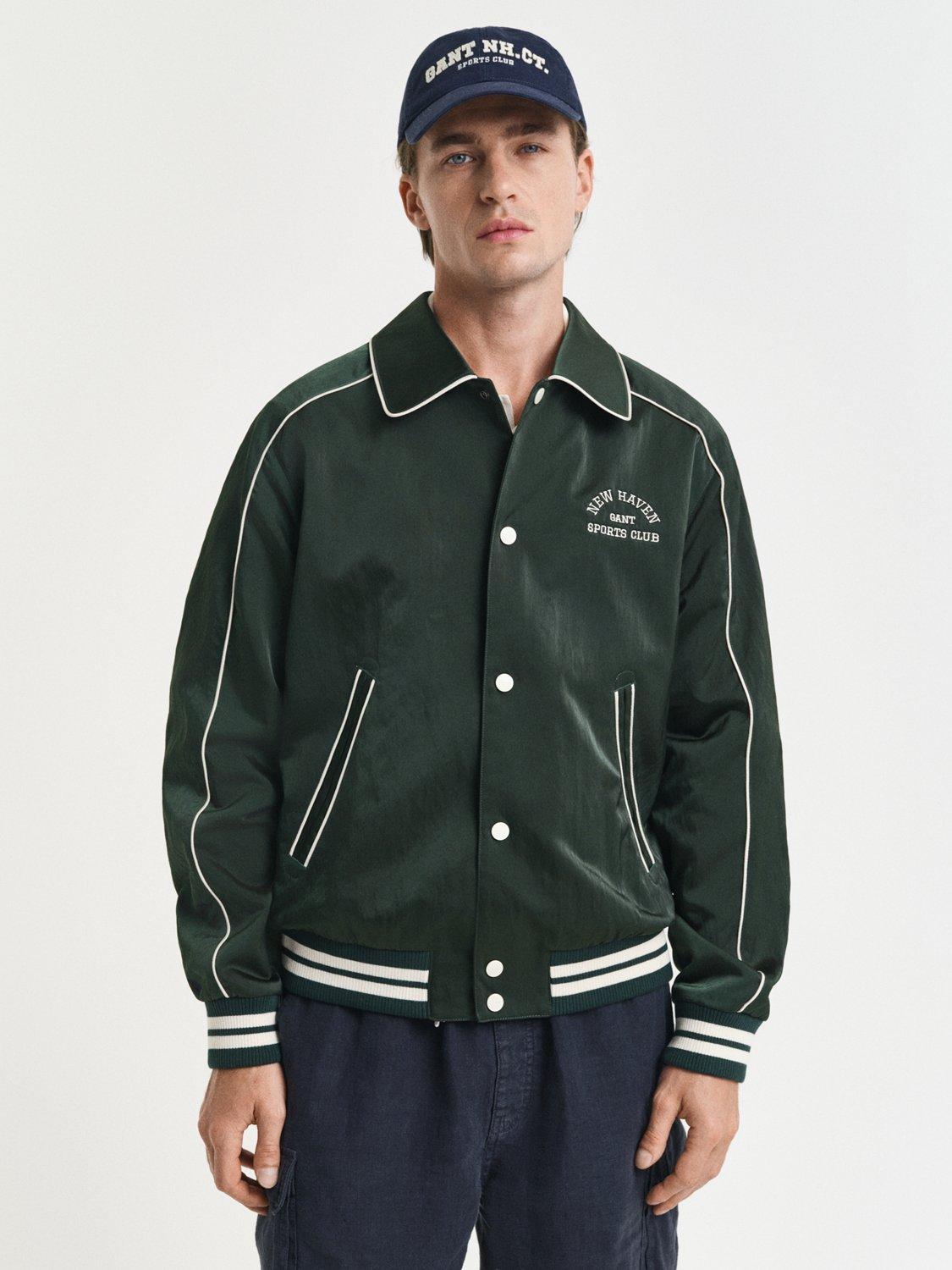 Inspired by sport club jackets, this piece from GANT is designed for a regular fit and finishes just above the hips. It features a synthetic shell with a water-repellent finish, ensuring durability and protection against the elements. The exterior showcases varsity-inspired details such as striped rib knit trims, a snap button closure, outline piping, and embroidery on the chest and back.