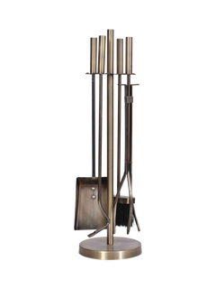 A tall and elegant four-piece fireside tool set crafted in an antique finish brass.