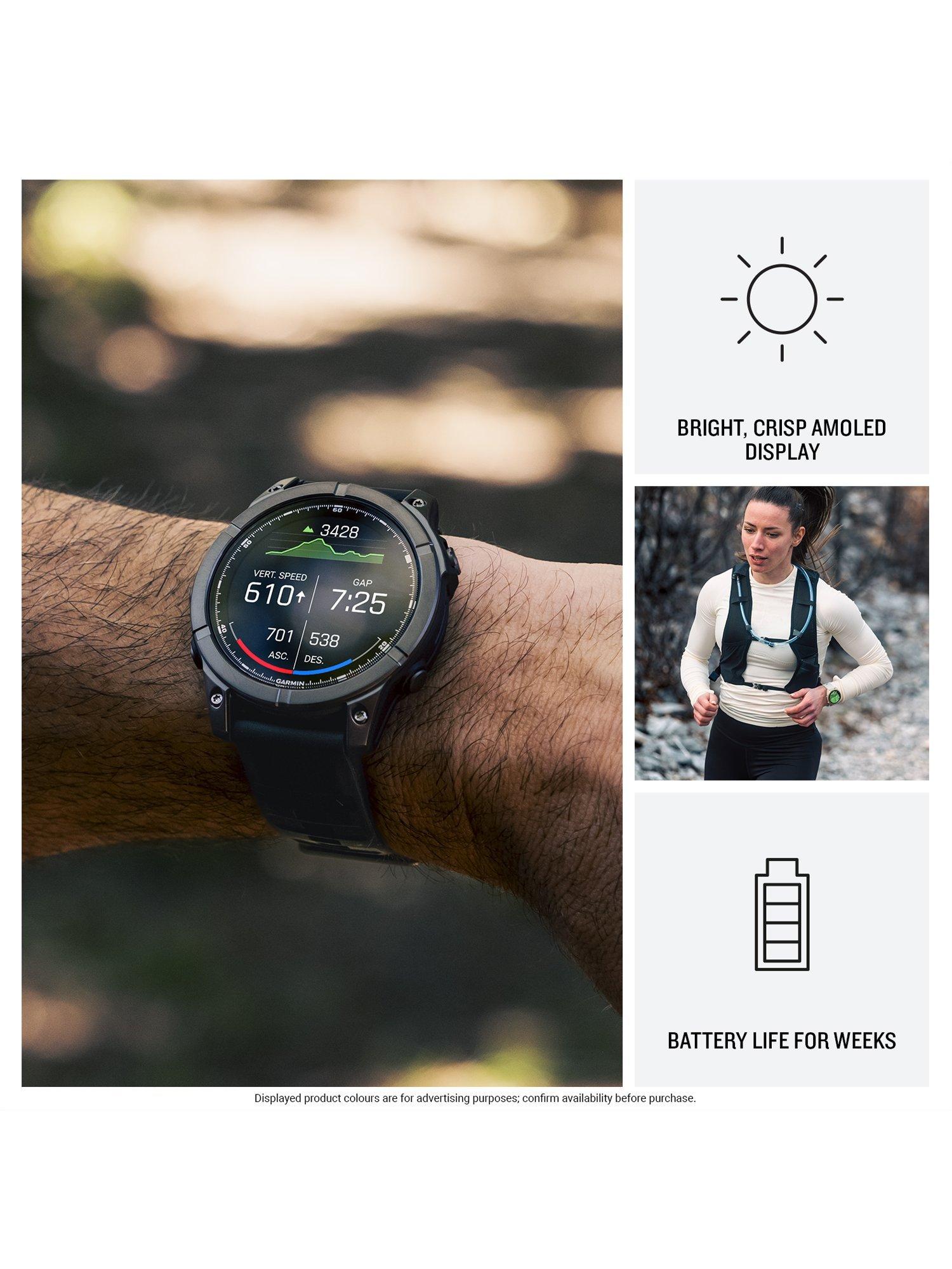 The fēnix E multisport GPS smartwatch is for athletes and adventurers who want to push beyond their limits with essential features at hand. The E model has a bright 1.3” AMOLED display and a stainless steel bezel. Power up with the latest in targeted strength training plans and built-in sports apps.