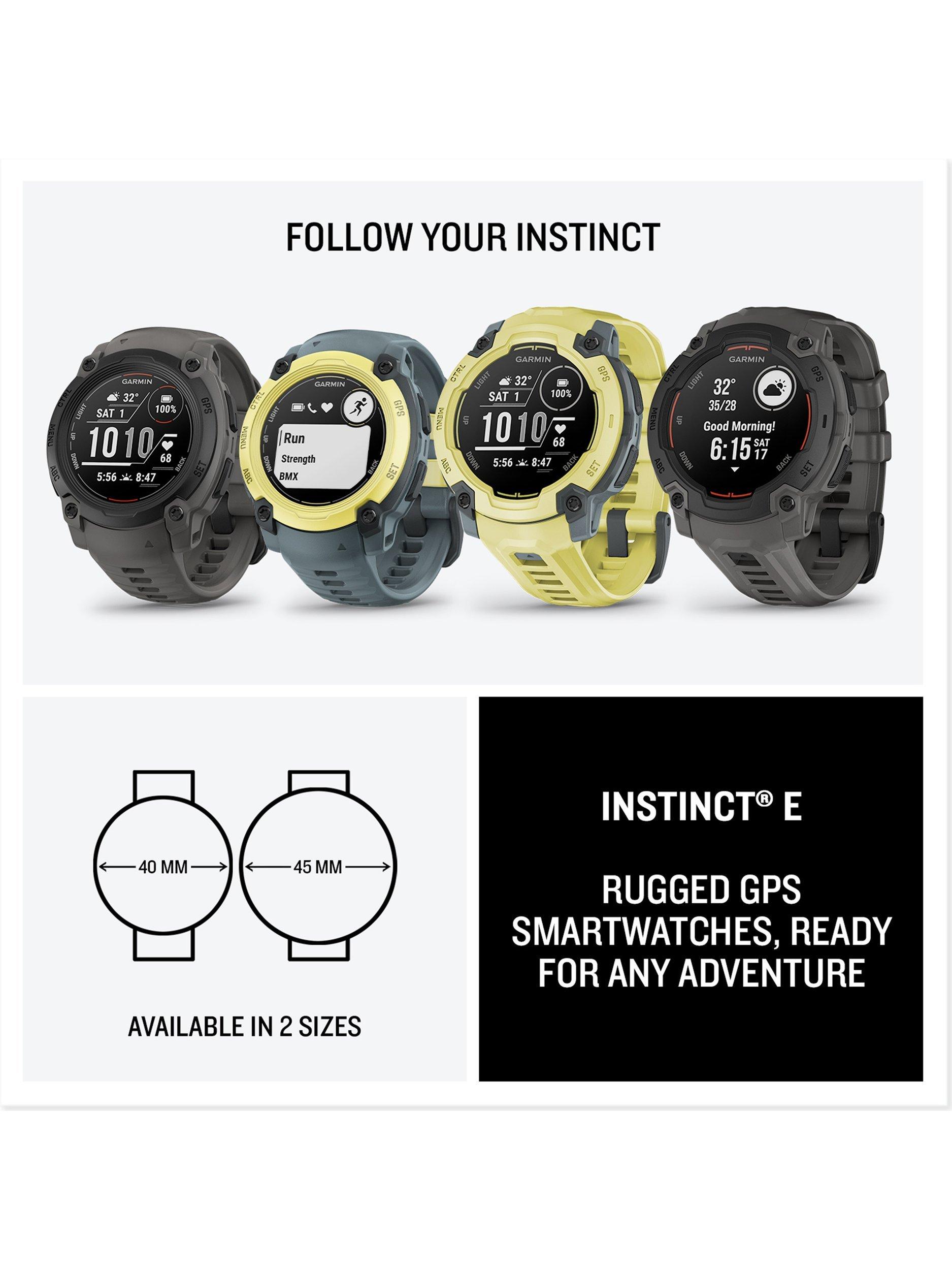 The Instinct E is the super-tough 40mm smartwatch that gets up to 14 days of battery life. It includes essential features such as smart notifications and Connect IQ Store compatibility. With its high-strength case and scratch-resistant lens, the Instinct E smartwatch can take on your toughest adventures.