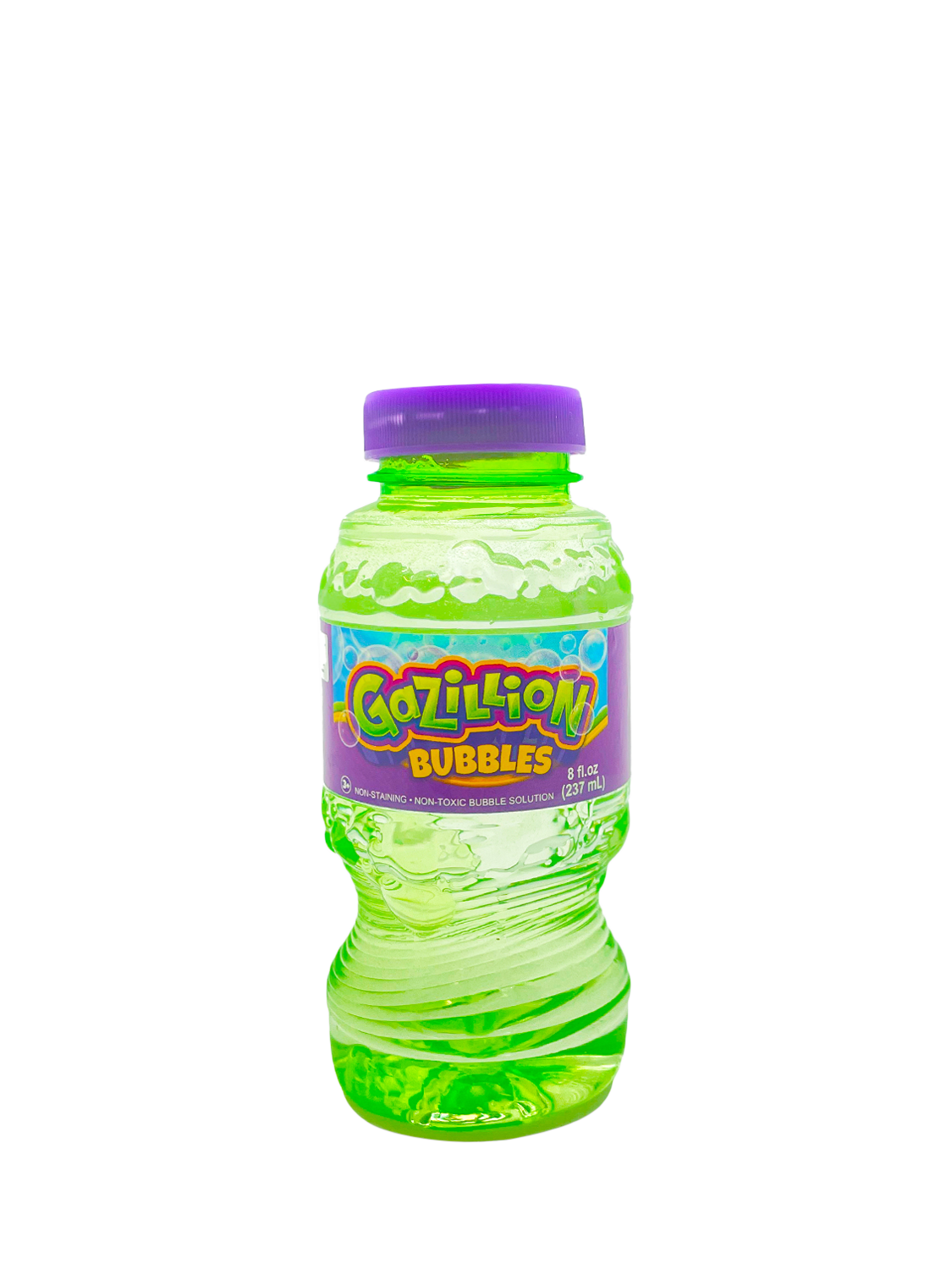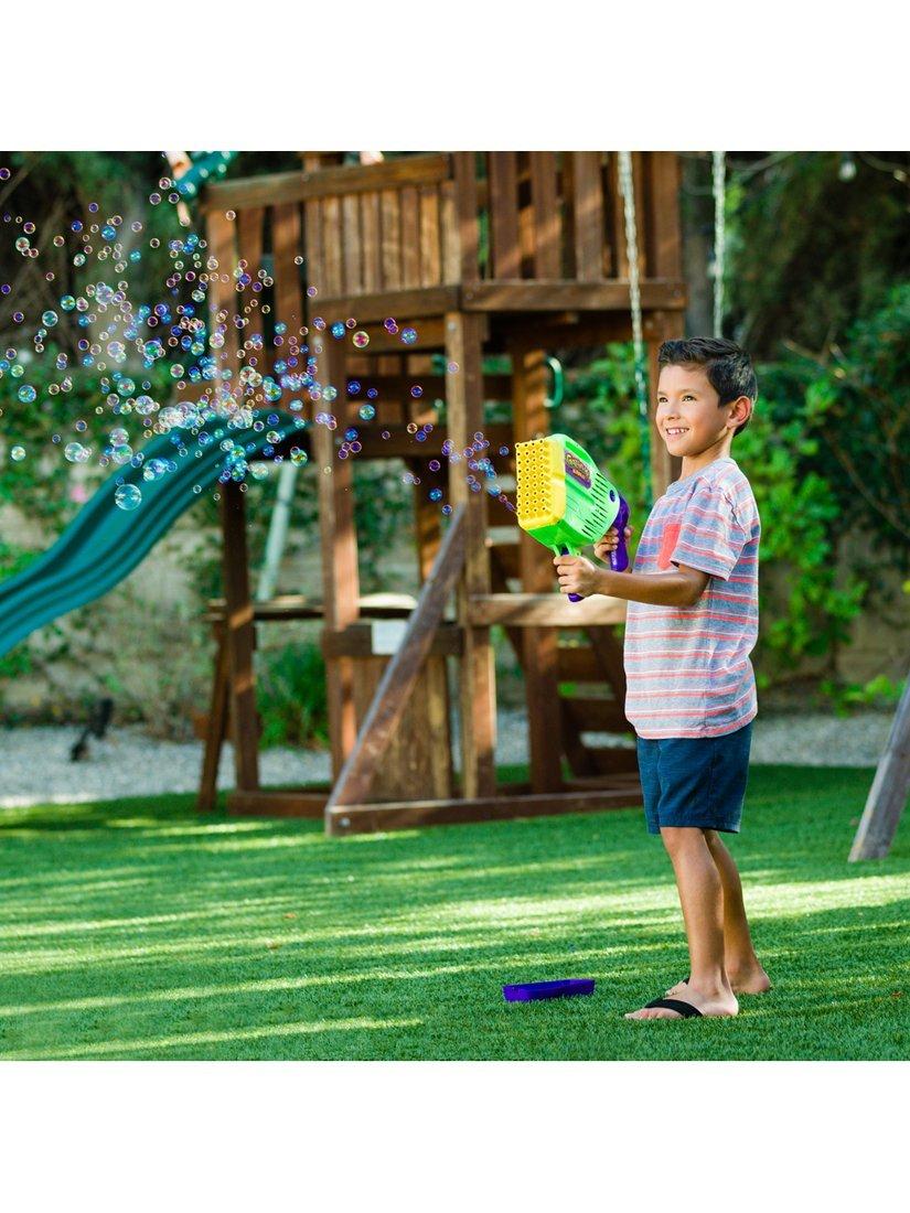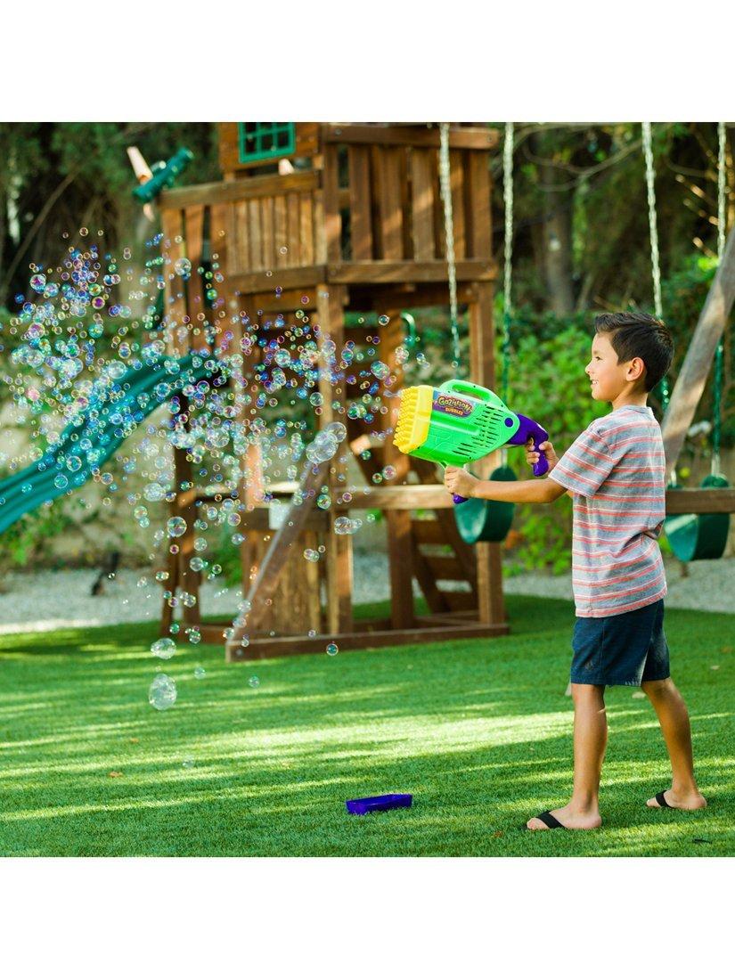 Simply dip the bubble blaster into a tray filled with Gazillion Bubbles' top-secret super solution, pull the trigger, and watch as a swarm of bubbles appears>