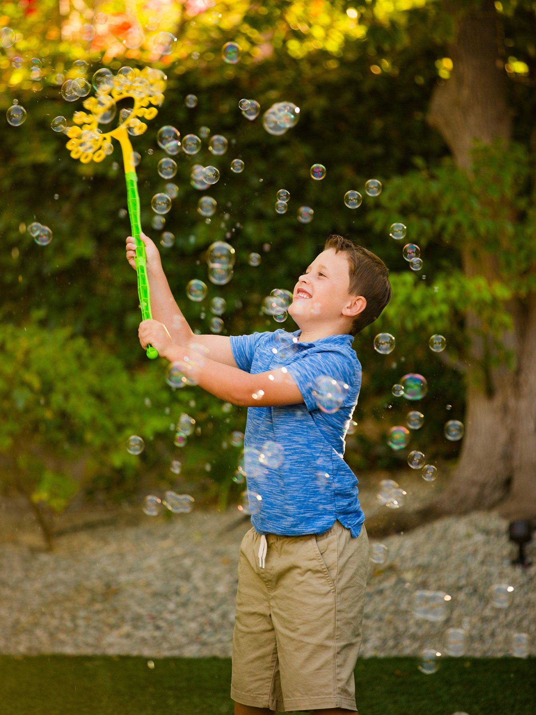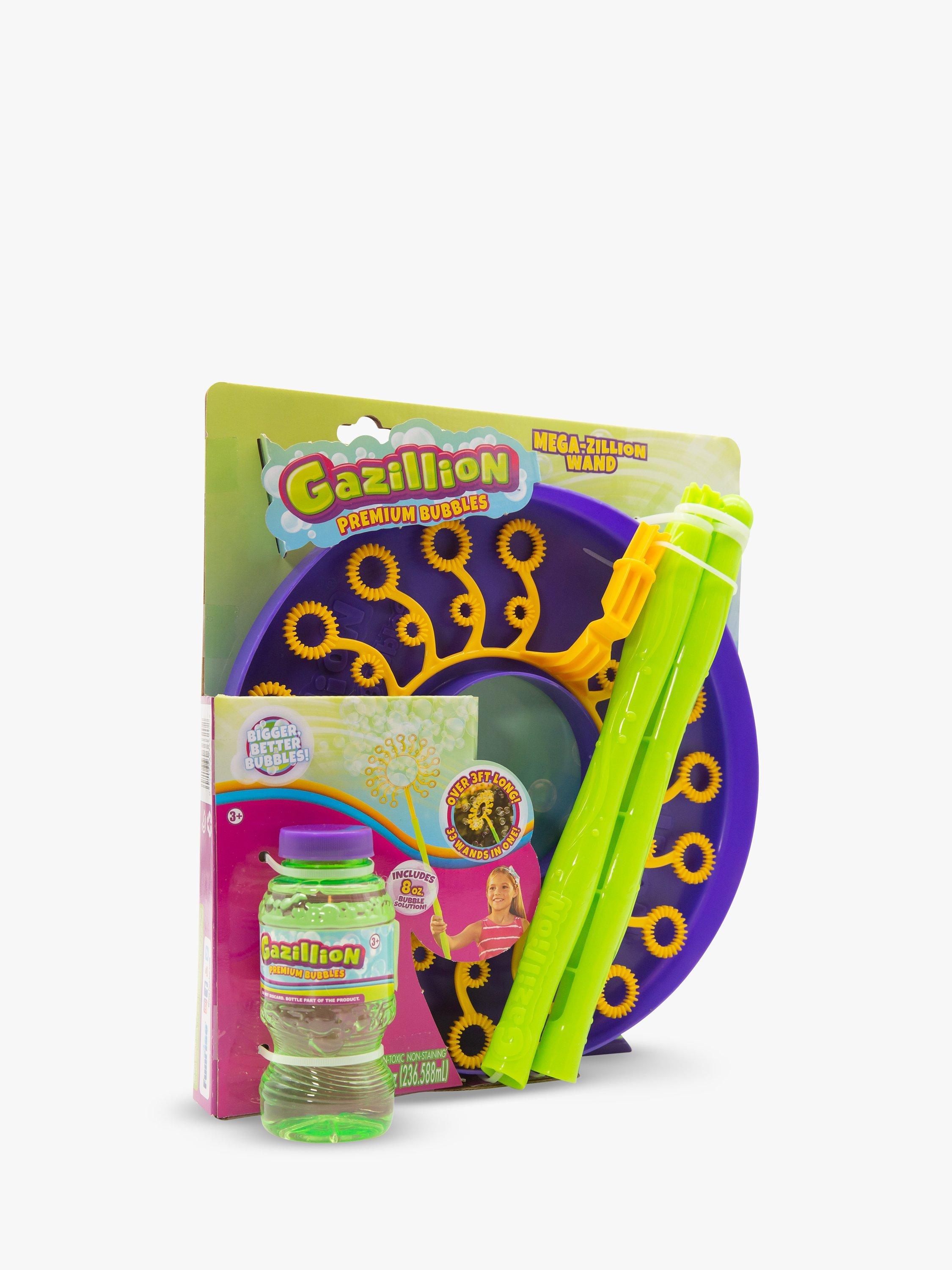 With the wave of a wand you can instantly create zillions and zillions of bubbles! With 33 mini wands in one plus the flexible 3ft. handle it is easy to make more and more bubbles. Simply fill the tray with Gazillion Bubbles solution, dip the wand into the tray, and wave around to make more bubbles than ever before! The tray is designed with a spout so once the bubble fun is over, pour any unused solution back into the bottle to be used next time!