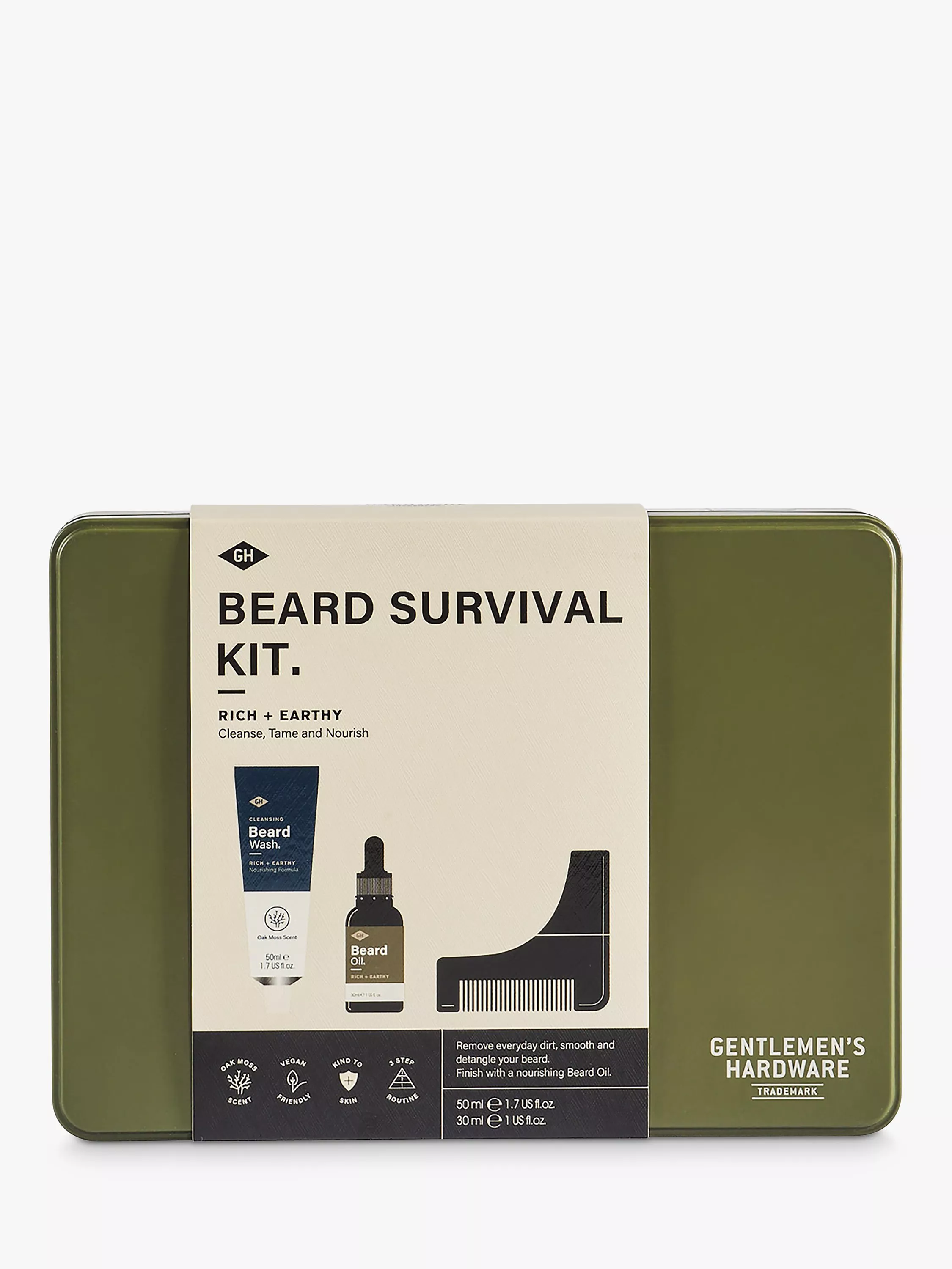 Packaged in a stylish reusable tin, the gift set contains a cruelty-free and vegan-friendly 50ml Beard Wash in a recyclable metal tube and 30ml Beard Oil with a rich and earthy Oak Moss scent, as well as a unique angled wooden Beard Comb.