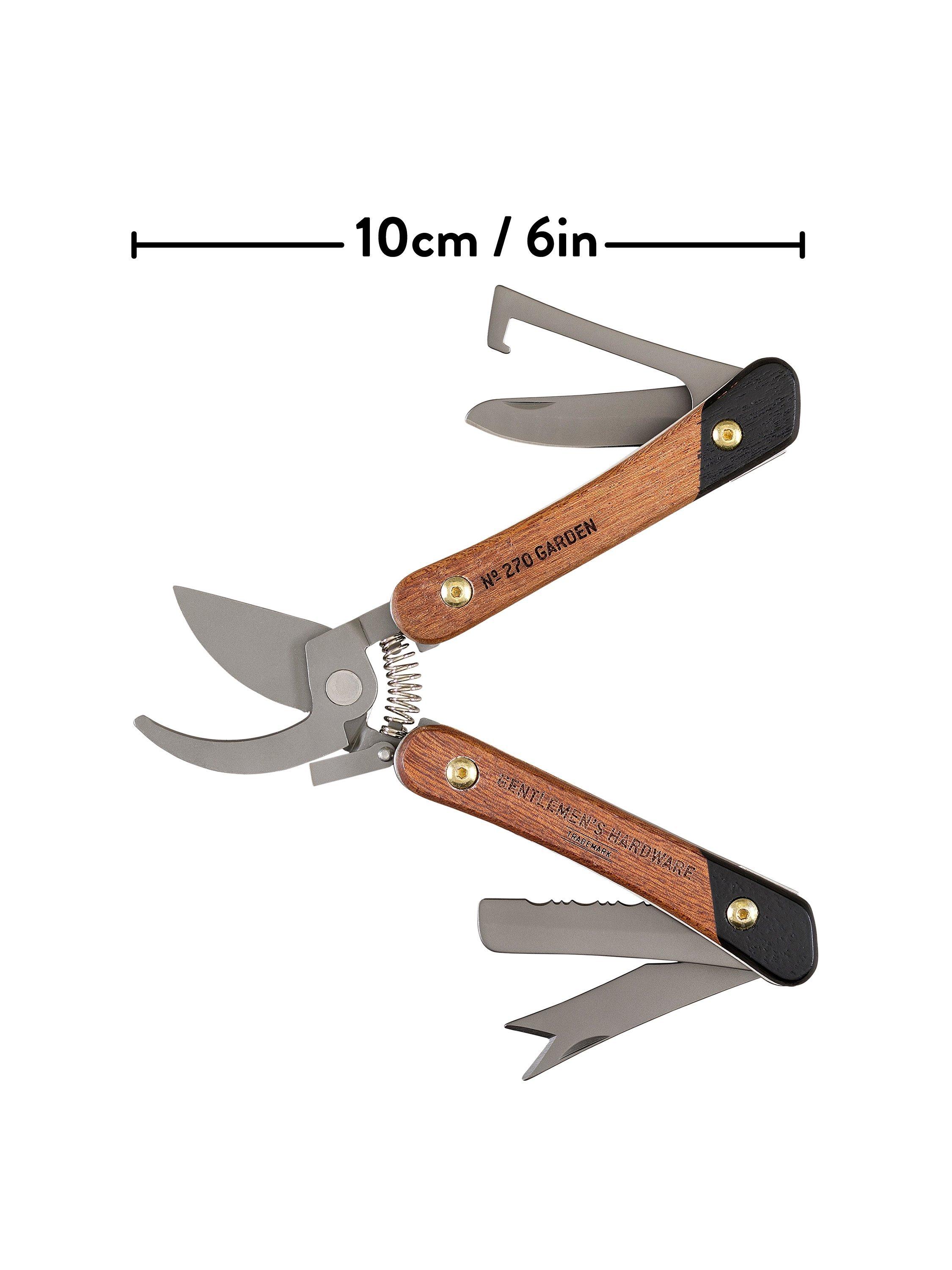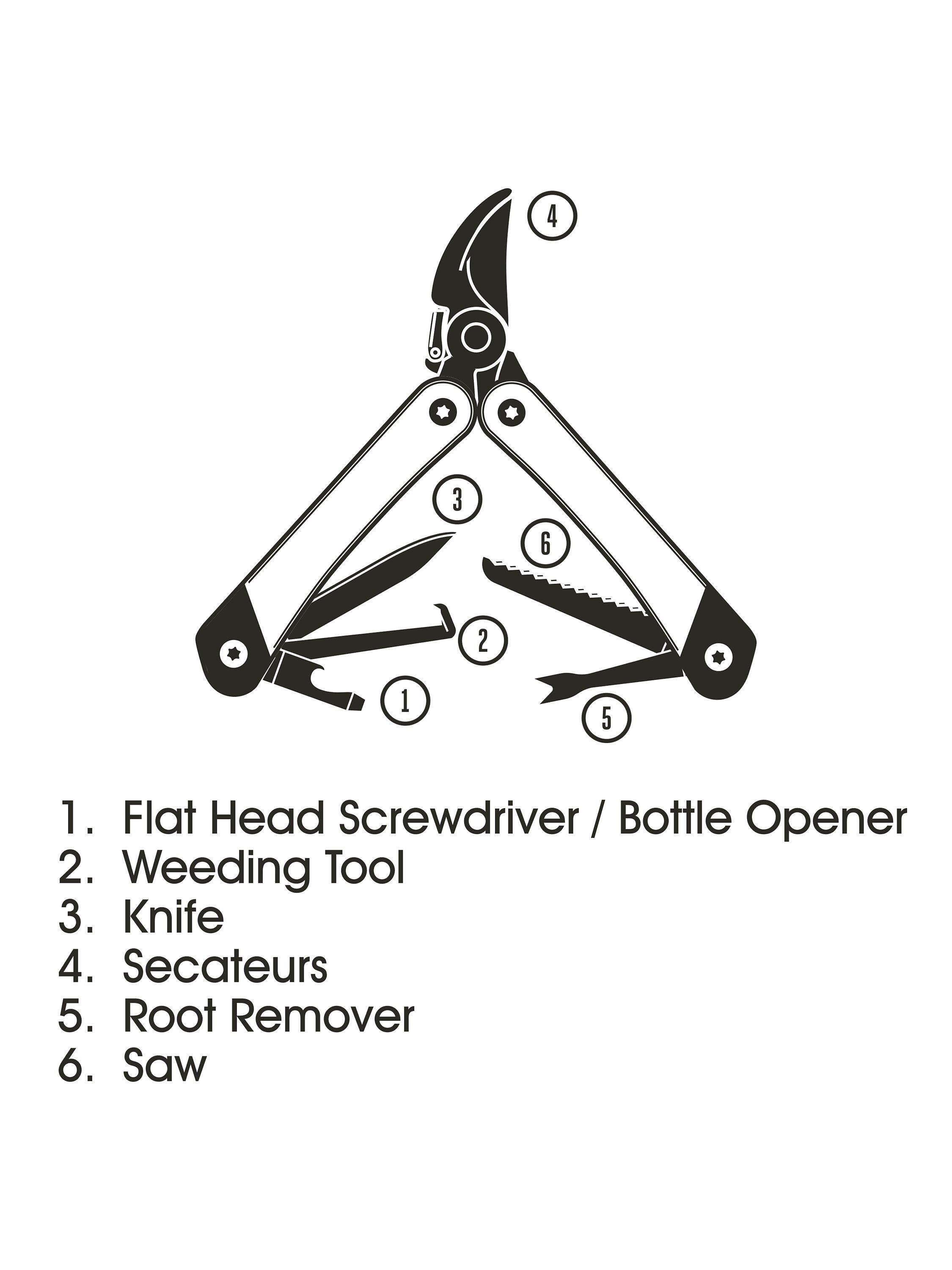 A 6-in-1 gardening tool with wooden handle. Includes 6 stainless steel tools: secateurs, root remover, weeding tool, knife, saw and bottle opener.
