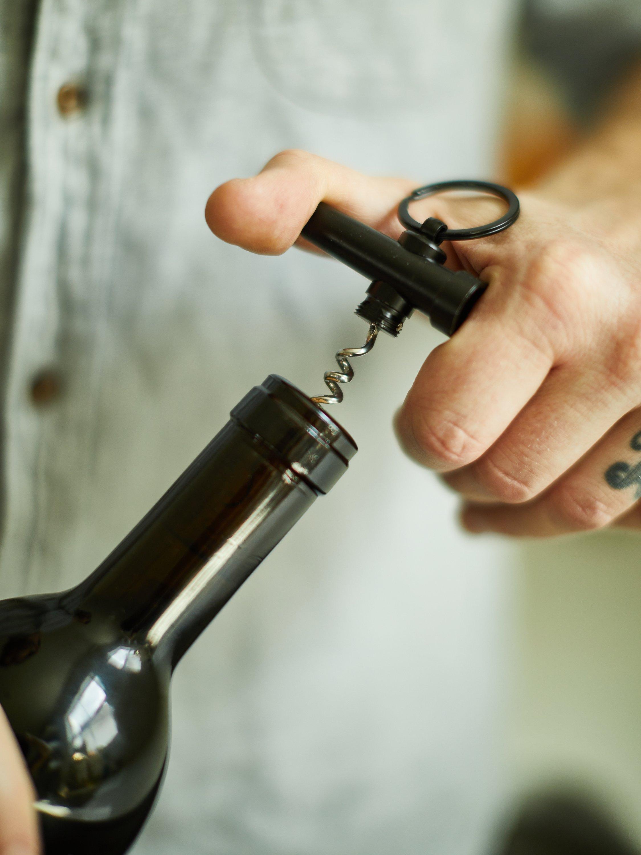 Keep the party going and the drinks flowing with a handy keychain corkscrew! This sleek black corkscrew is designed for opening corked bottles as well as capped, with a bottle opener function at the top of the keychain. To use as a corkscrew, simply remove the corkscrew handle and place it horizontally in the bottle opener groove for extra leverage. Twist, pop, and pour!