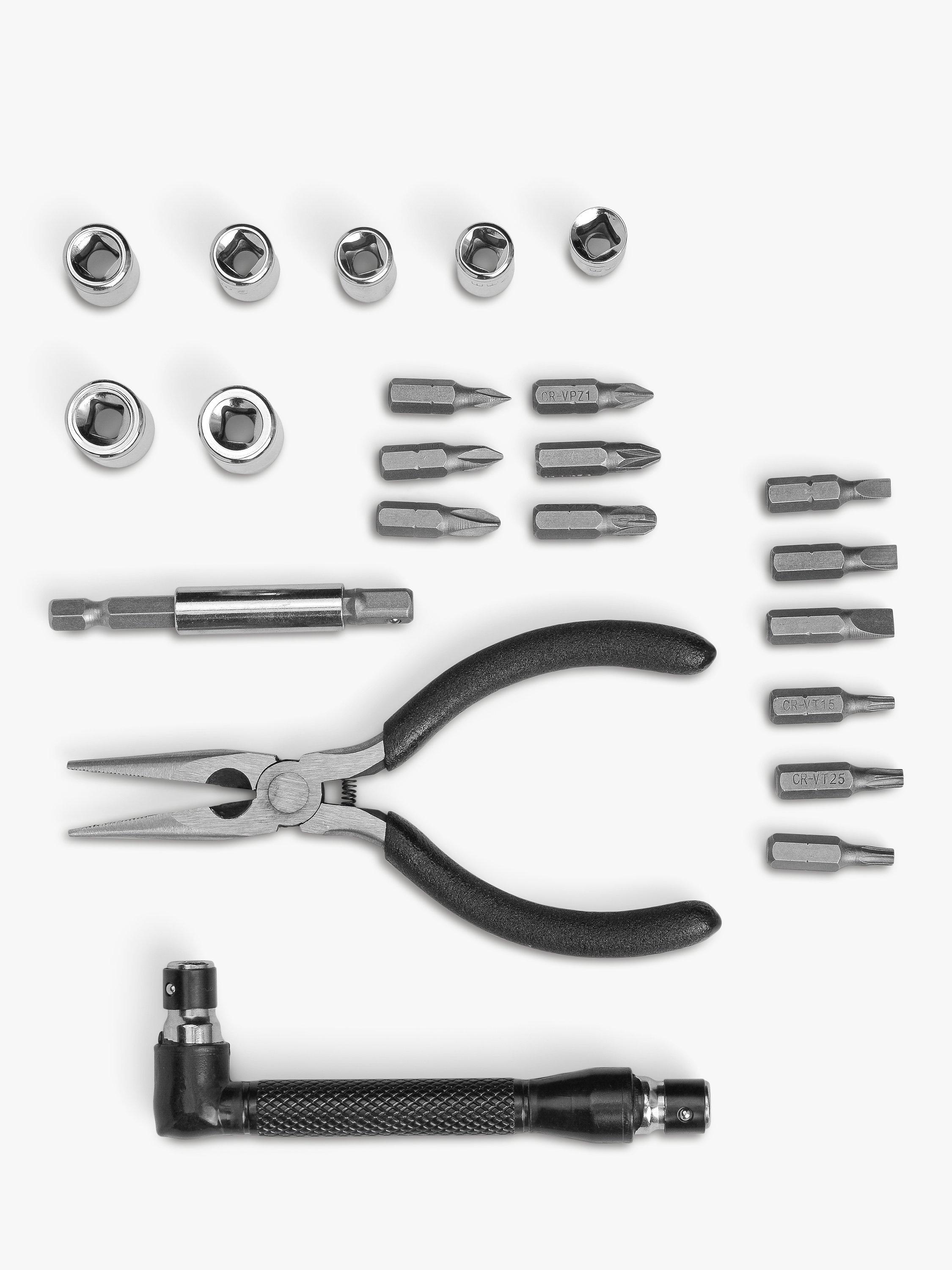This Compact Tool Kit gets the job done with a 19-piece mini bit/socket set and pair of needle nose pliers. Store everything easily in the included tin pouch with fabric lining for easy transport and clever gifting.