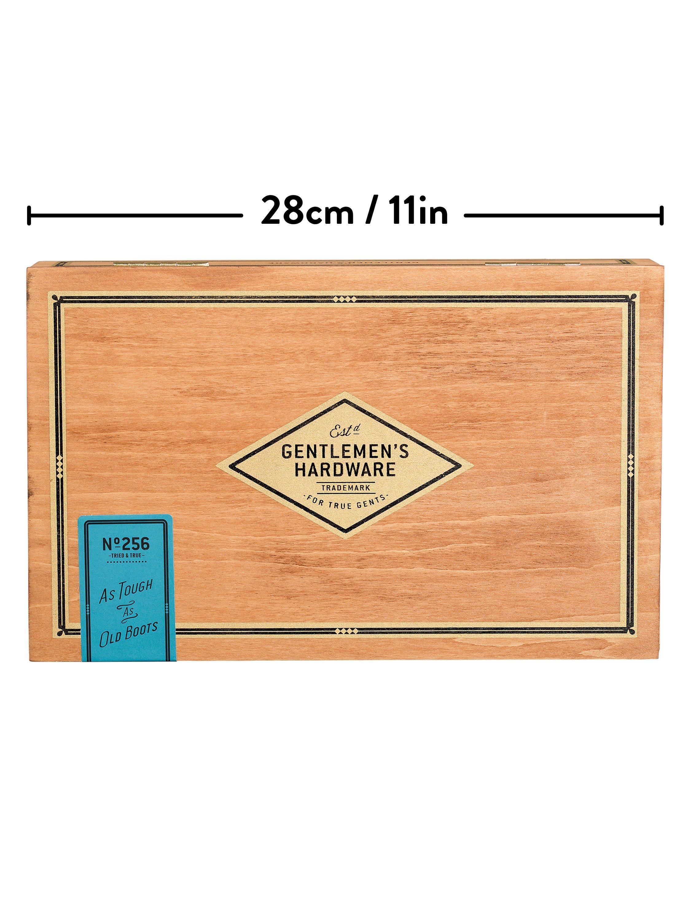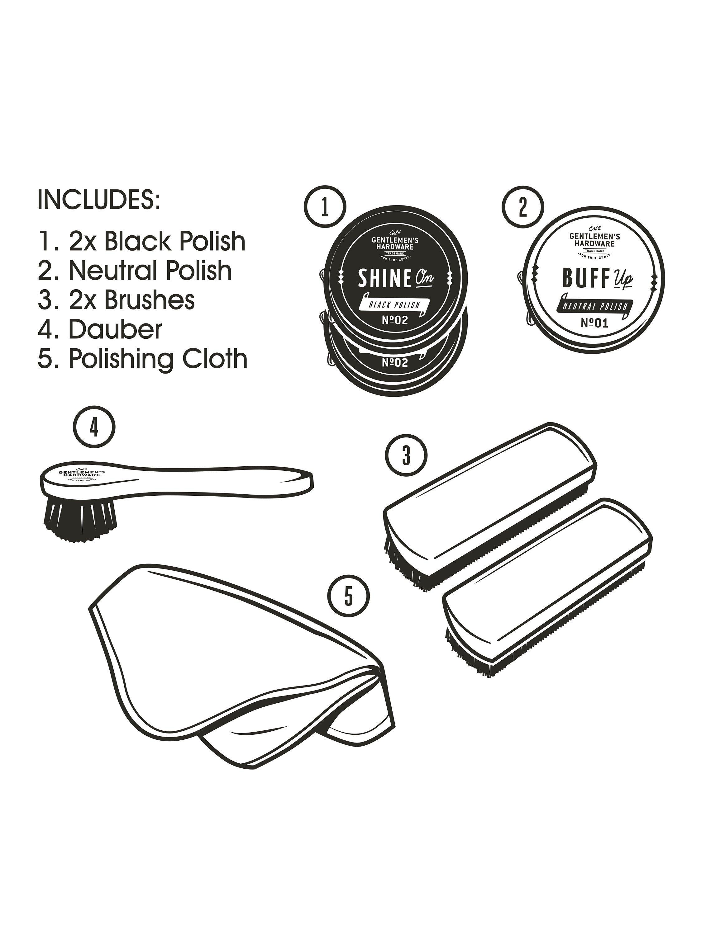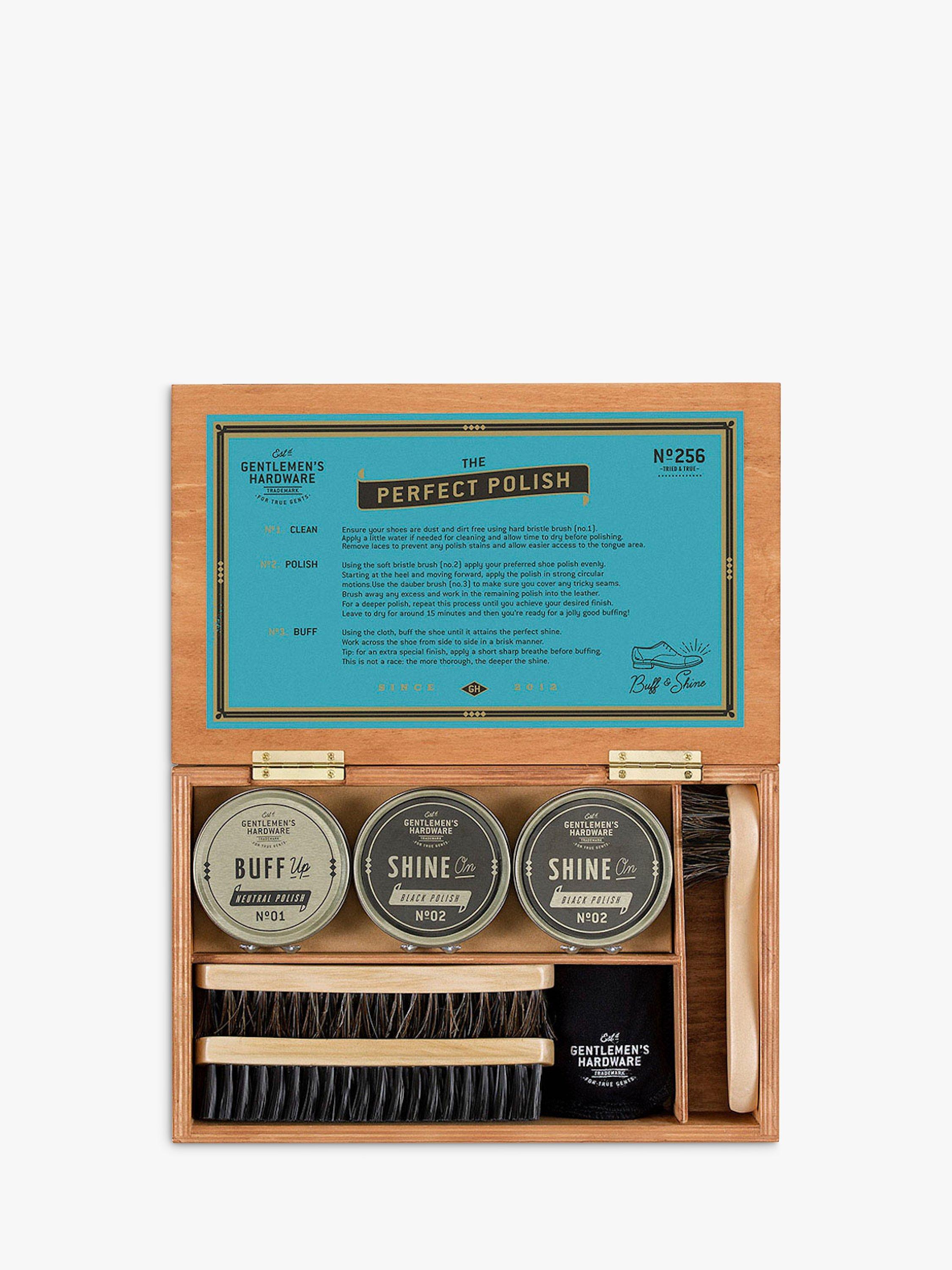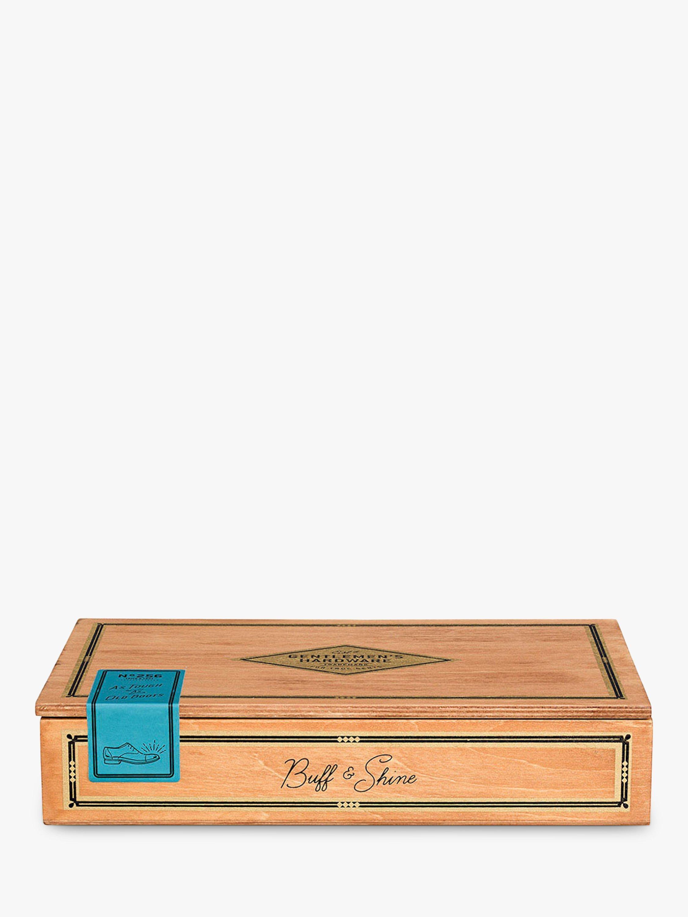 The classic wooden cigar box, re-purposed as a natty shoe-shine kit. With these tools of a shoe-shining pro, you'll have everything you need to put your best foot forward. Buff-up with black polish and add a glossy sheen with the neutral cream. Swipe away dirt and lift dullness with the traditional dauber brush and a hard buffing brush; add gleam by using the accompanying soft brush and polishing cloth. Each piece stows neatly in separate compartments, and there's a step by step guide to shiny-shoe excellence under the box lid
