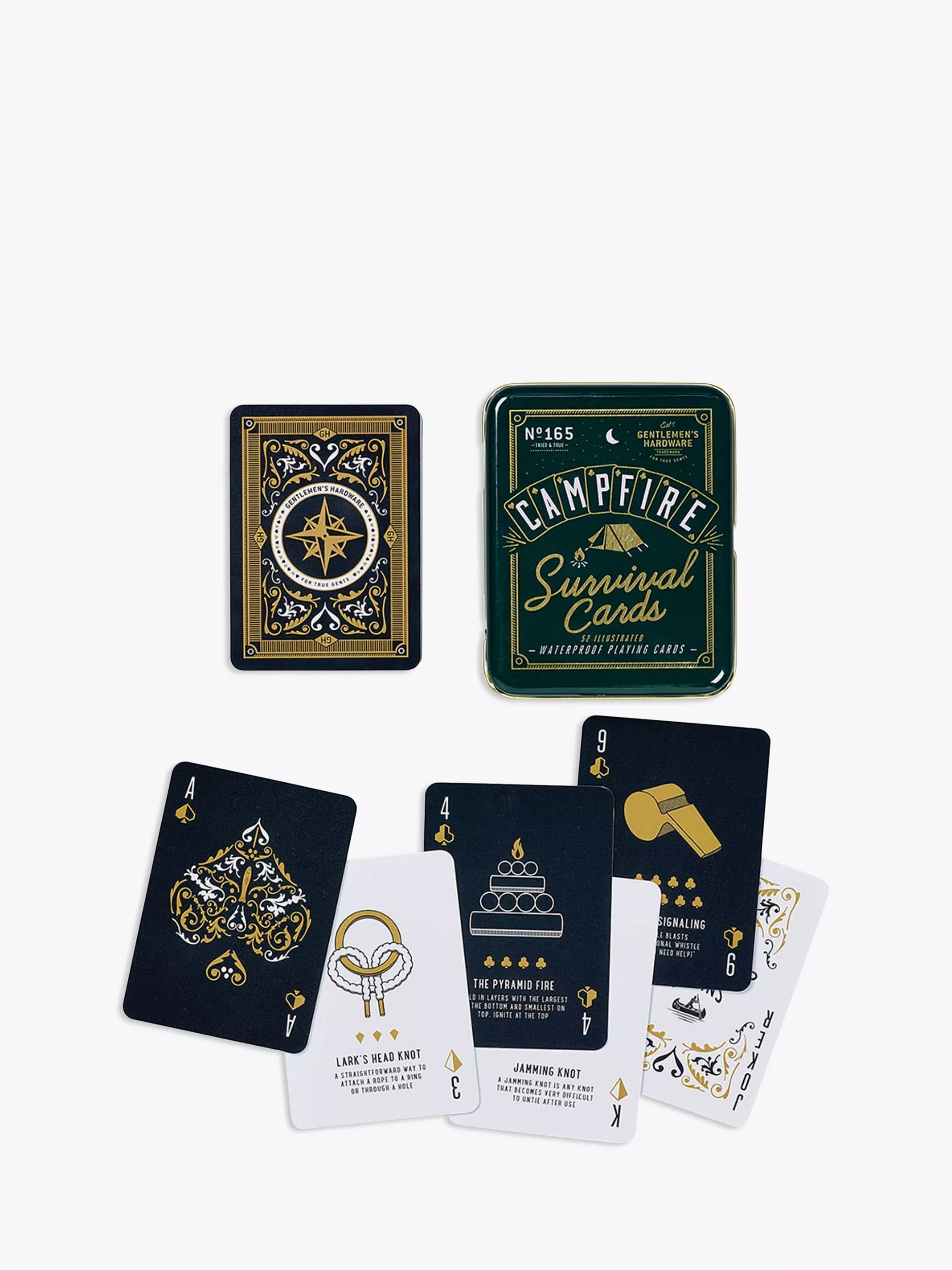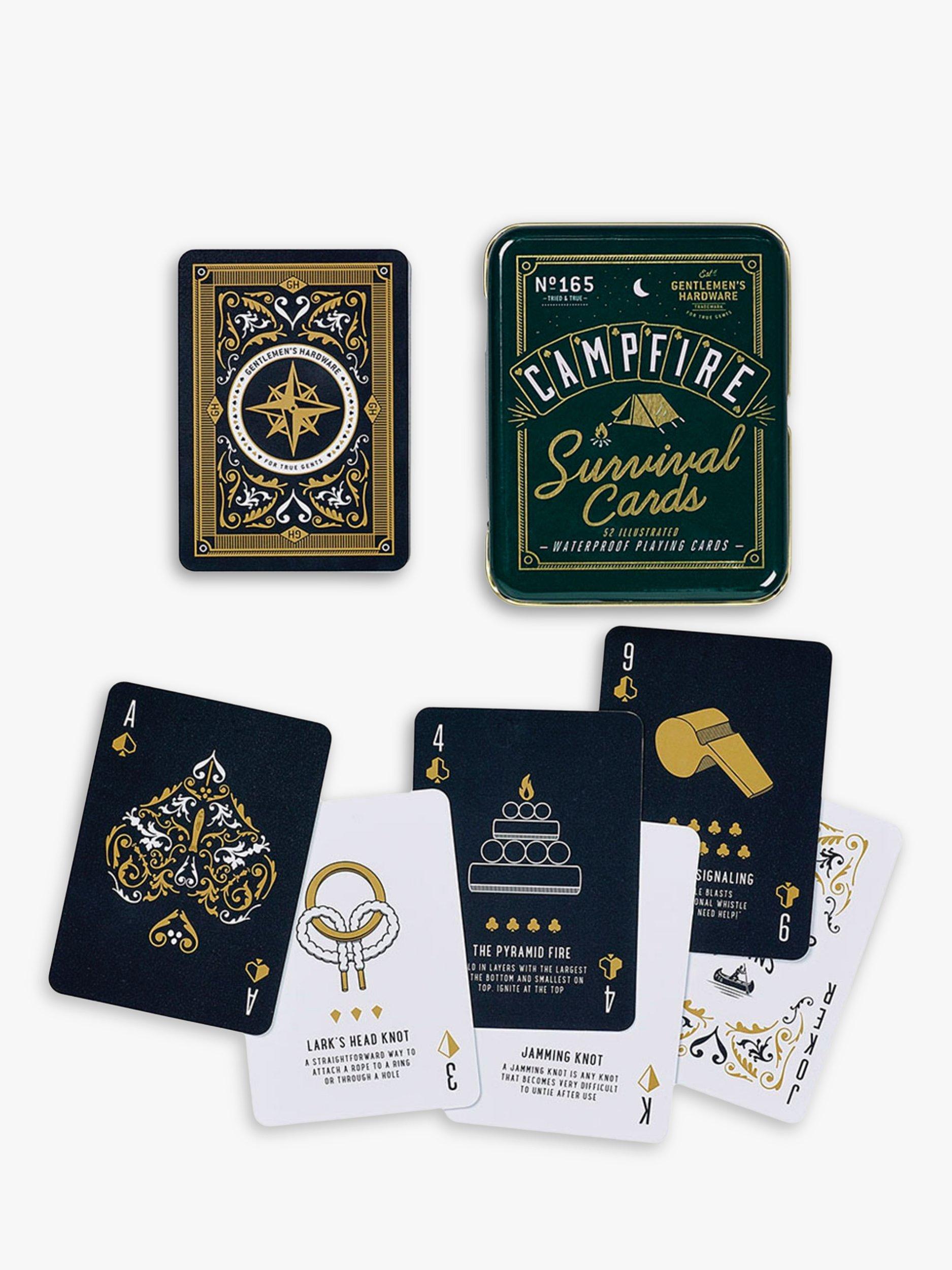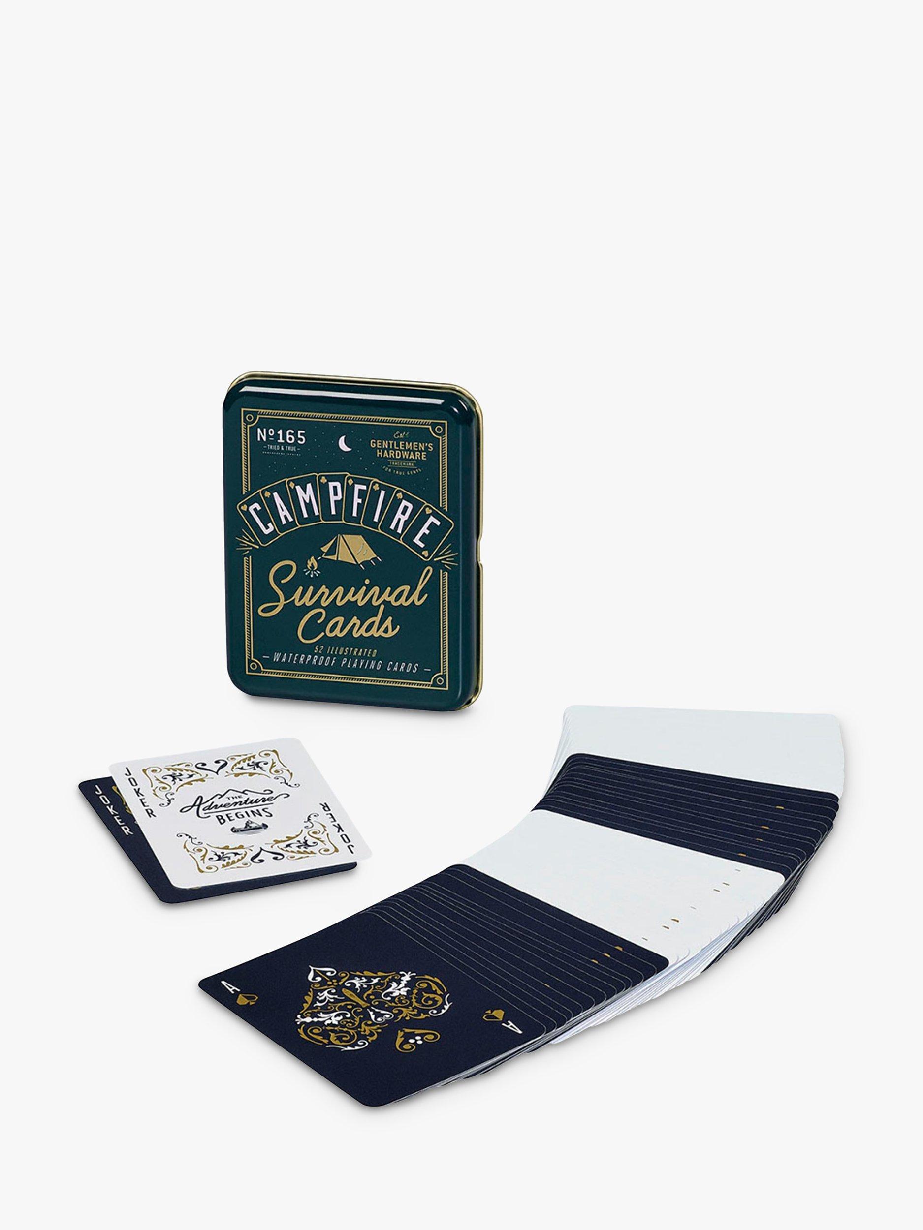 All-weather waterproof playing cards. Fully illustrated with a different survival tip or fact on each card. Packaged in a branded Gentlemen's Hardware tin.