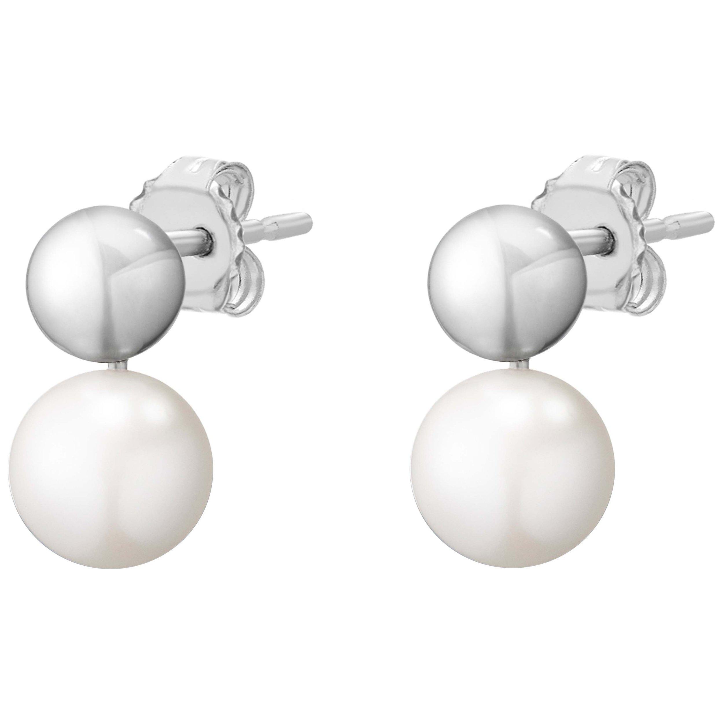 Made from sterling silver into a curved shape, the pair offers an effortless day-to-night versatility. The earrings come with two iridescent pearls and fasten with post fittings that are for pierced ears only.