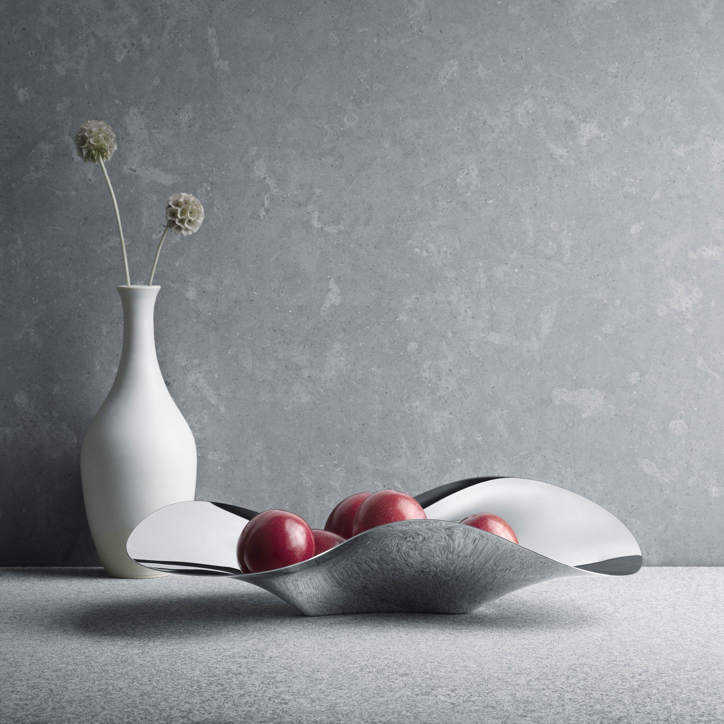 This bowl - designed by Helle Damkjaer for Georg Jensen - has a bold, ergonmic shape. It is a stunning decorative piece on its own, or would make the perfect dish for presenting smaller snack foods when entertaining.