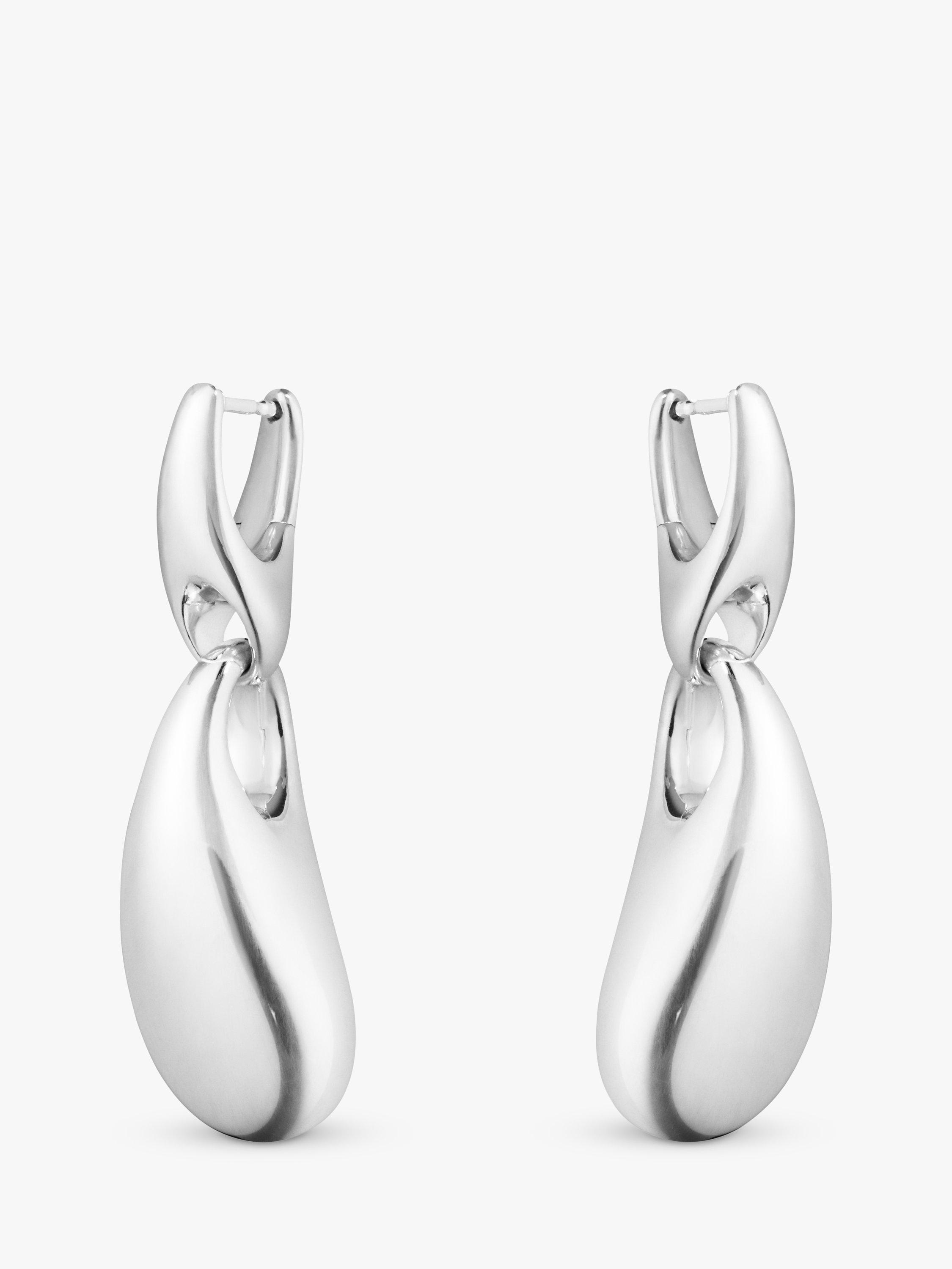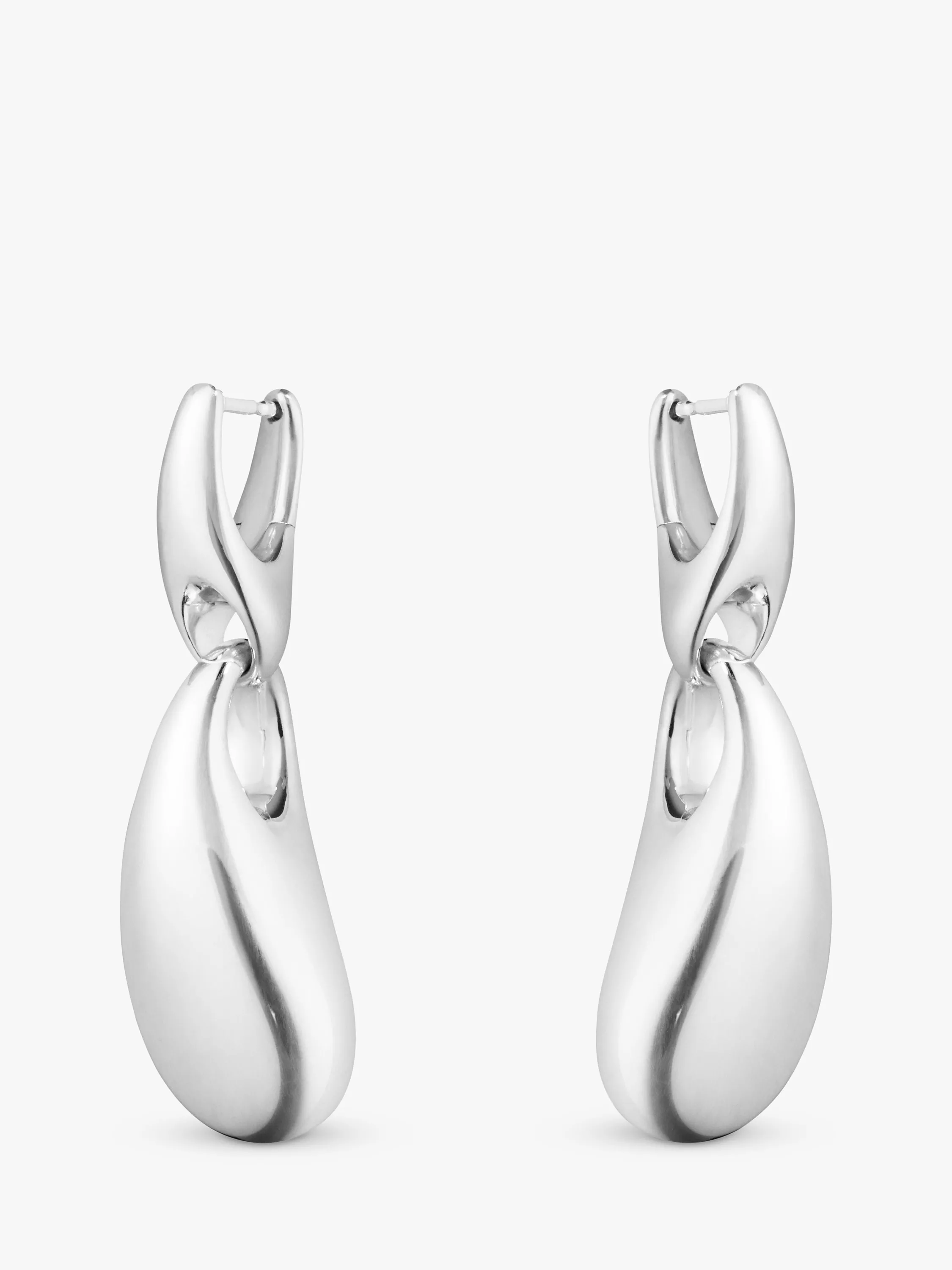 Two organic sterling silver forms are seamlessly linked together to form these sculptural and contemporary hinged hoop earrings. Designed by Jacqueline Rabun, the pieces combine a bold look with Georg Jensen's sculptural design language. Secured with post fittings, these earnings are for pierced ears only.