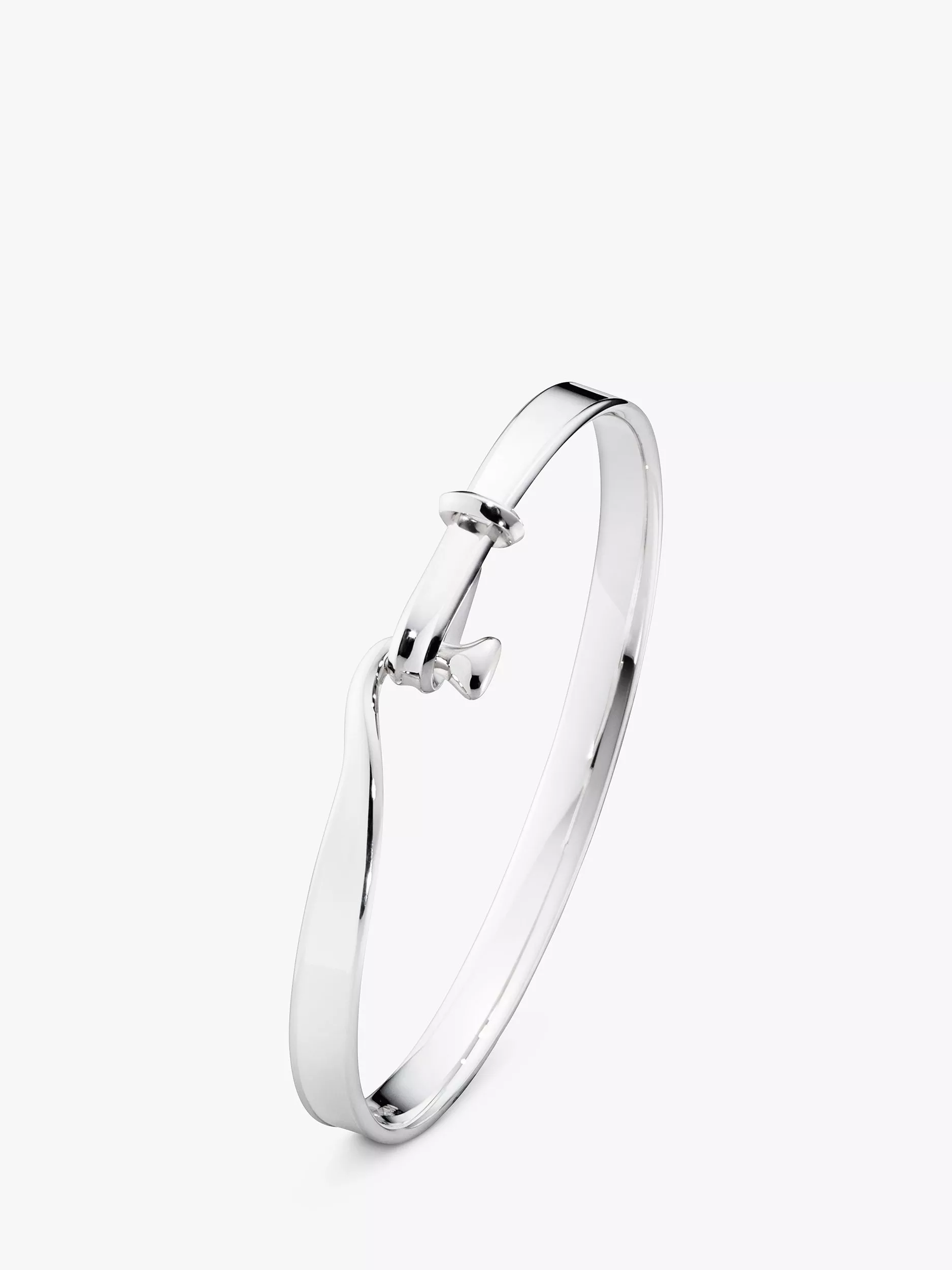 The bangle exudes a cool versatile charm with its polished sterling silver texture. It features a ring-shaped charm and a curved hook-inspired clasp.