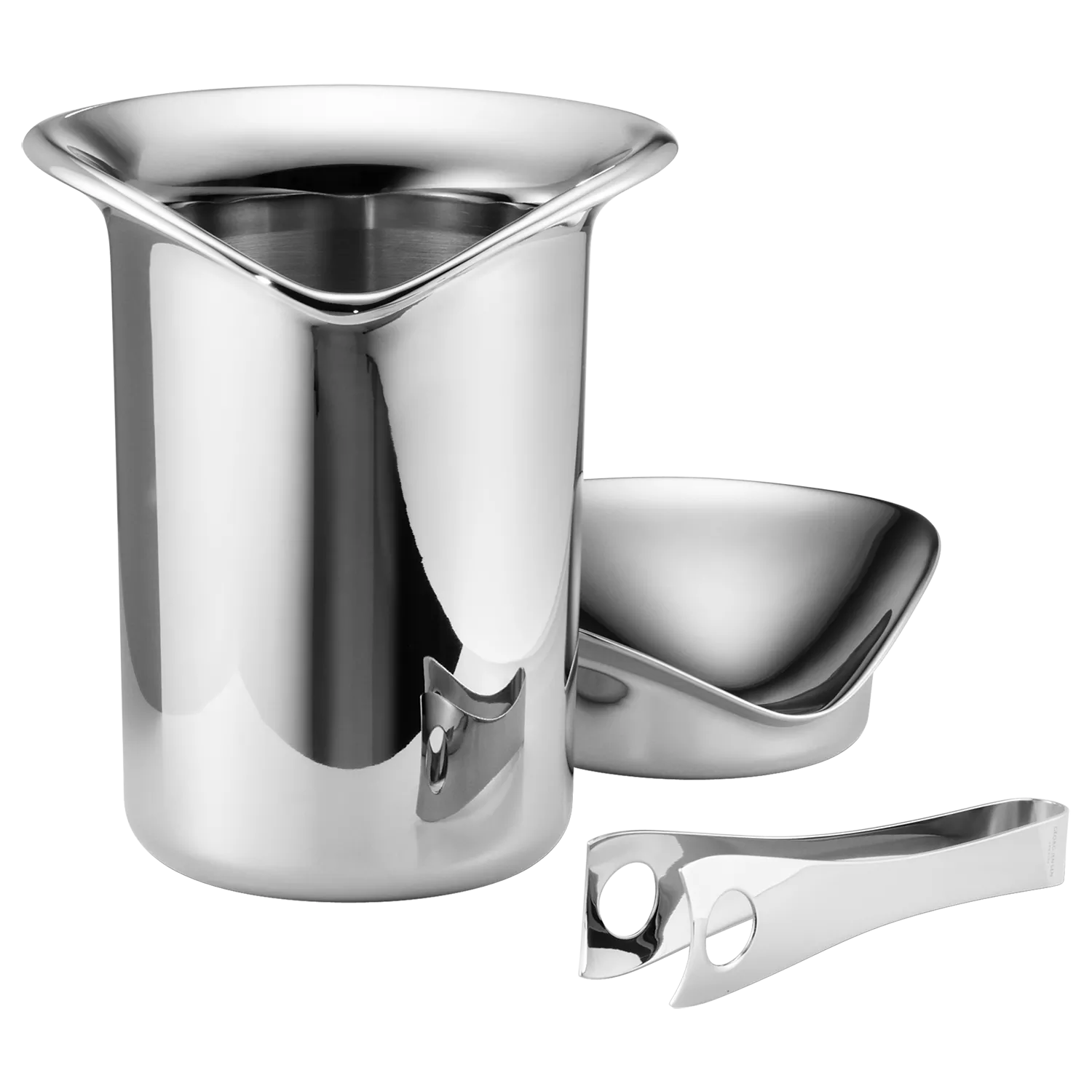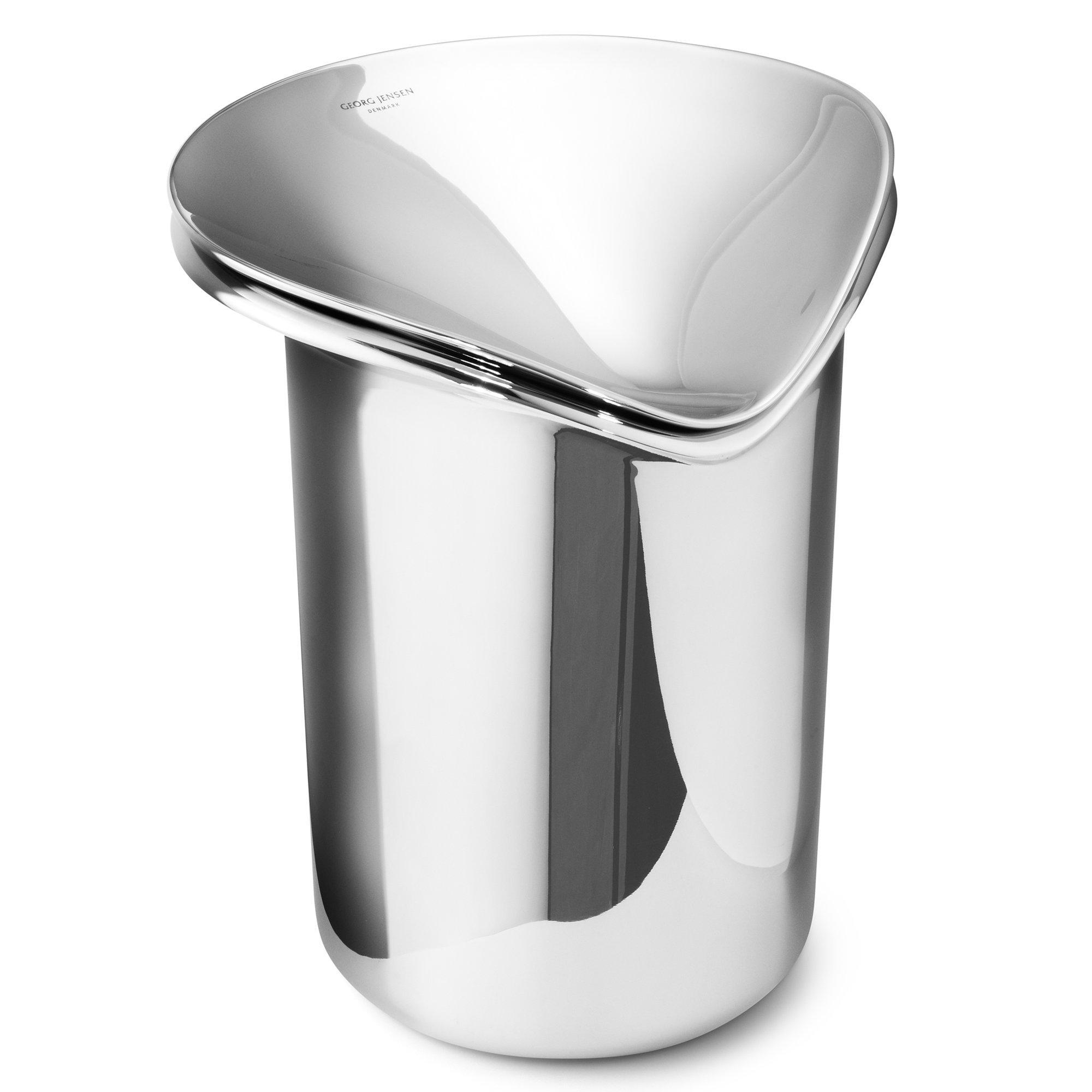 Designed by Thamas Sandell for Georg Jensen this sleek stainless steel ice bucket displays a bold, sculptural form. It is a thoroughly modern and forward-looking take on a classic, functional object.
