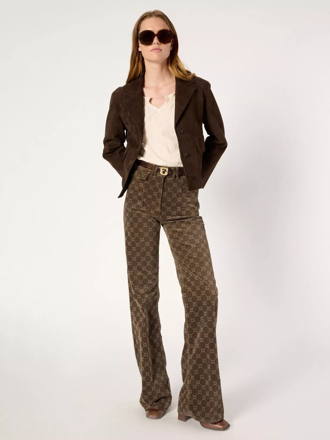 A masterclass in proportion, opt for this pair of flared trousers by Gerard Darel crafted from a logo printed cotton-blend fabric. They feature a mid rise with a button and zip fastening and a regular length.