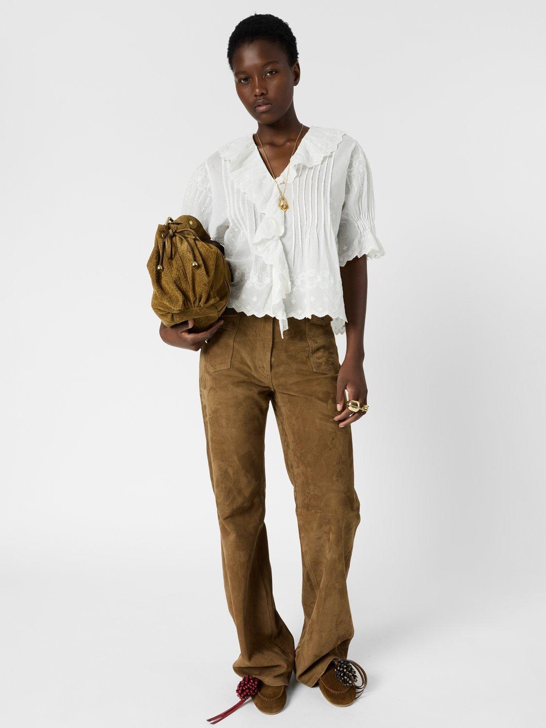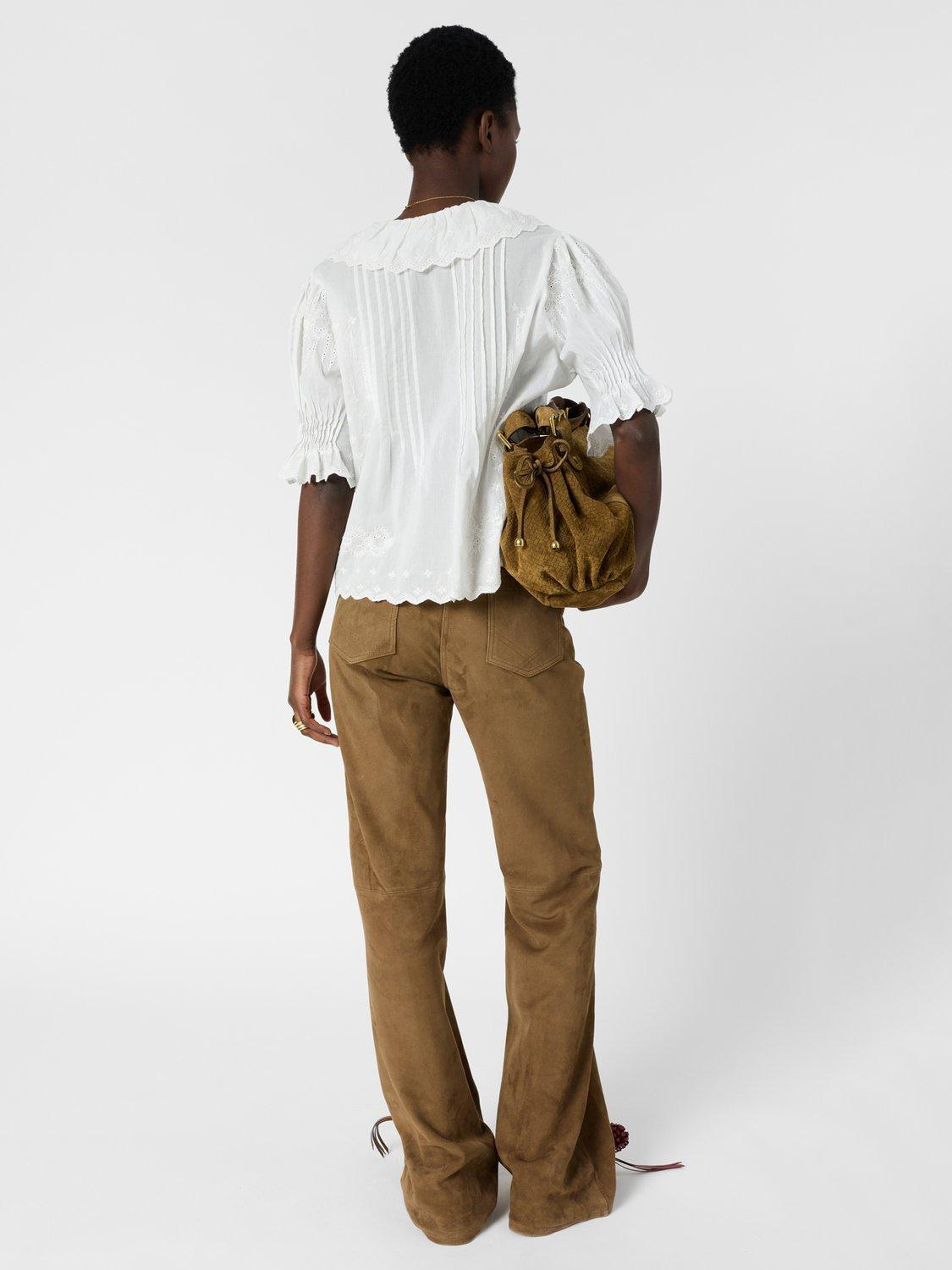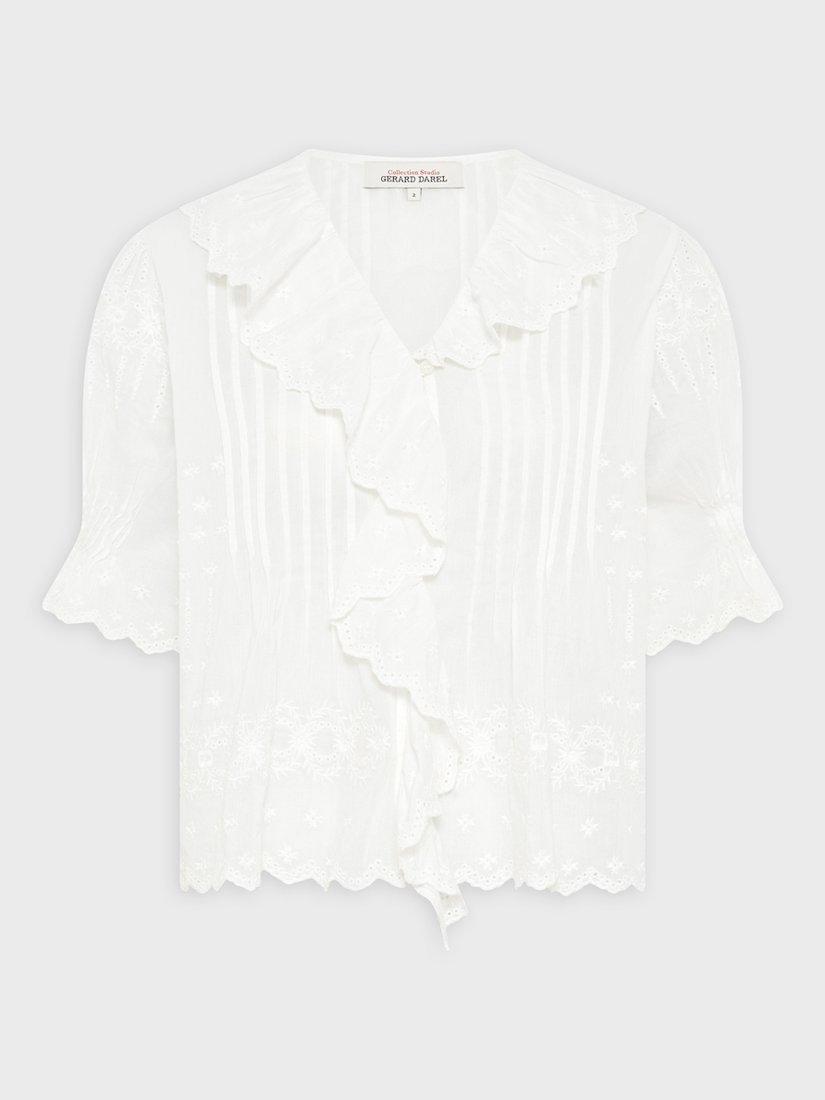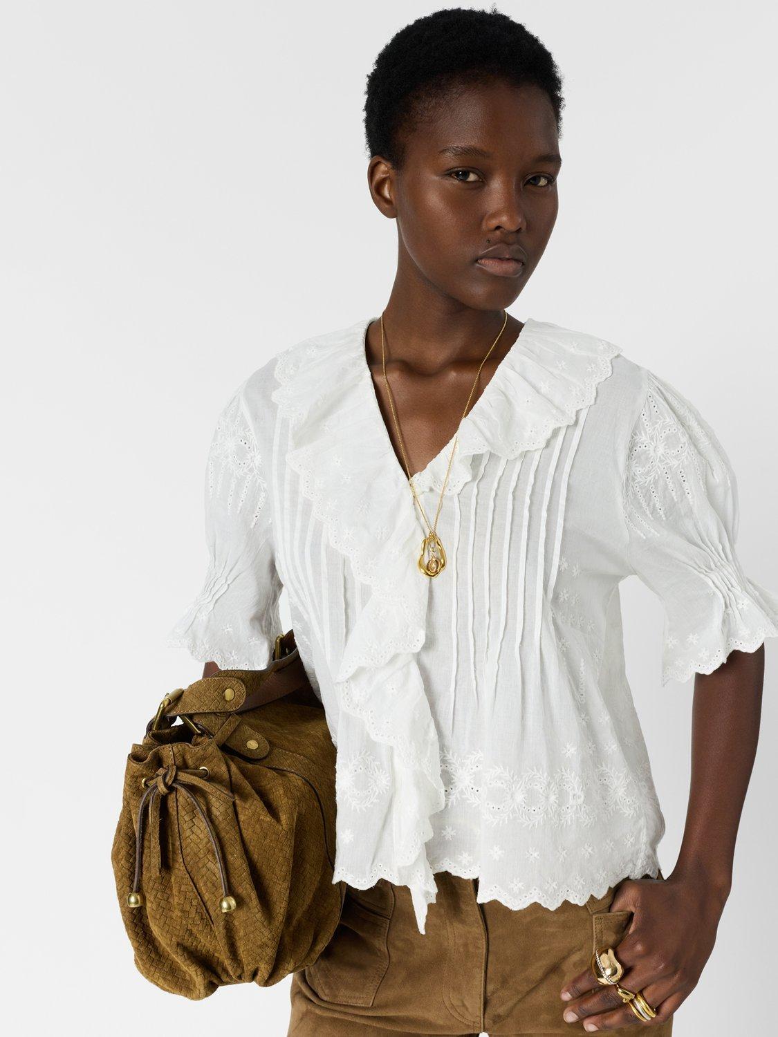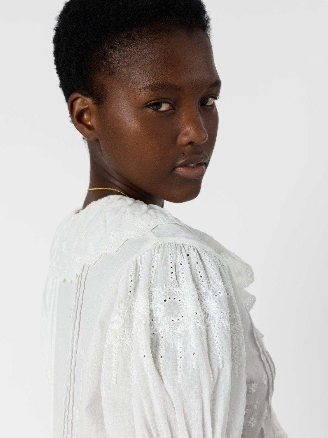 Chic blouson sleeve blouse with floral embroidery and pintuck details for a stunning daytime option.
