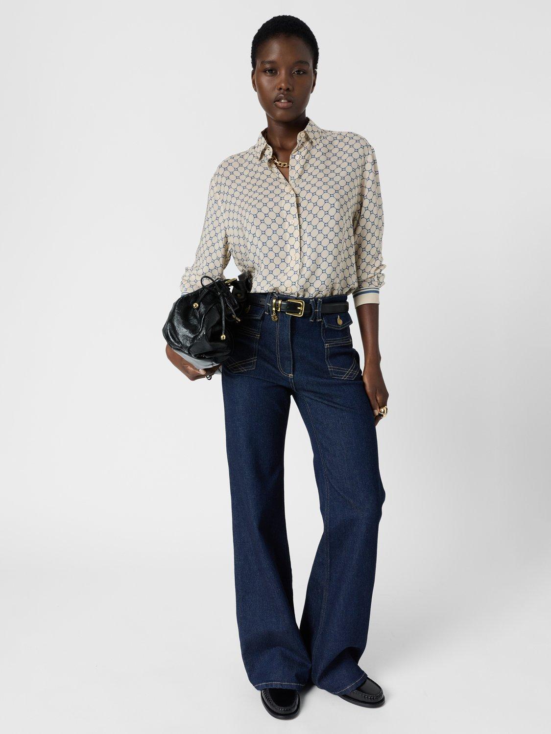 The Clariane shirt embodies classic elegance with its monogram pattern on an ecru background, both luminous and refined. Its fluid cut is emphasised by a wide plain border at the bottom of the piece and the sleeves, structuring the silhouette. It will be perfect to enhance jeans or add sophistication to a suit.