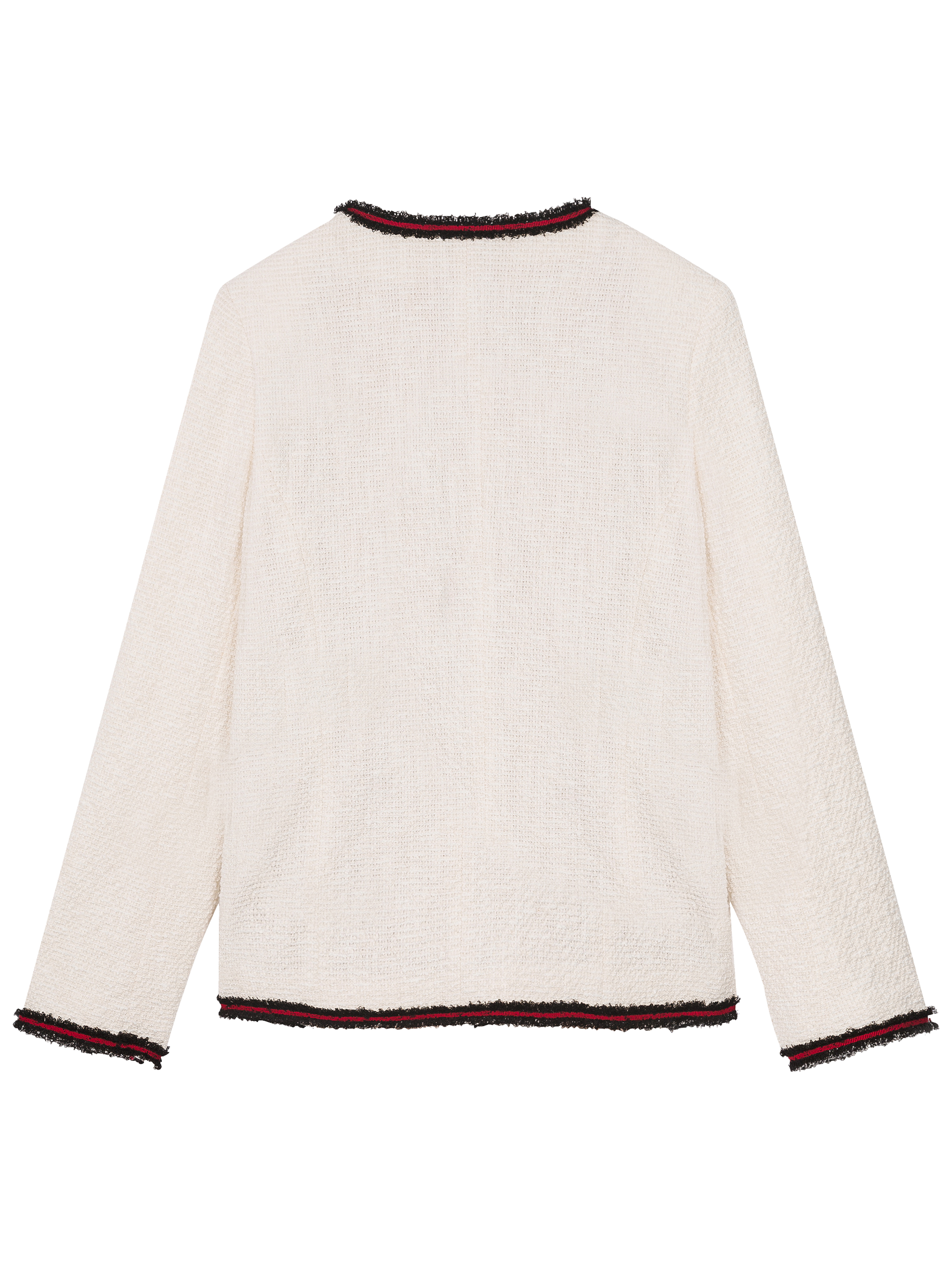 Crafted from a rich cotton blend with a touch of stretch for comfort, this piece features contrasting frayed trimming for a stand out effect, a simple round neck and long sleeves. Finished with pockets and an open front, this jacket will prove a chic layer for the transitional months.