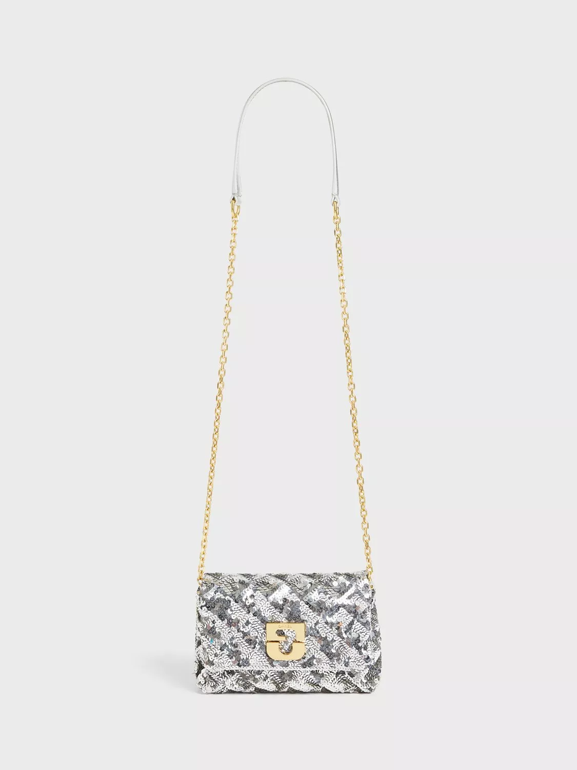 With stylistic focus on its boxy structure, this mini crossbody bag hails from Gerard Darel. Made with leather and covered in sparkling sequins, it's secured with a branded hardware flapover front.