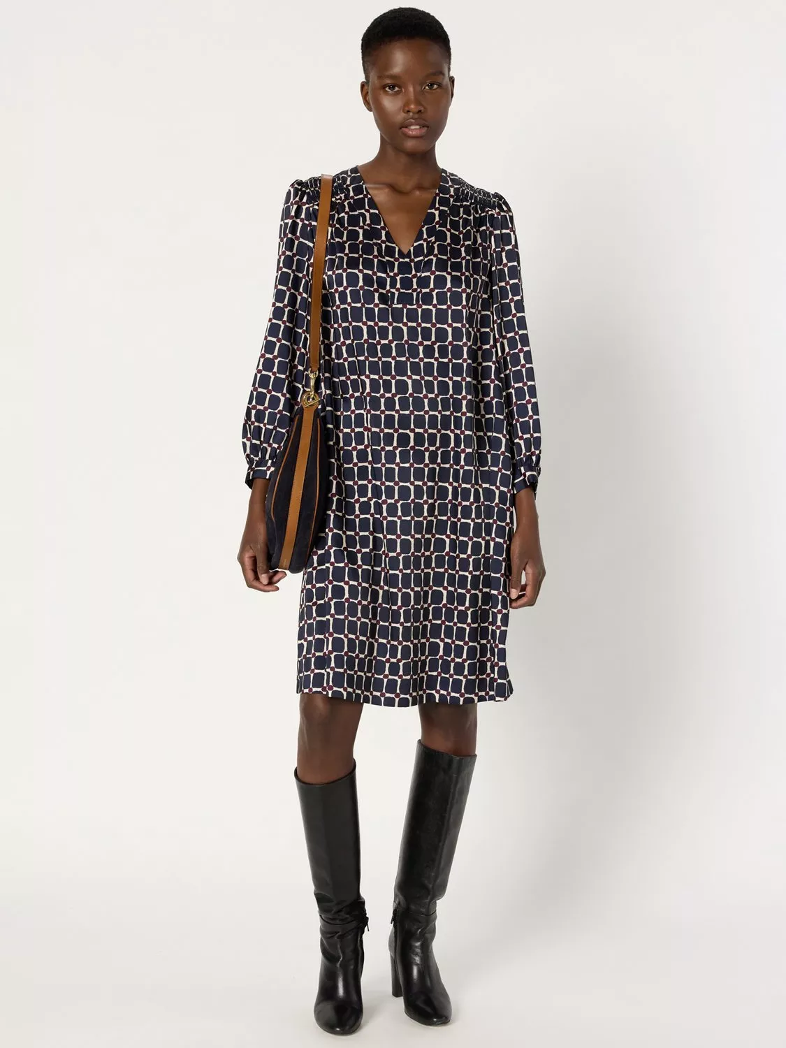 This mini dress blends a playful geometric pattern with a flattering A-line cut and V-neck.