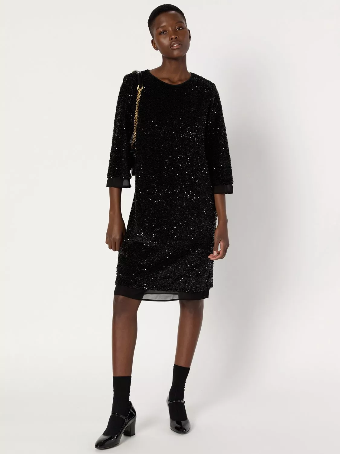Knee-length straight cut dress, featuring striking sequin embellishment, three-quarter sleeves and a round neck. The perfect party piece, pair with metallic accessories.