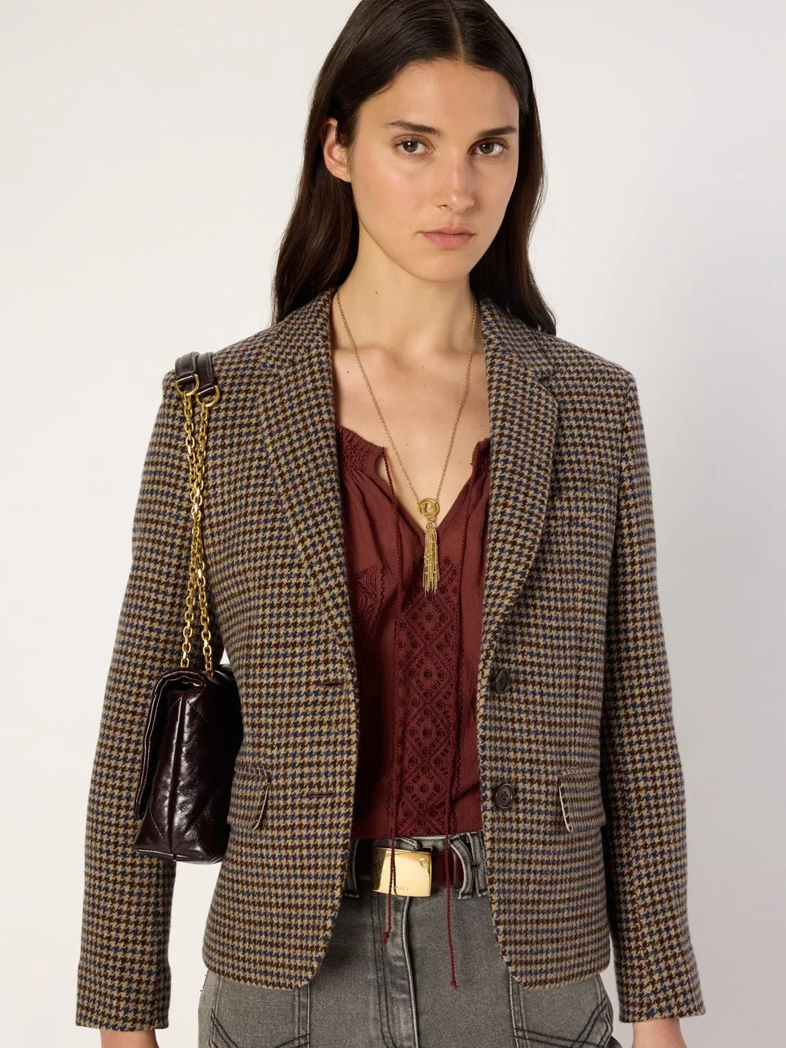 A Gerard Darel blazer - crafted from pure wool with a sharp check and dogtooth pattern. Its tailored fit and button fastening offer smart comfort for everyday moments - whether you're dressing up or keeping things easy.